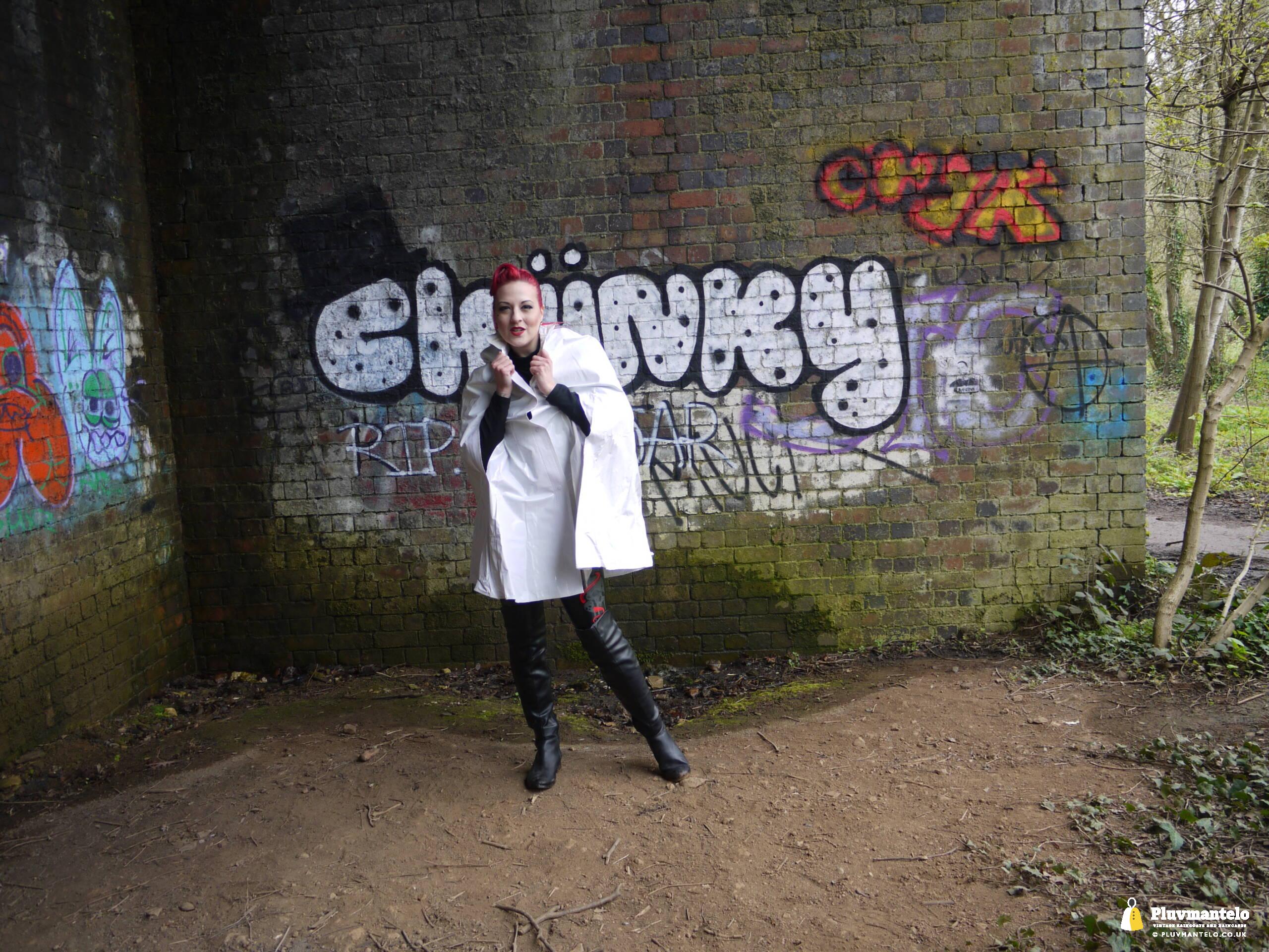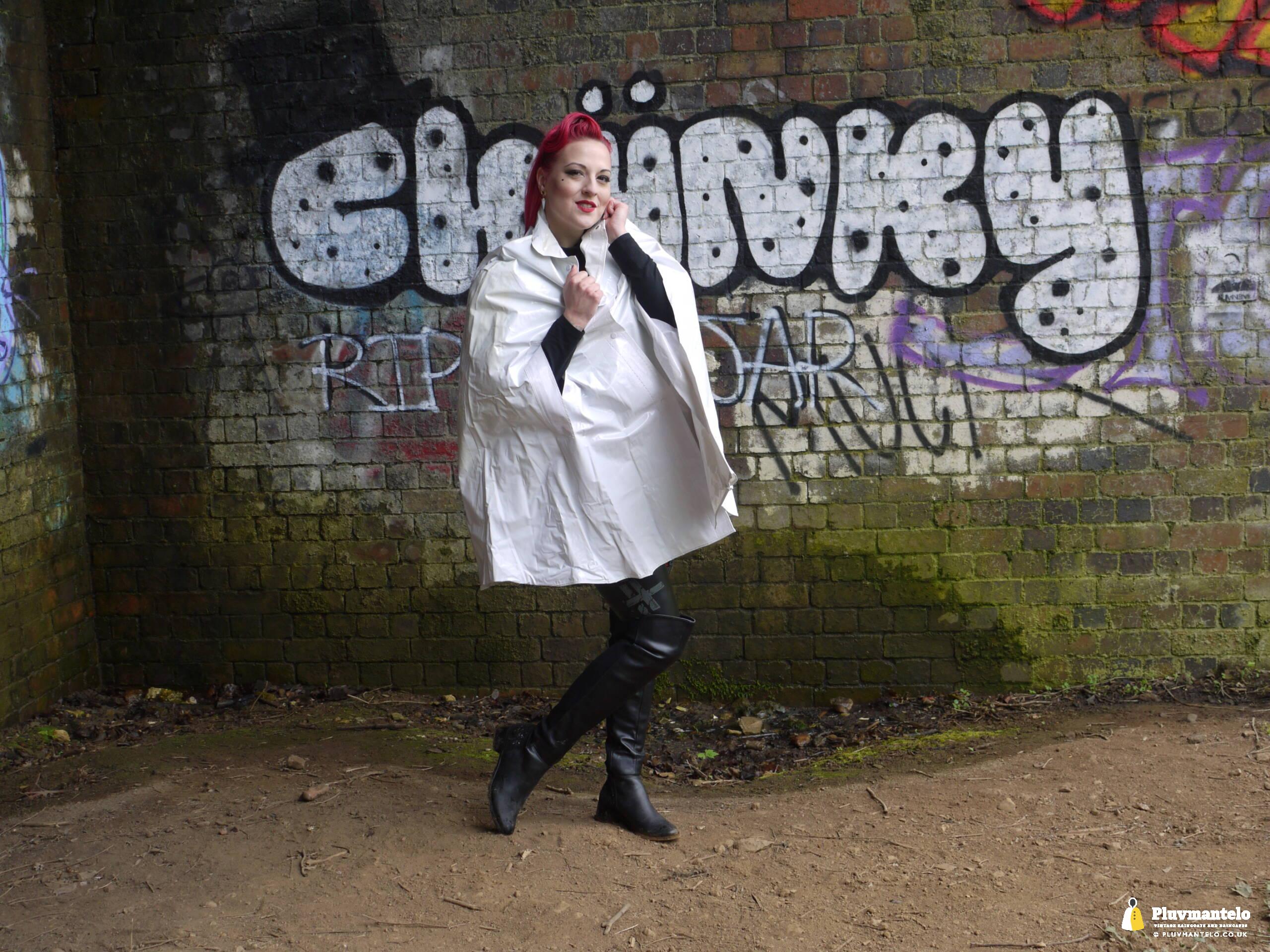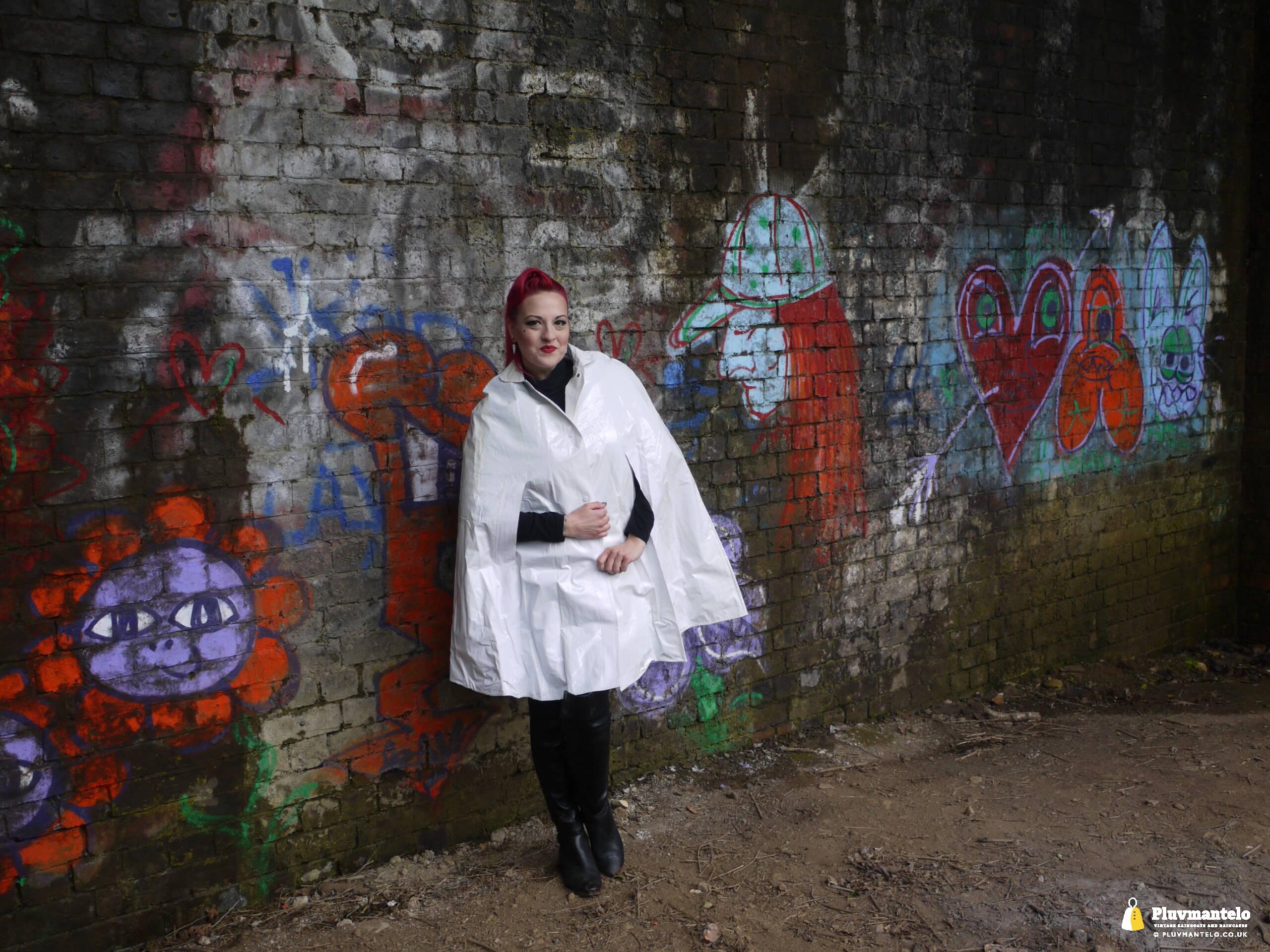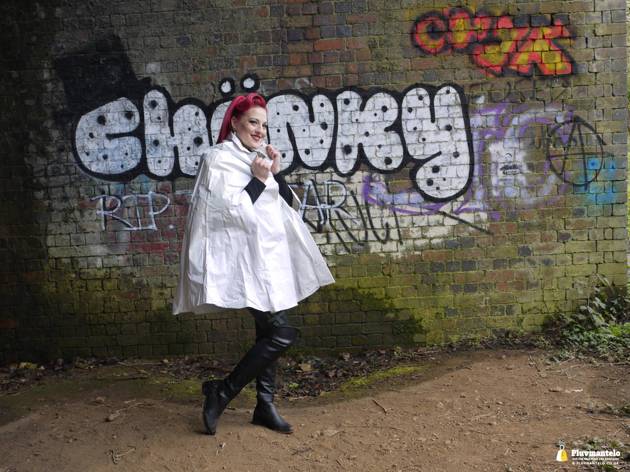 Let’s face it, you don’t see a white raincape all that often: green, yellow and red, yes, but white ones are very few and far between. So let’s redress the balance with The Capeatrix wearing a 1970s pvc example.