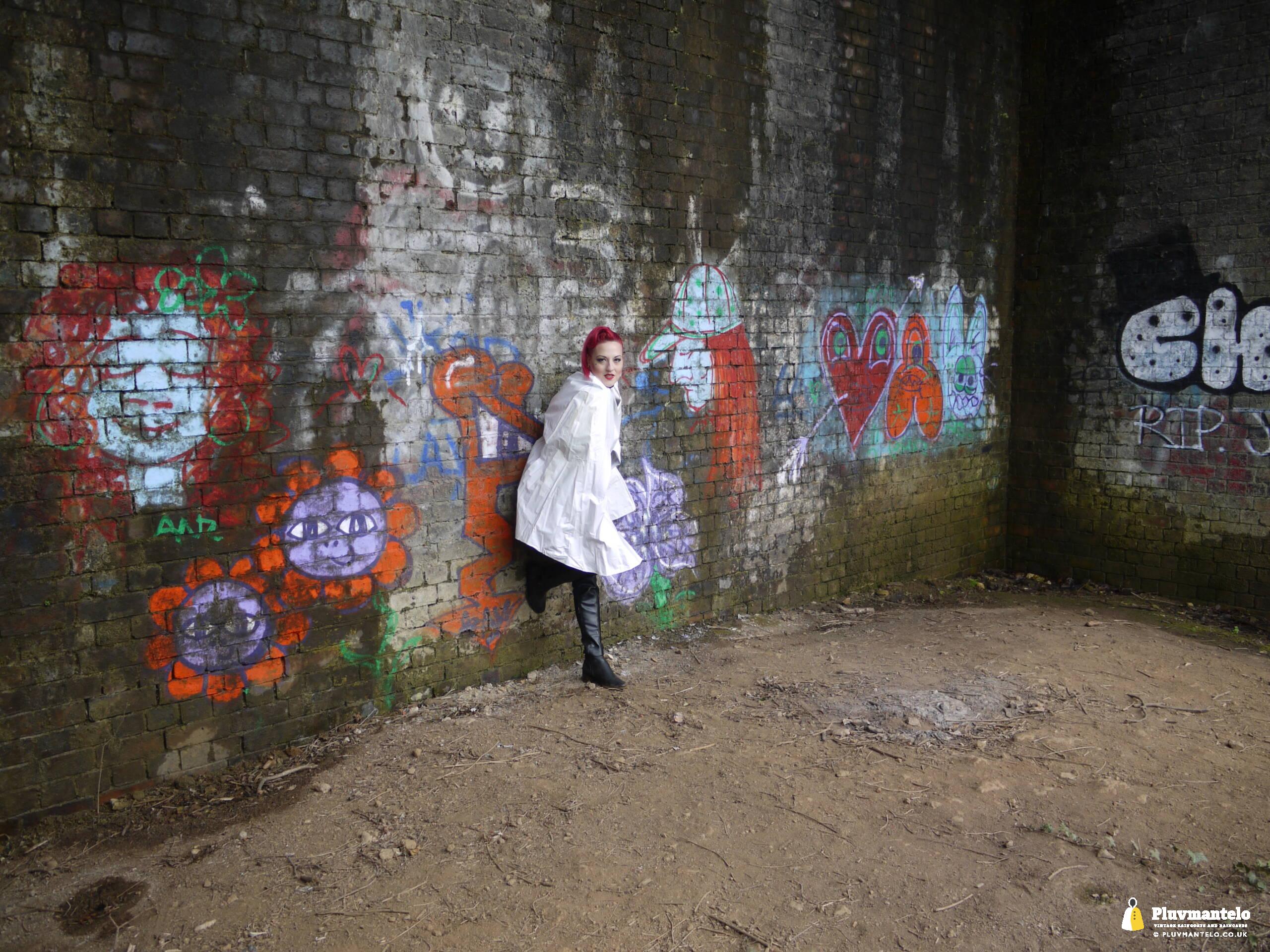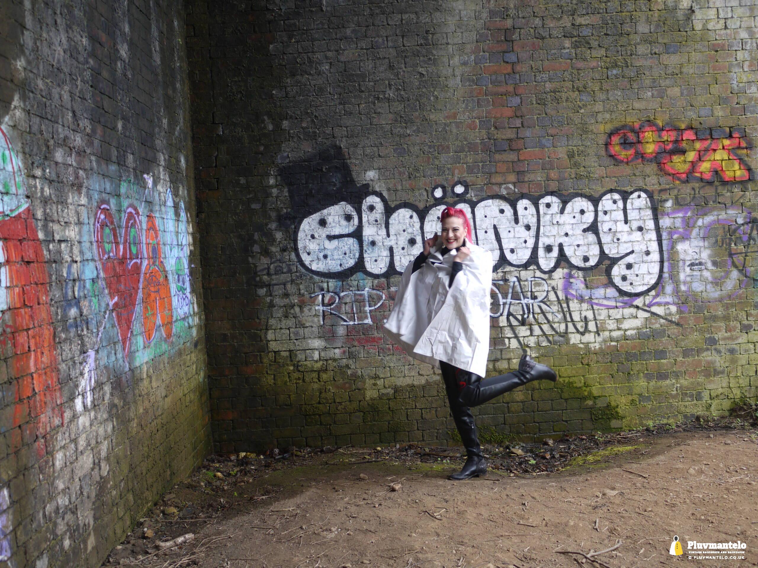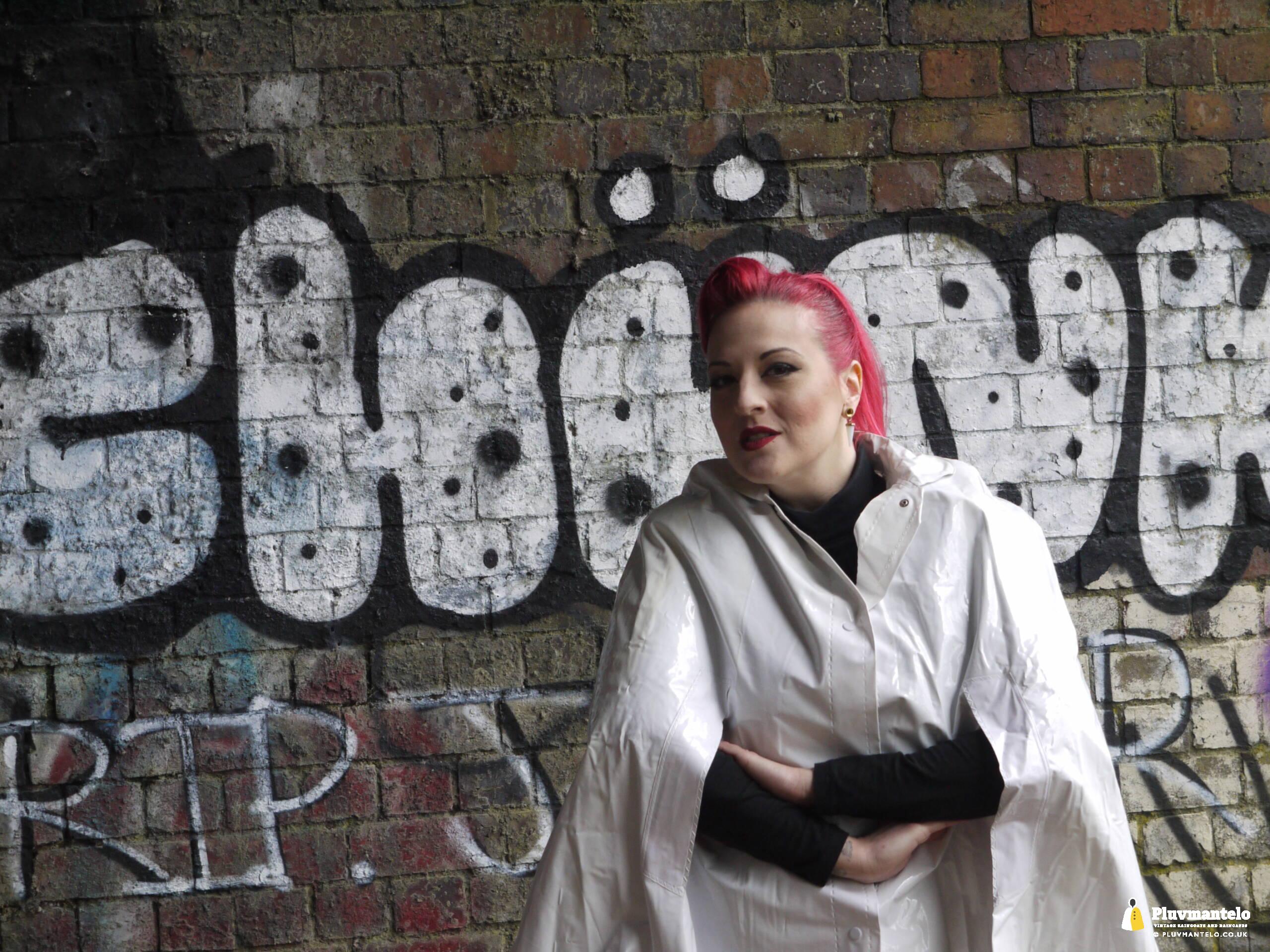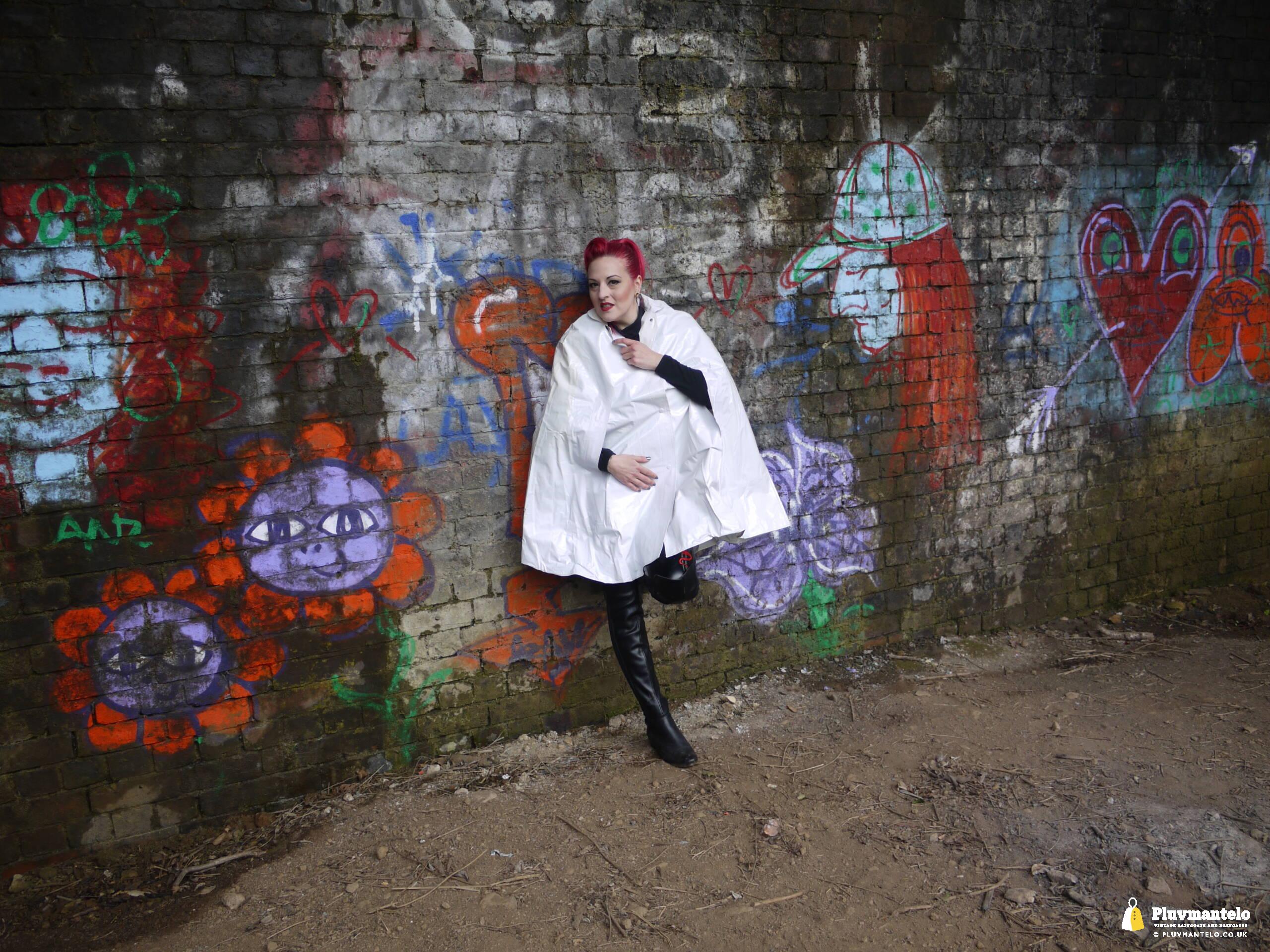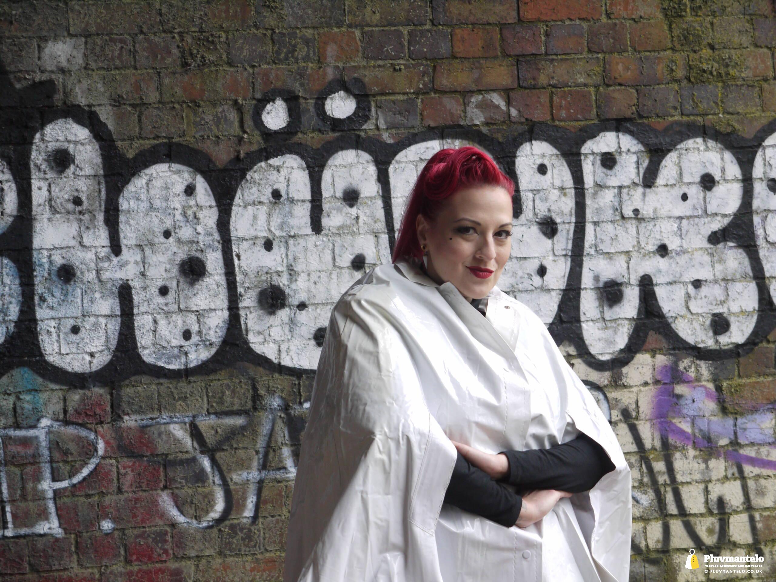 Let’s face it, you don’t see a white raincape all that often: green, yellow and red, yes, but white ones are very few and far between. So let’s redress the balance with The Capeatrix wearing a 1970s pvc example.