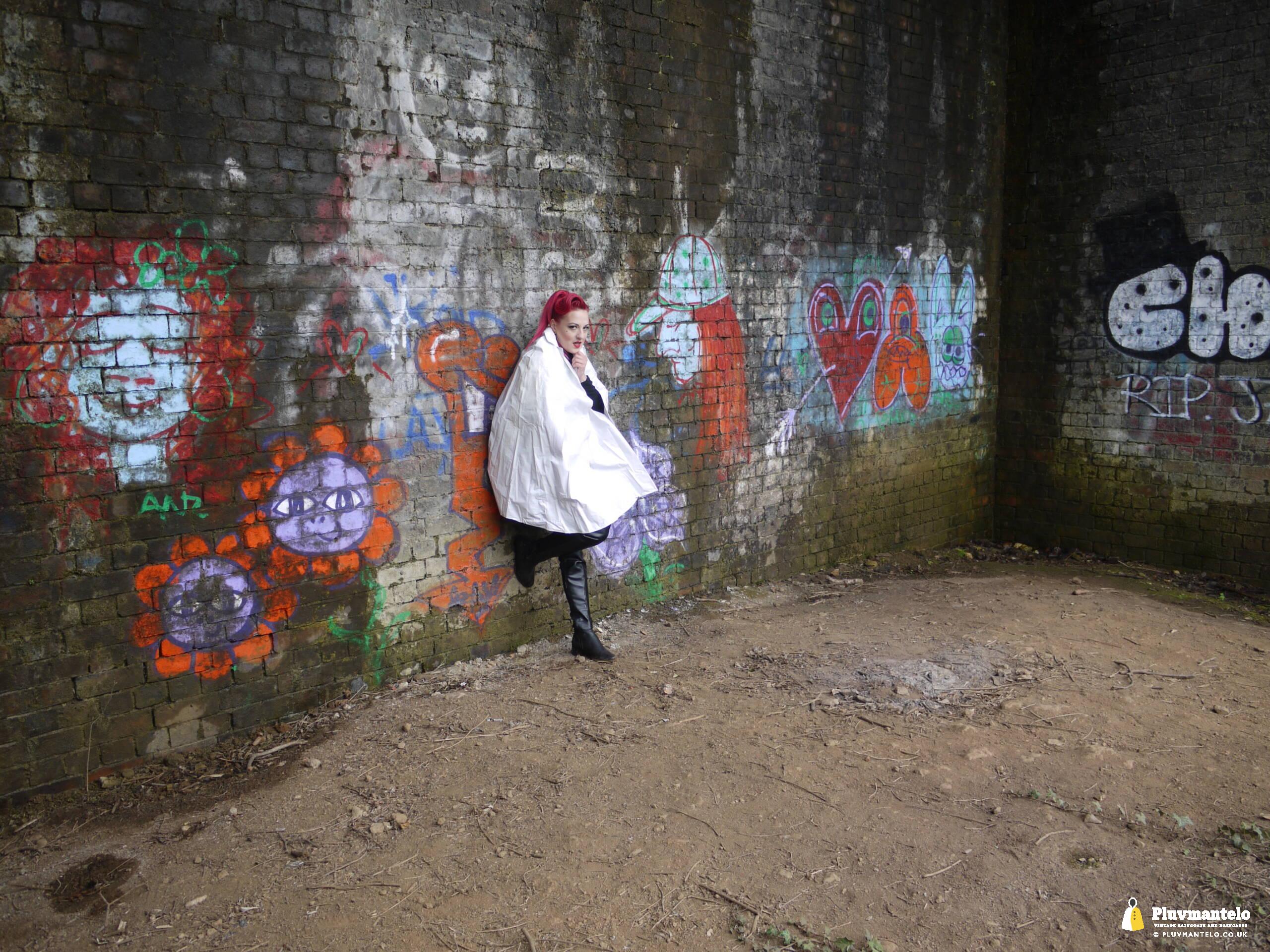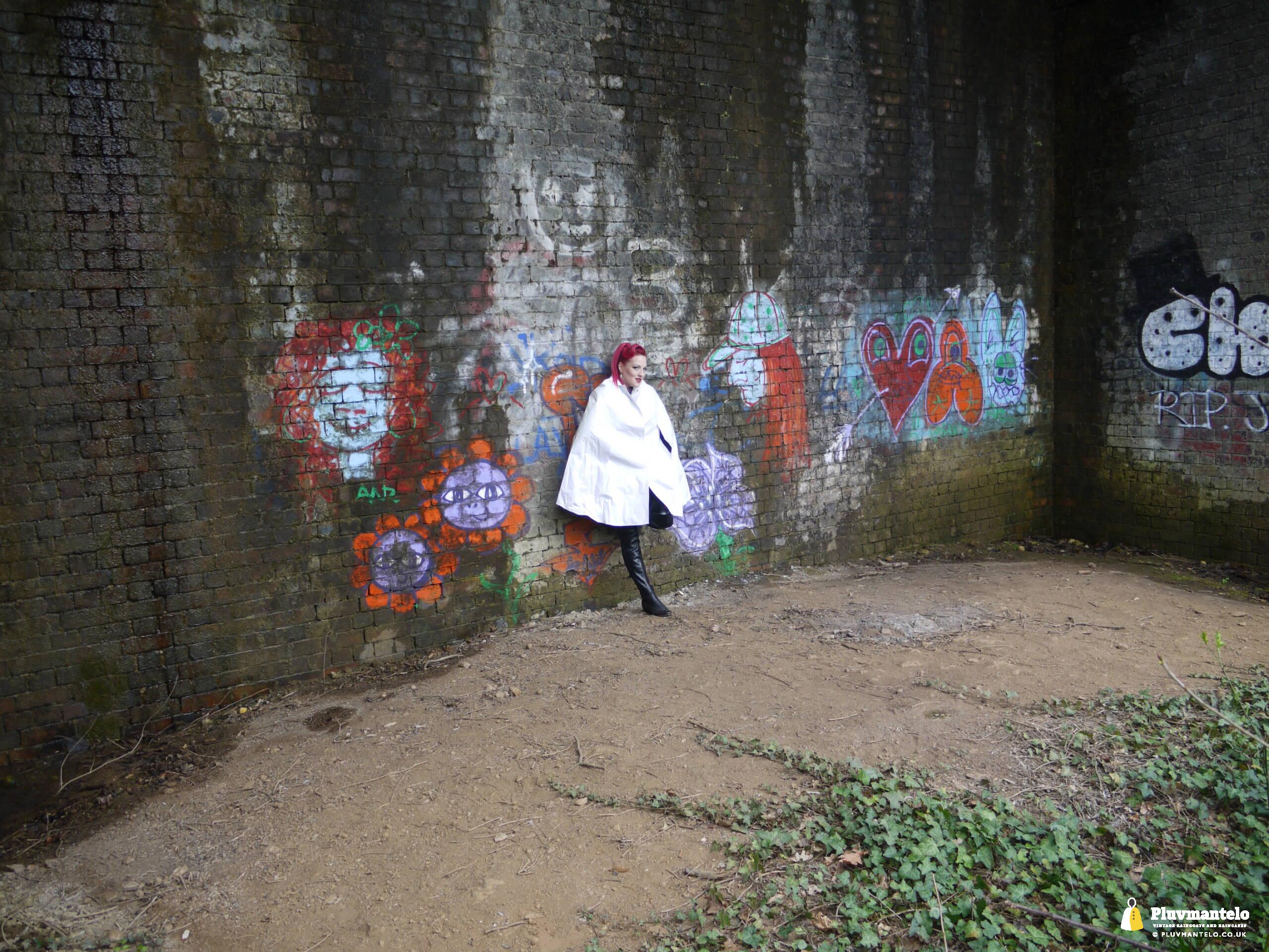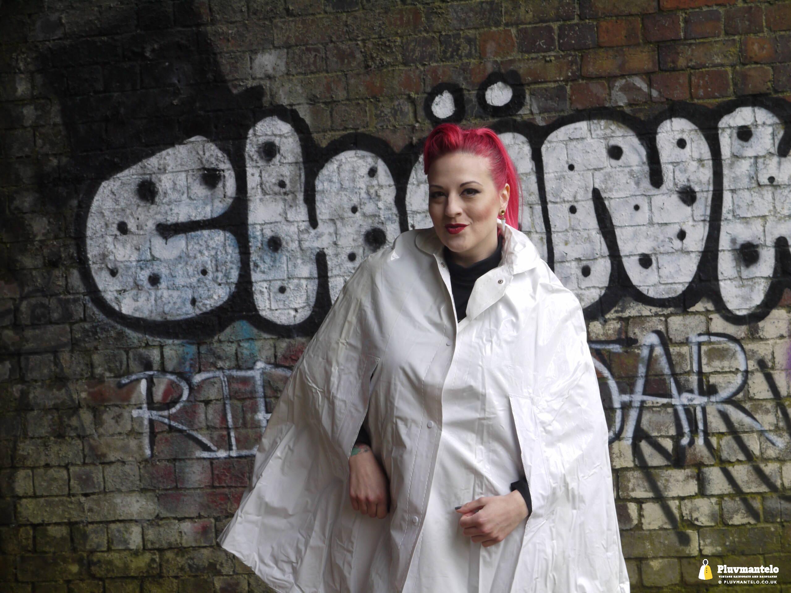 Let’s face it, you don’t see a white raincape all that often: green, yellow and red, yes, but white ones are very few and far between. So let’s redress the balance with The Capeatrix wearing a 1970s pvc example.