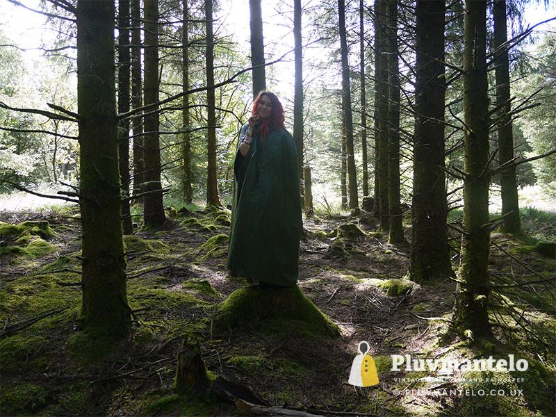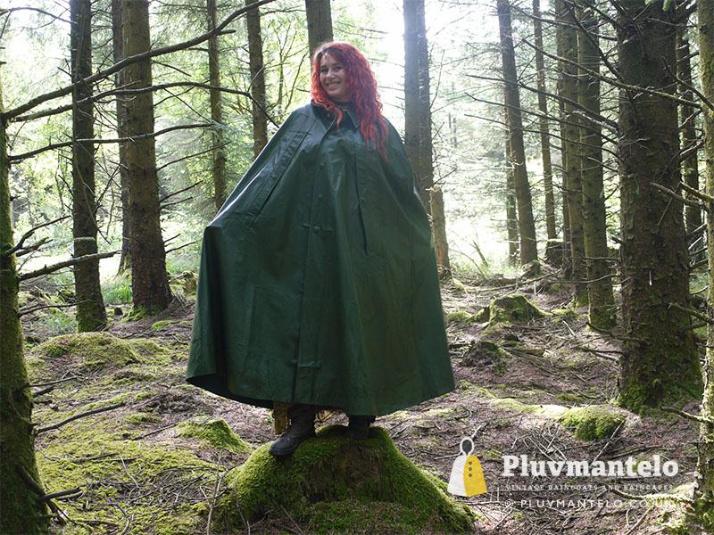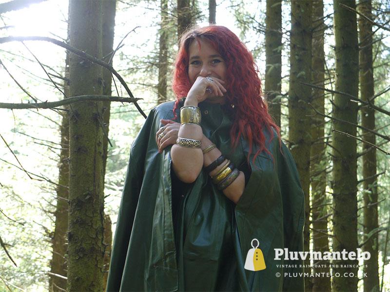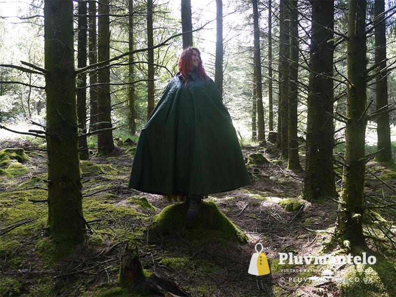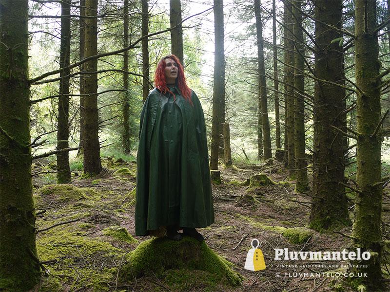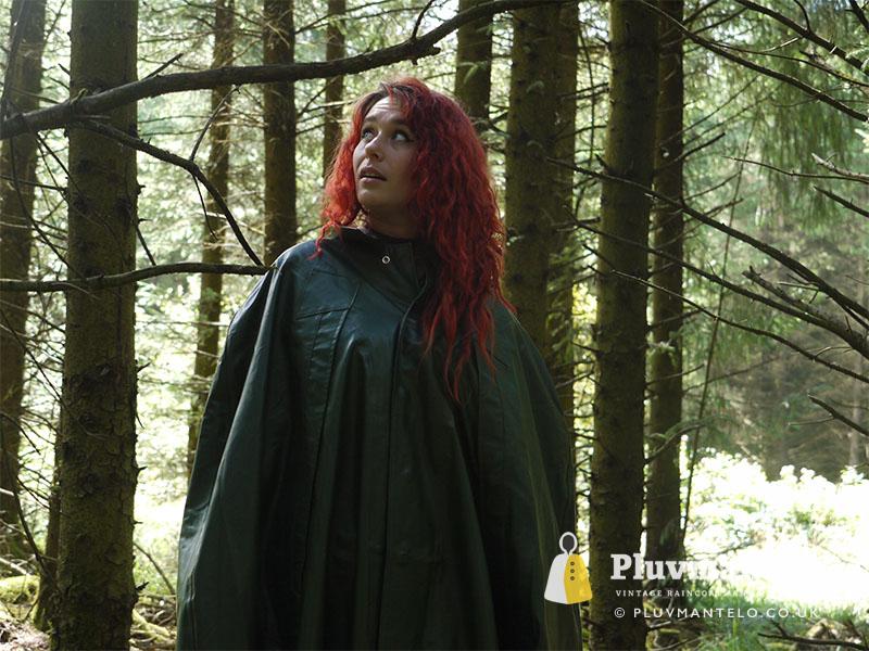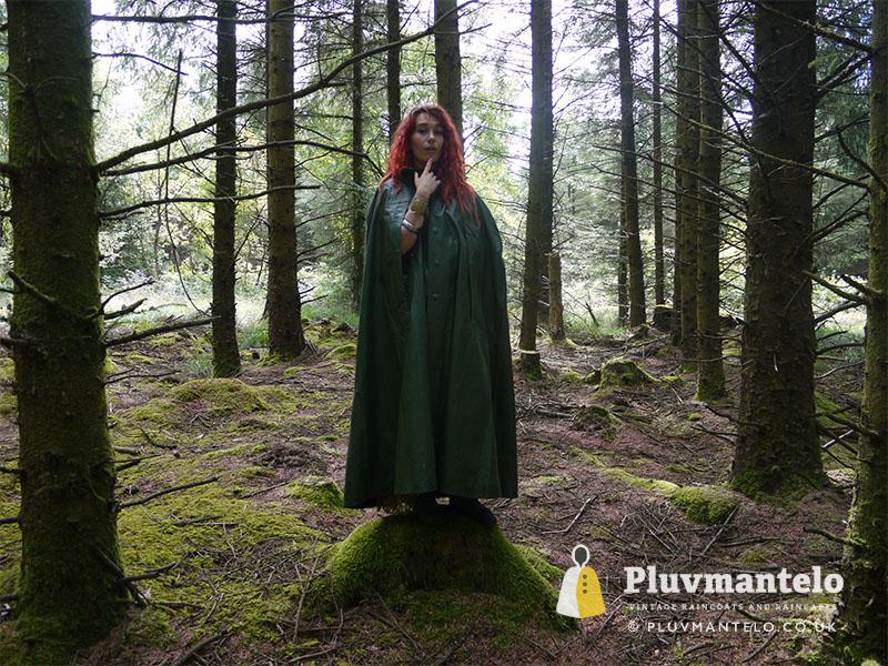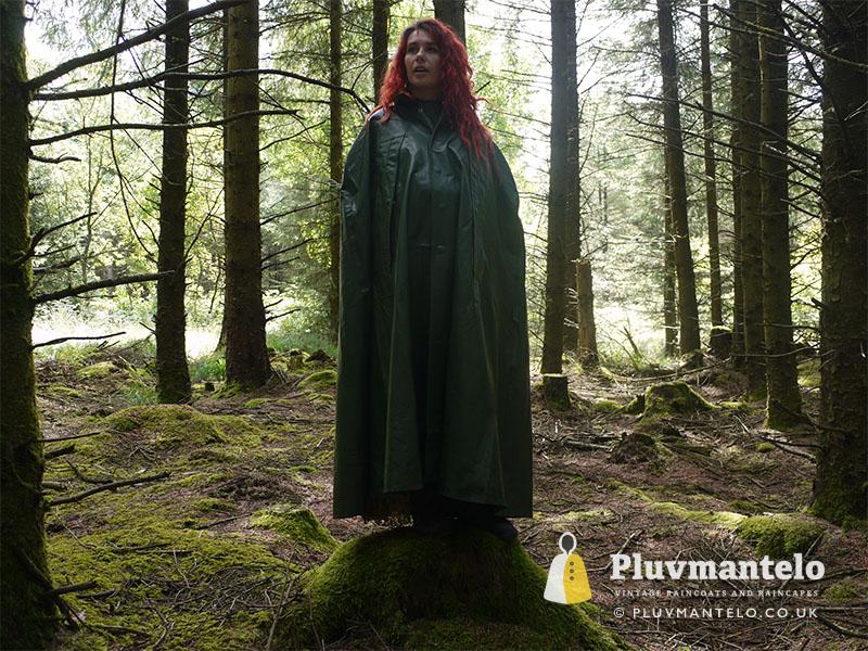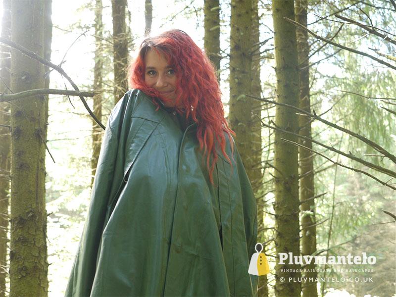 Here you see Feraline in the biggest – no, make that BIGGEST – cape in the Pluvmantelo collection. It’s a police cape from German (West Germany we believe) which is not only generously-proportioned, it’s heavy too.