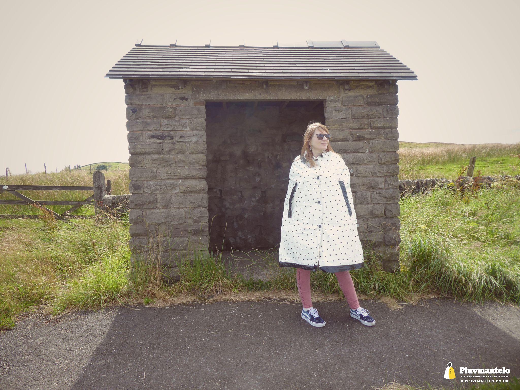 Anyway, here’s Clair in her recently-bought early-1970s black and white cape, which joins her collection of genuine old-school spotted pvc capes – we hope you like the images.