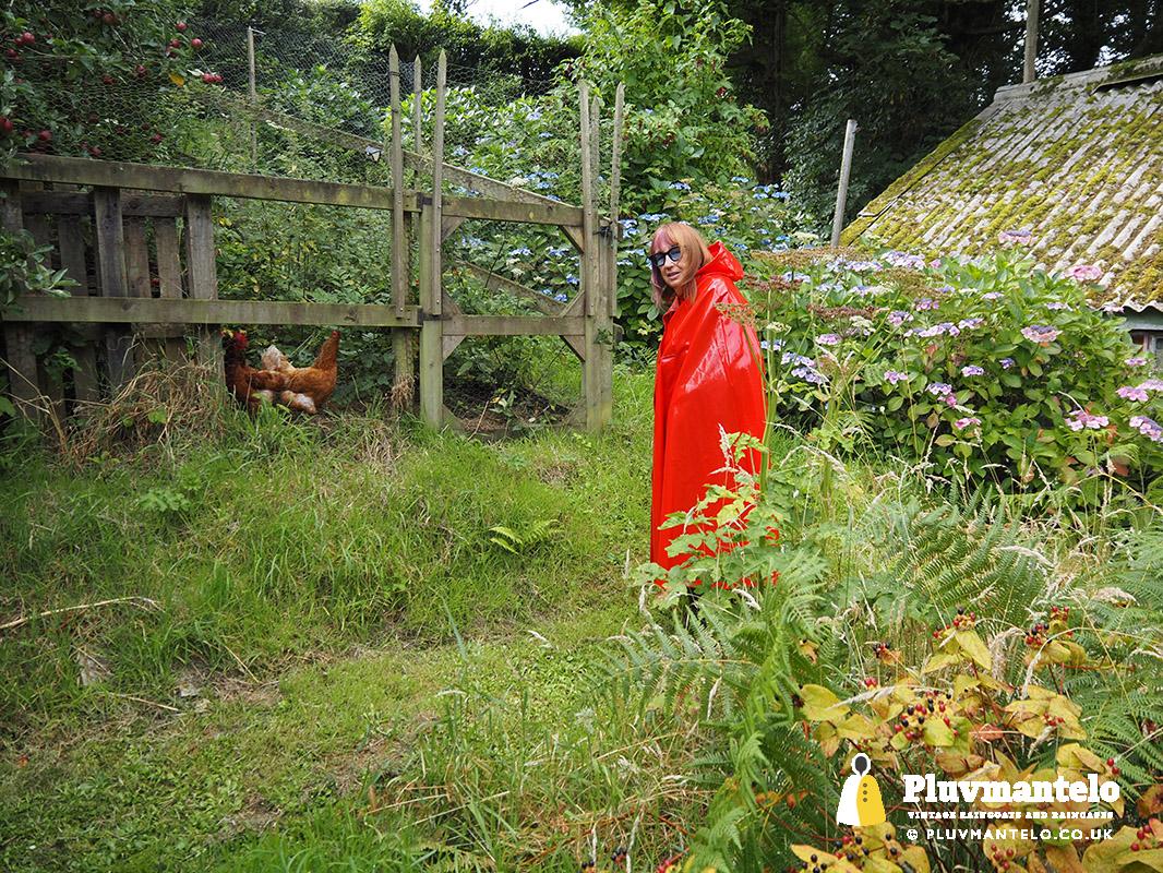 Whatever the time of year Miss Pluv’ will always have gardening jobs to tackle and this time rain was threatened. No excuses, she went into the hallway and picked up her red Bormax cape – after all, why should the bad weather stop her getting on with those jobs that simply have to be done? As you see, the grey clouds soon passed, it didn’t rain, but Miss Pluv’ stayed nicely protected by her shiny red Bormax cape…