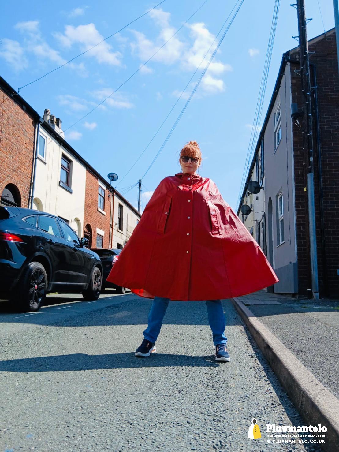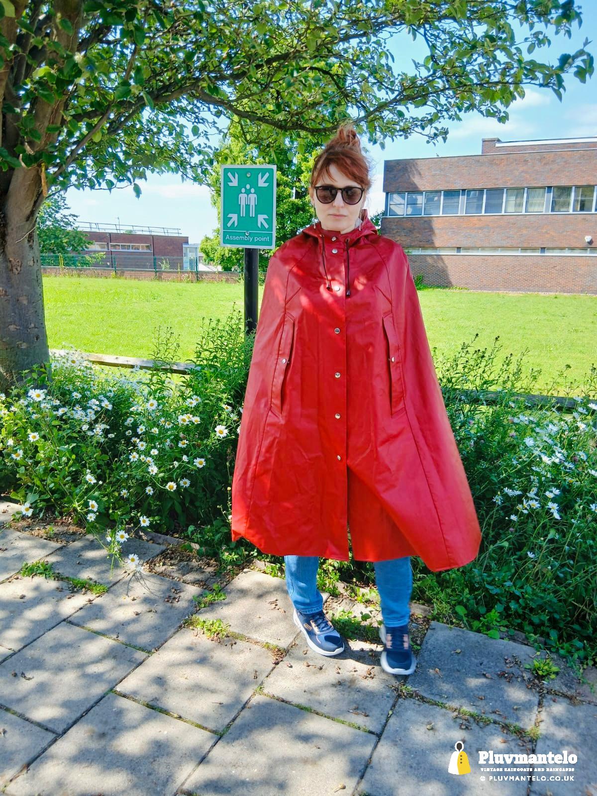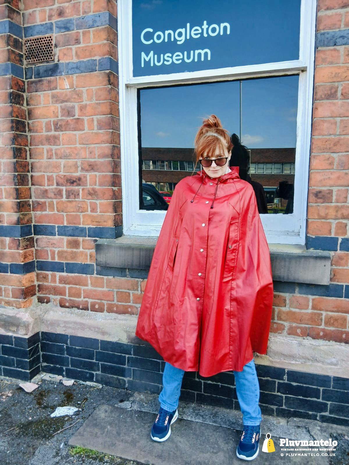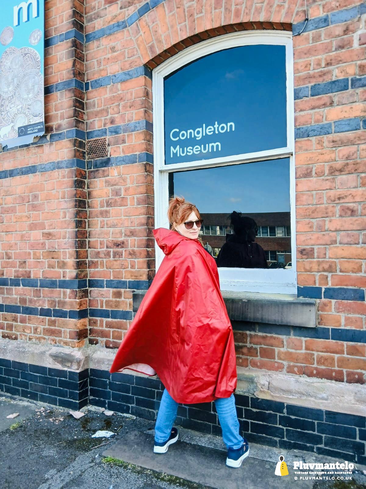 Sunny, yes: but is that any reason not to be wearing a cape? Clair The Cape Queen needs no downpour-induced excuse to get caped and on a bright sunny day her longer Rukka cape really looked the part as she swished through the streets of Congleton, enjoying the enclosed aura her cape provided.