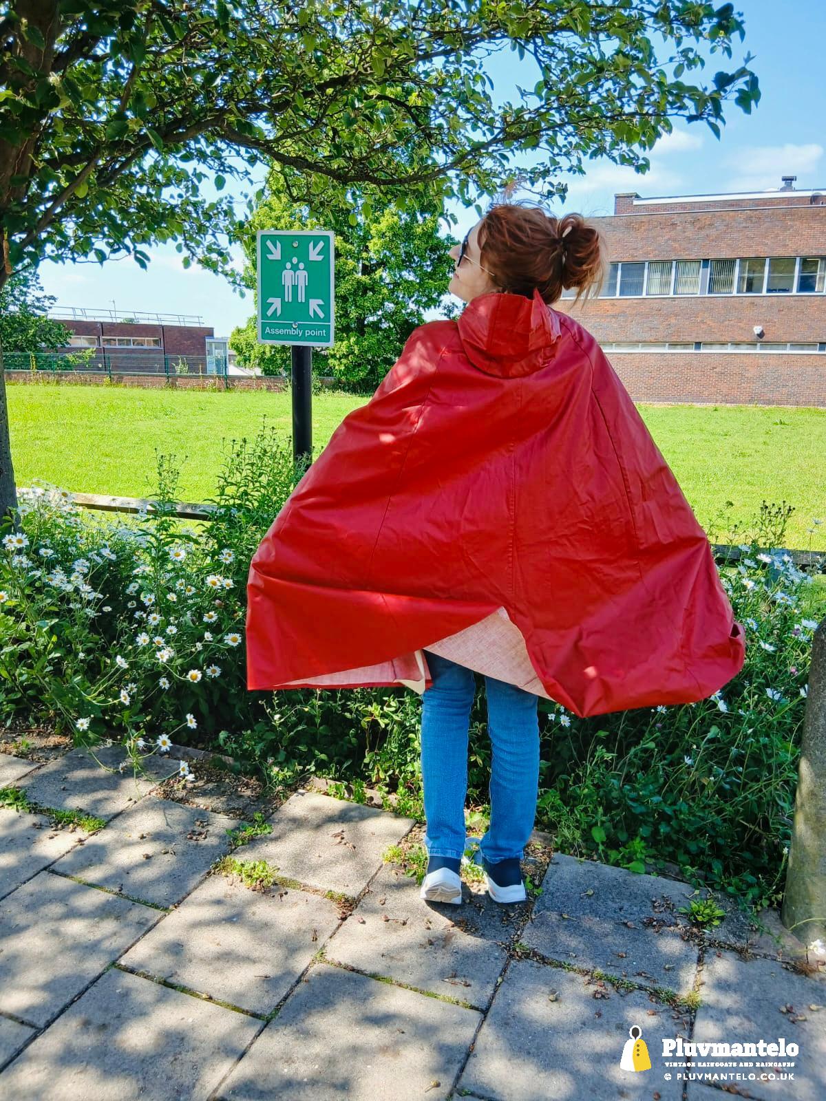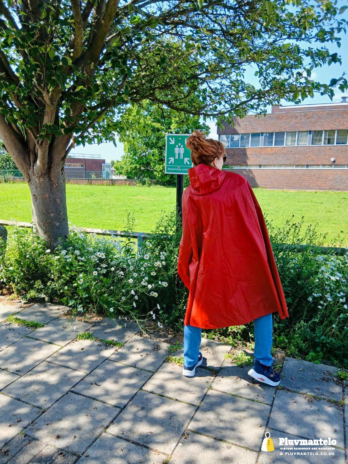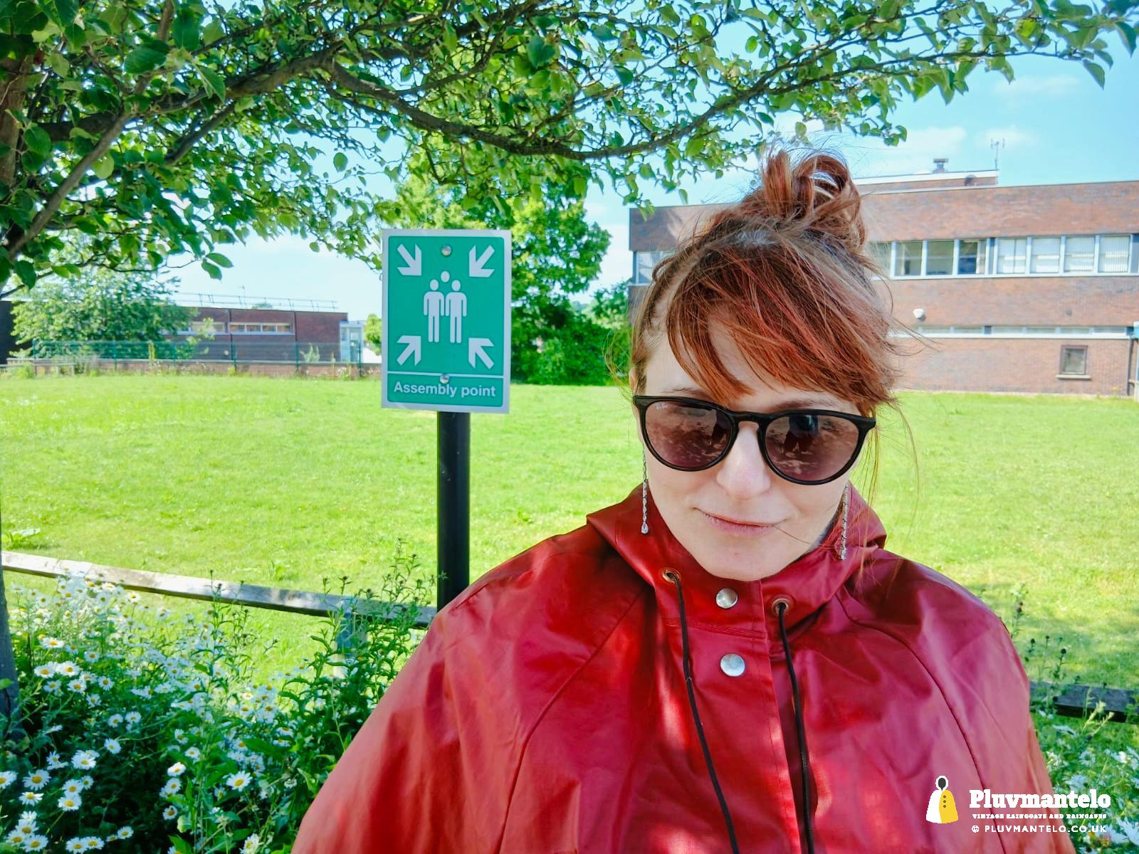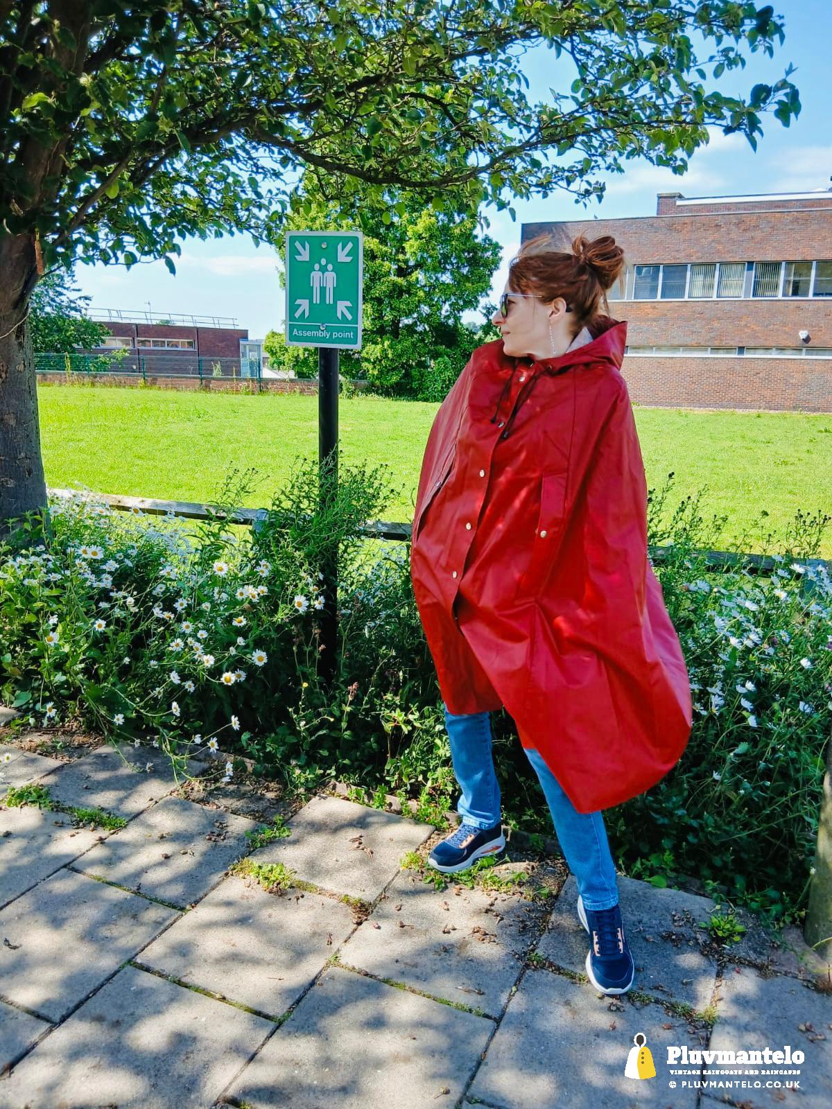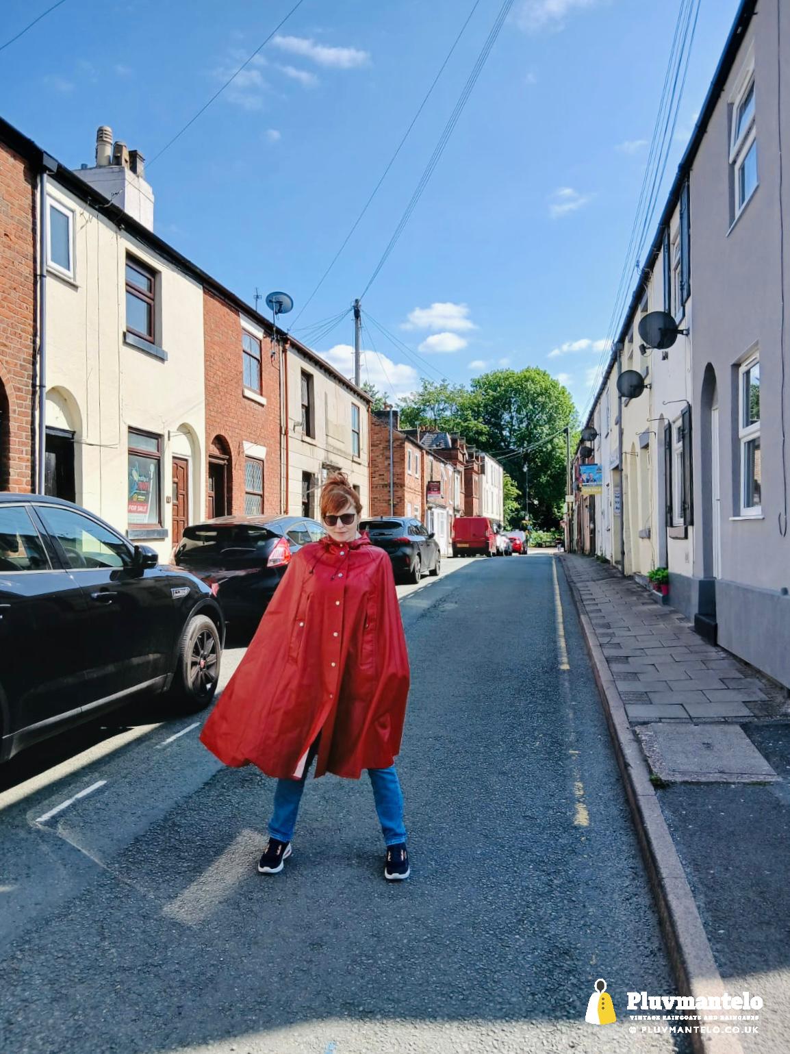 Sunny, yes: but is that any reason not to be wearing a cape? Clair The Cape Queen needs no downpour-induced excuse to get caped and on a bright sunny day her longer Rukka cape really looked the part as she swished through the streets of Congleton, enjoying the enclosed aura her cape provided.