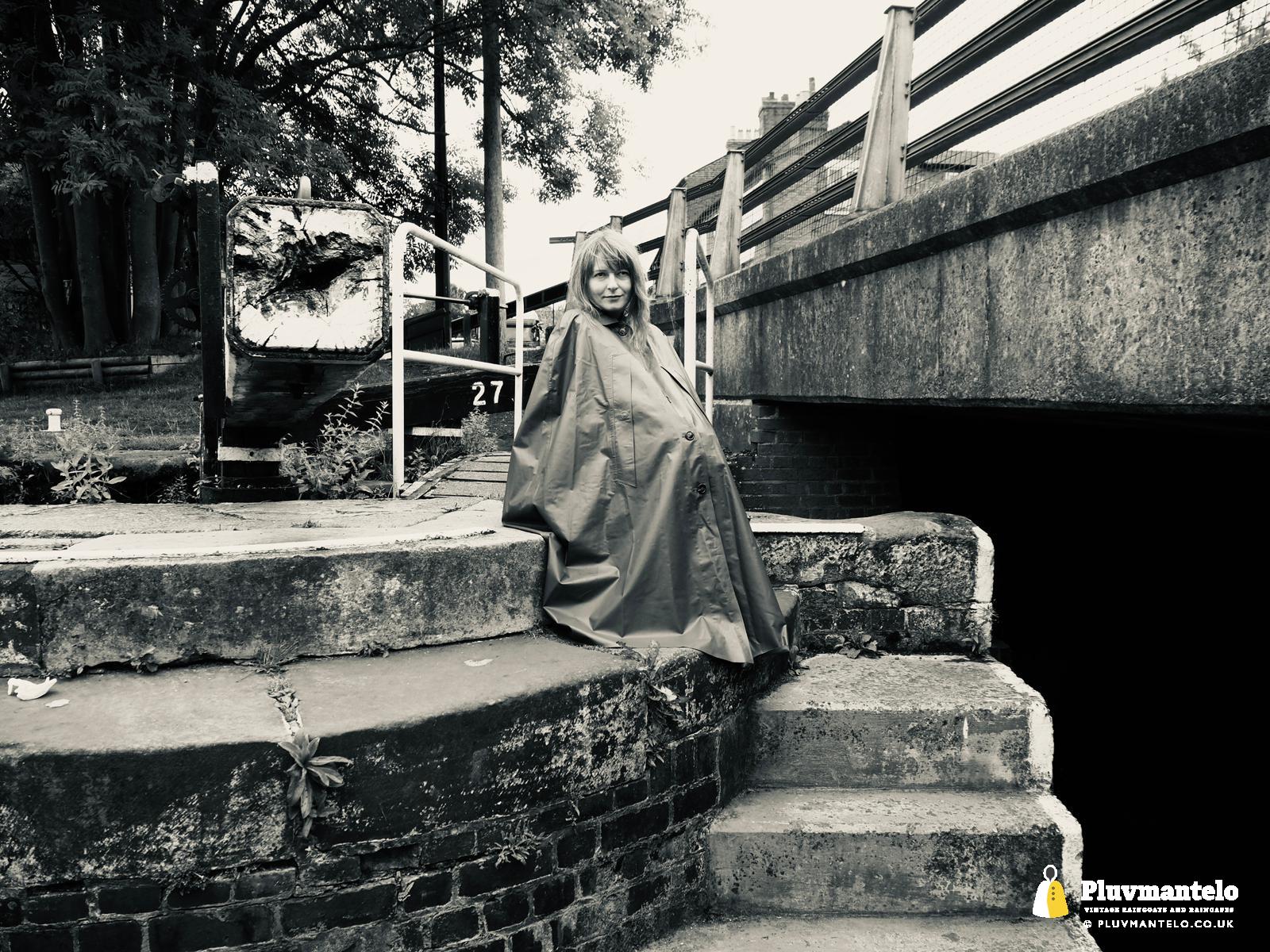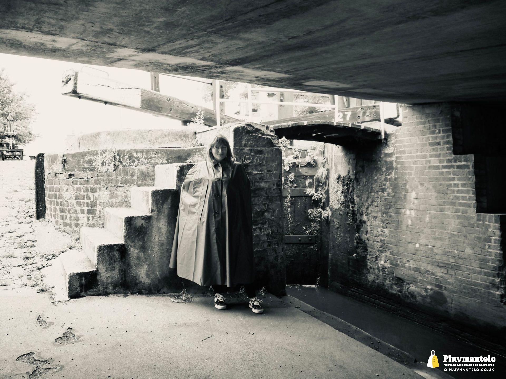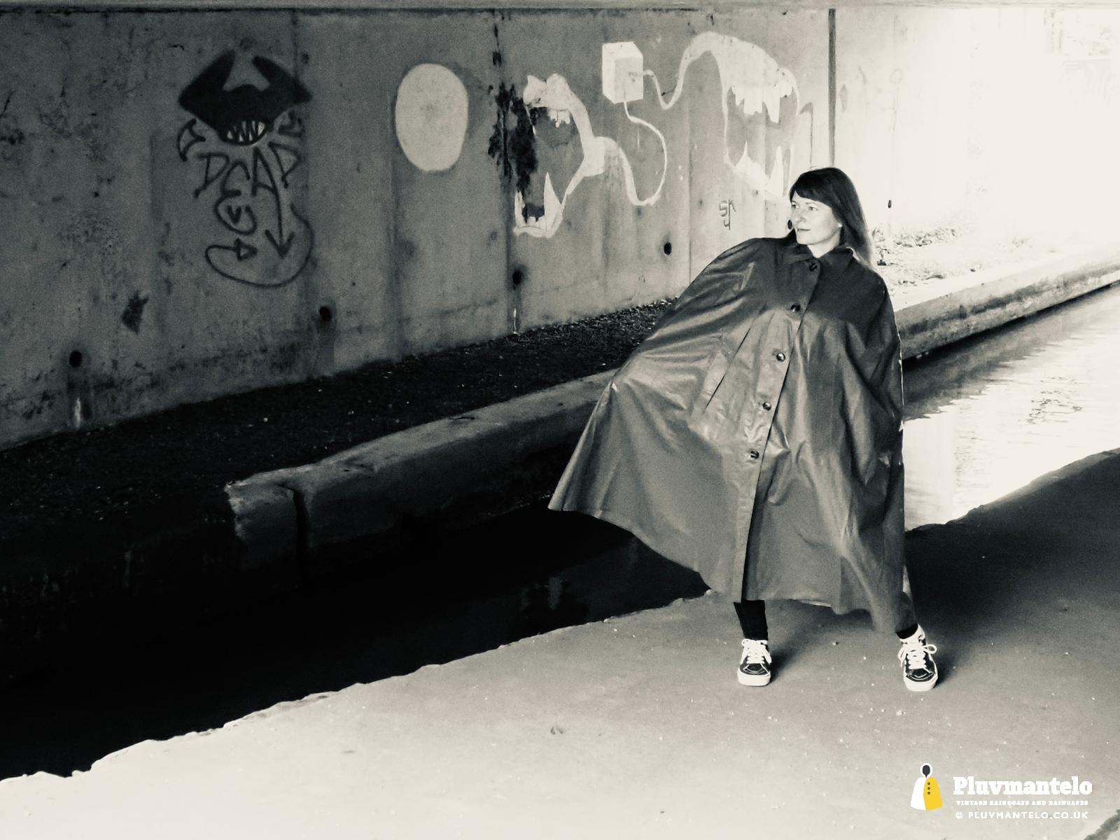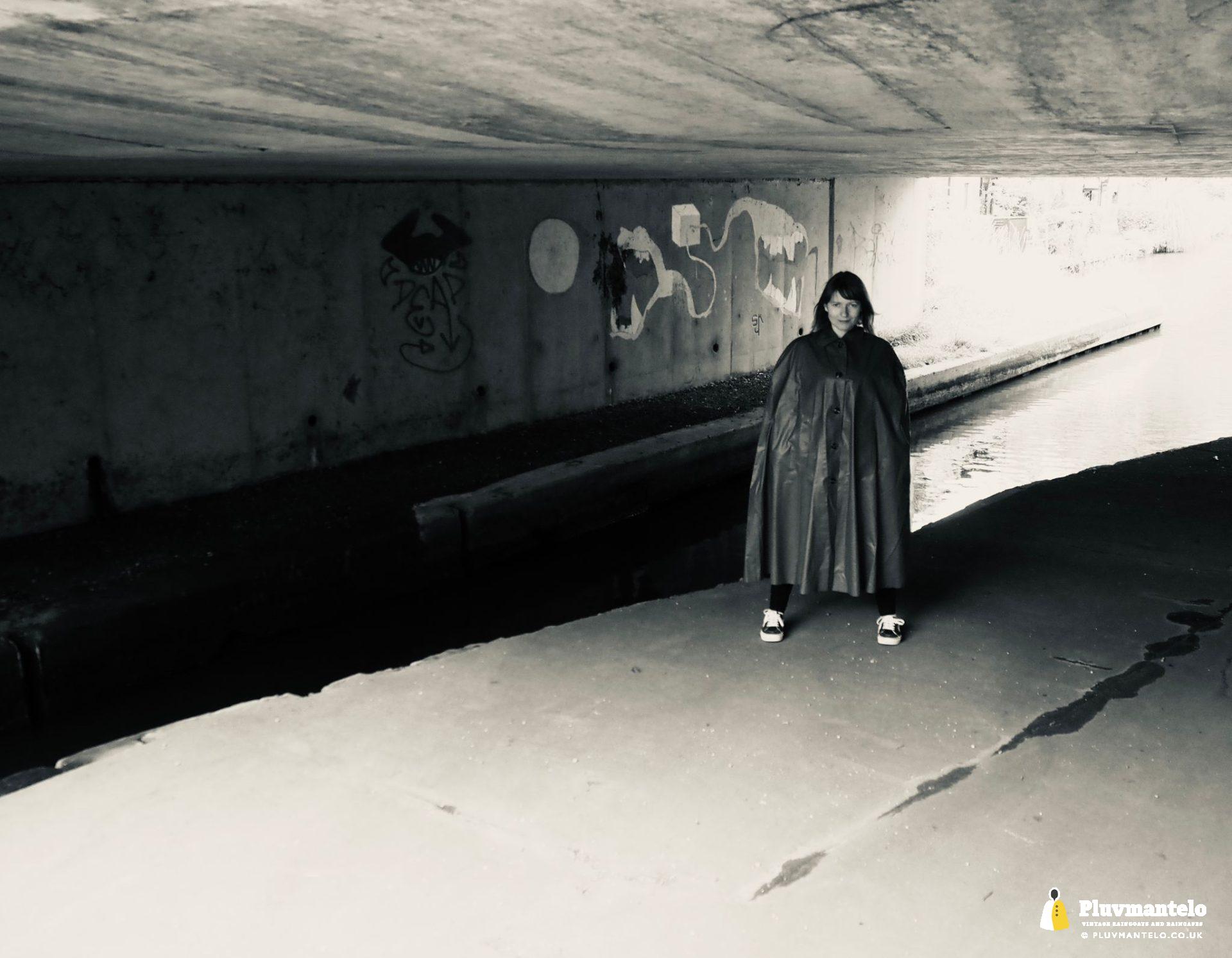 And while she was in Stone she took a walk by the canal in her Klepper cape, which is one of her most-liked capes. But who would realise it could look so good in black and white? There’s a true noir edge here and it’s one we really like, especially in the graffitied underpass.