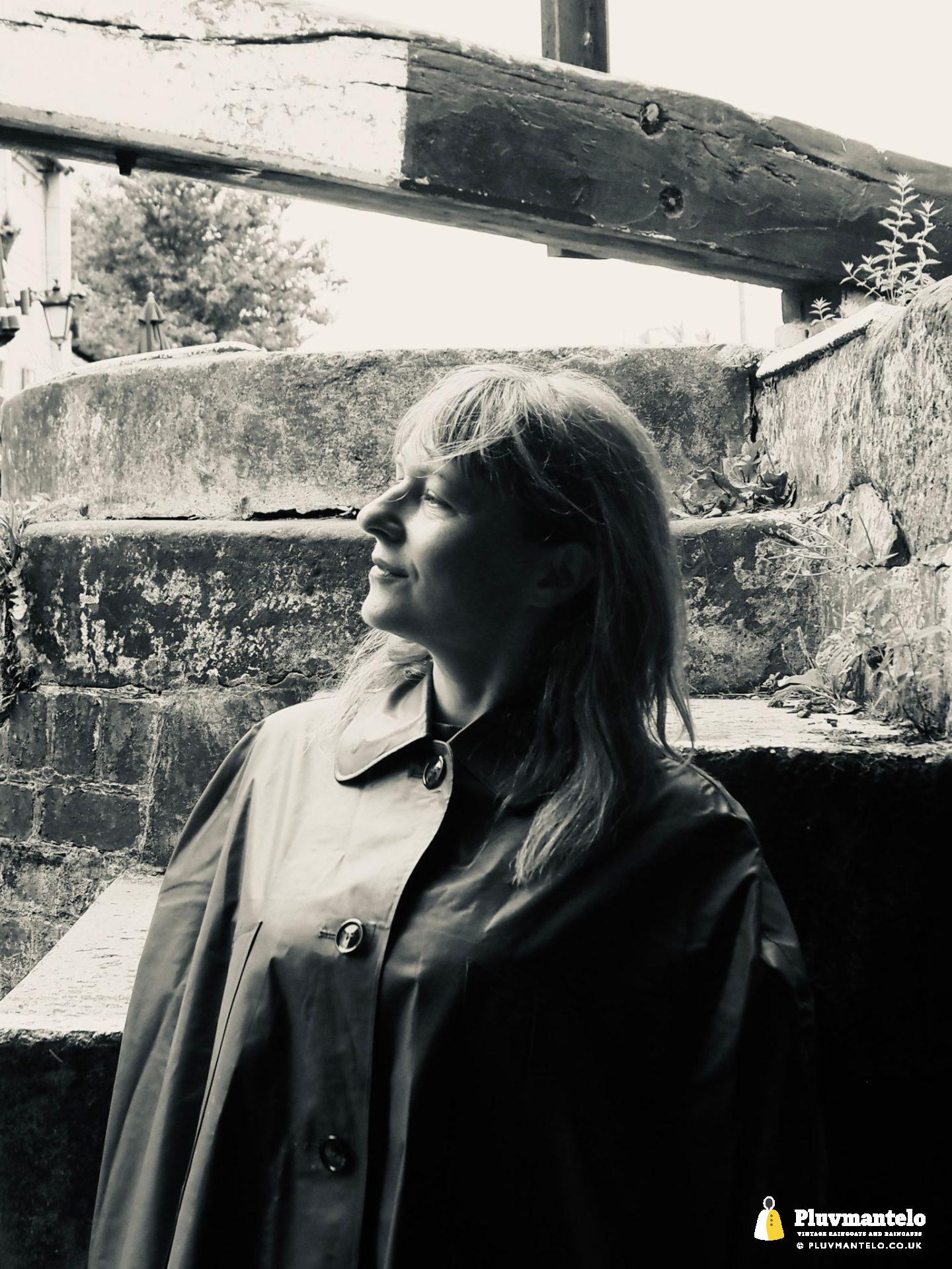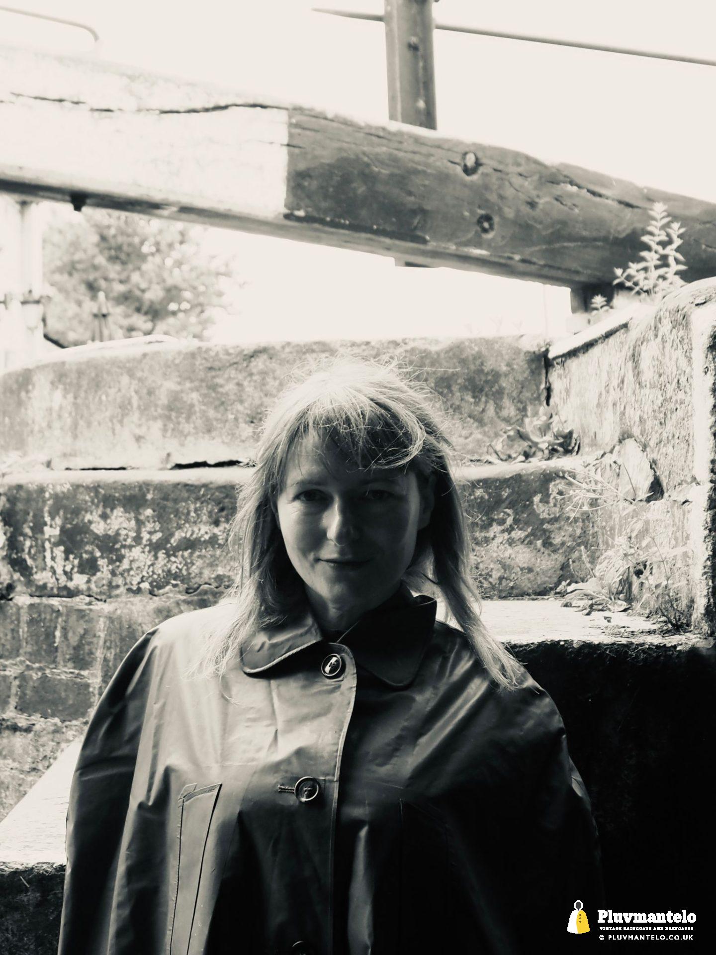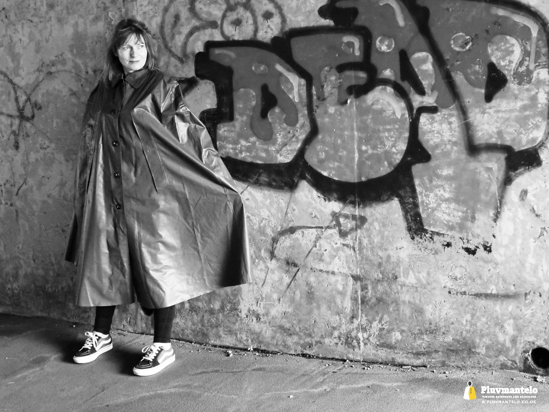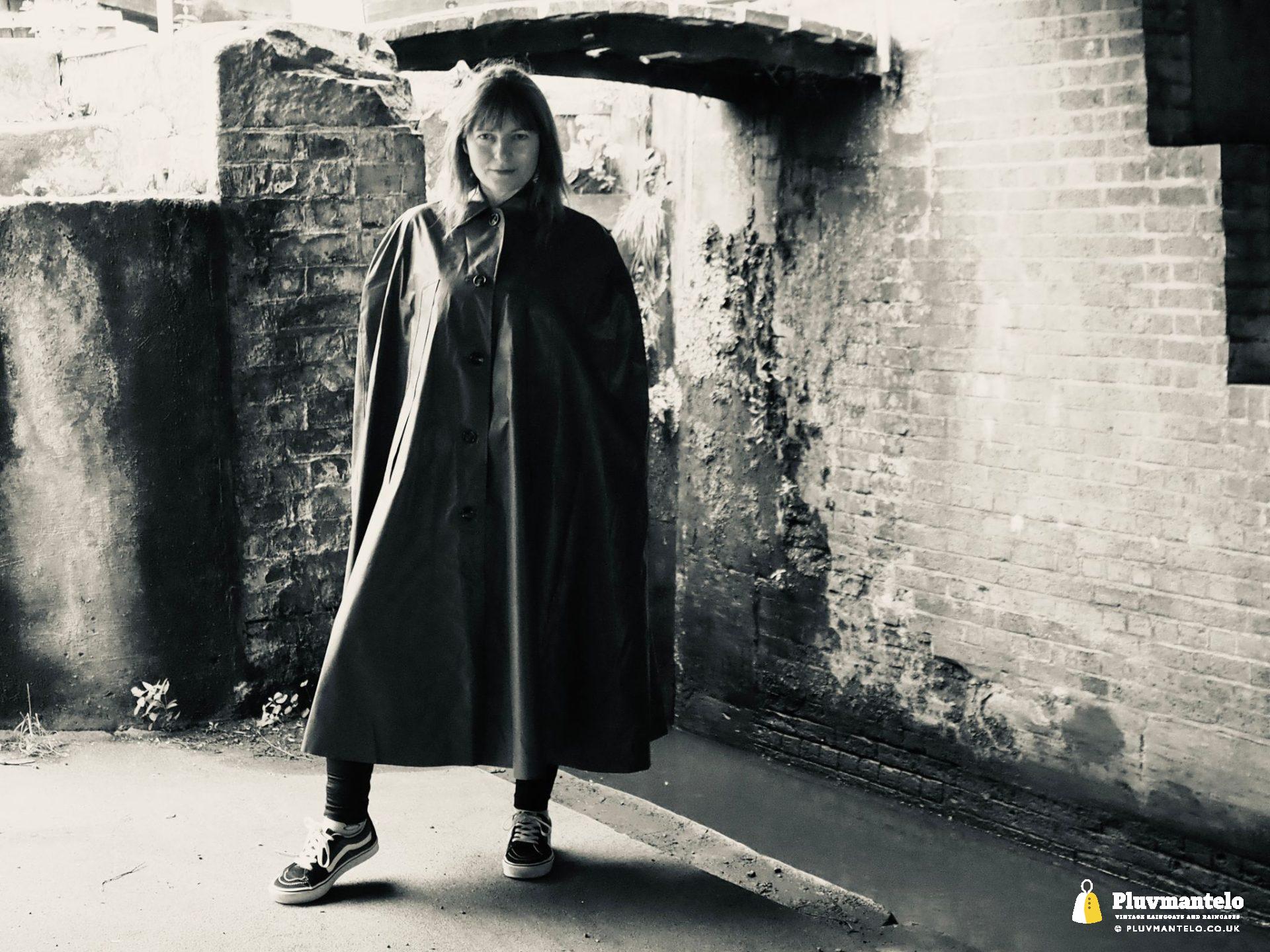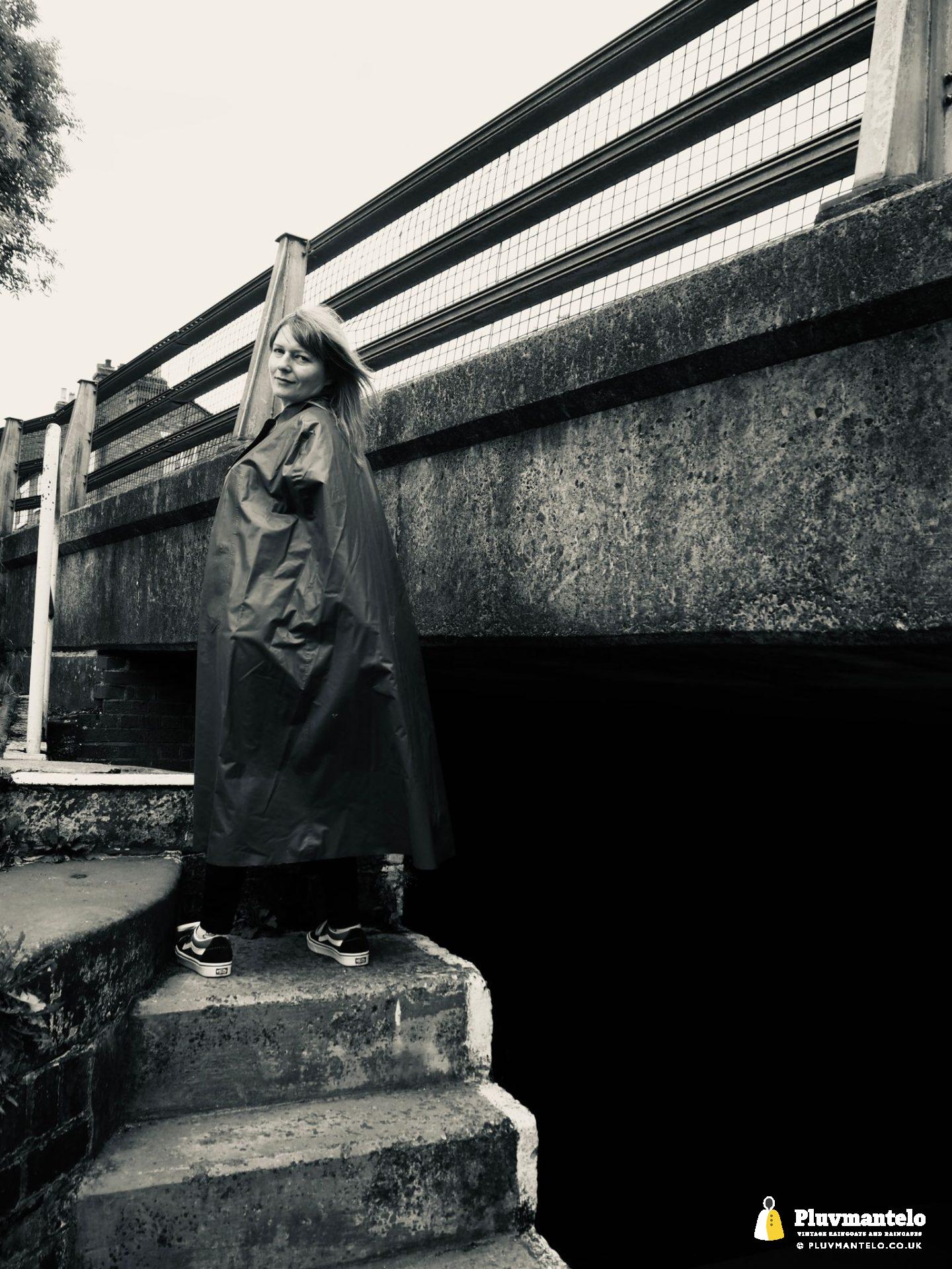 And while she was in Stone she took a walk by the canal in her Klepper cape, which is one of her most-liked capes. But who would realise it could look so good in black and white? There’s a true noir edge here and it’s one we really like, especially in the graffitied underpass.