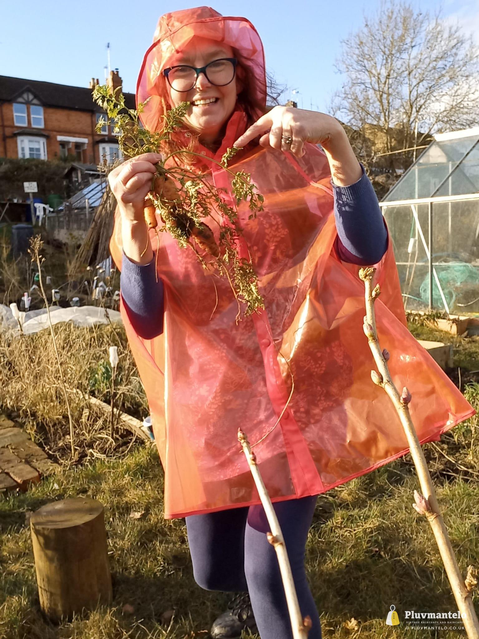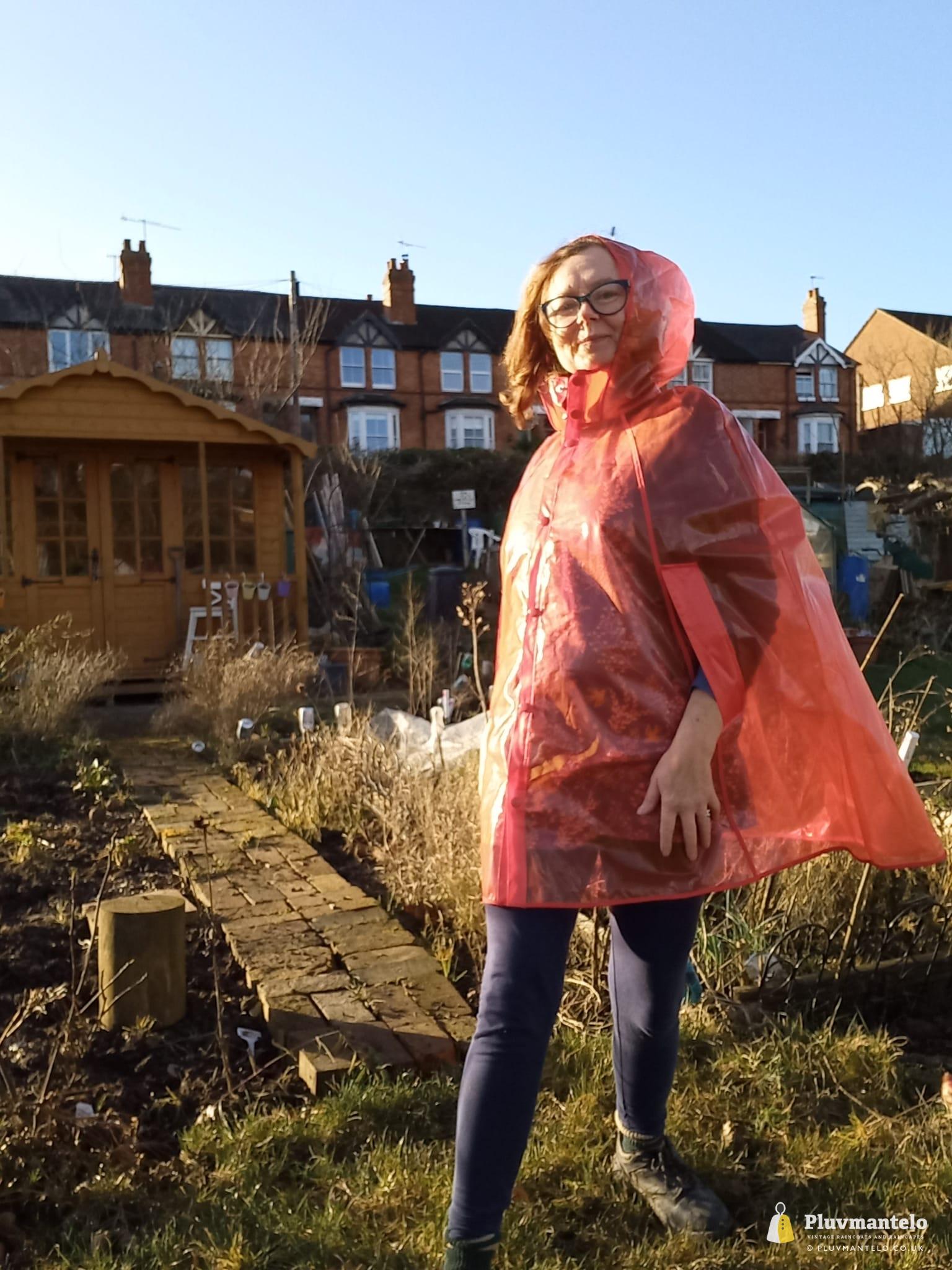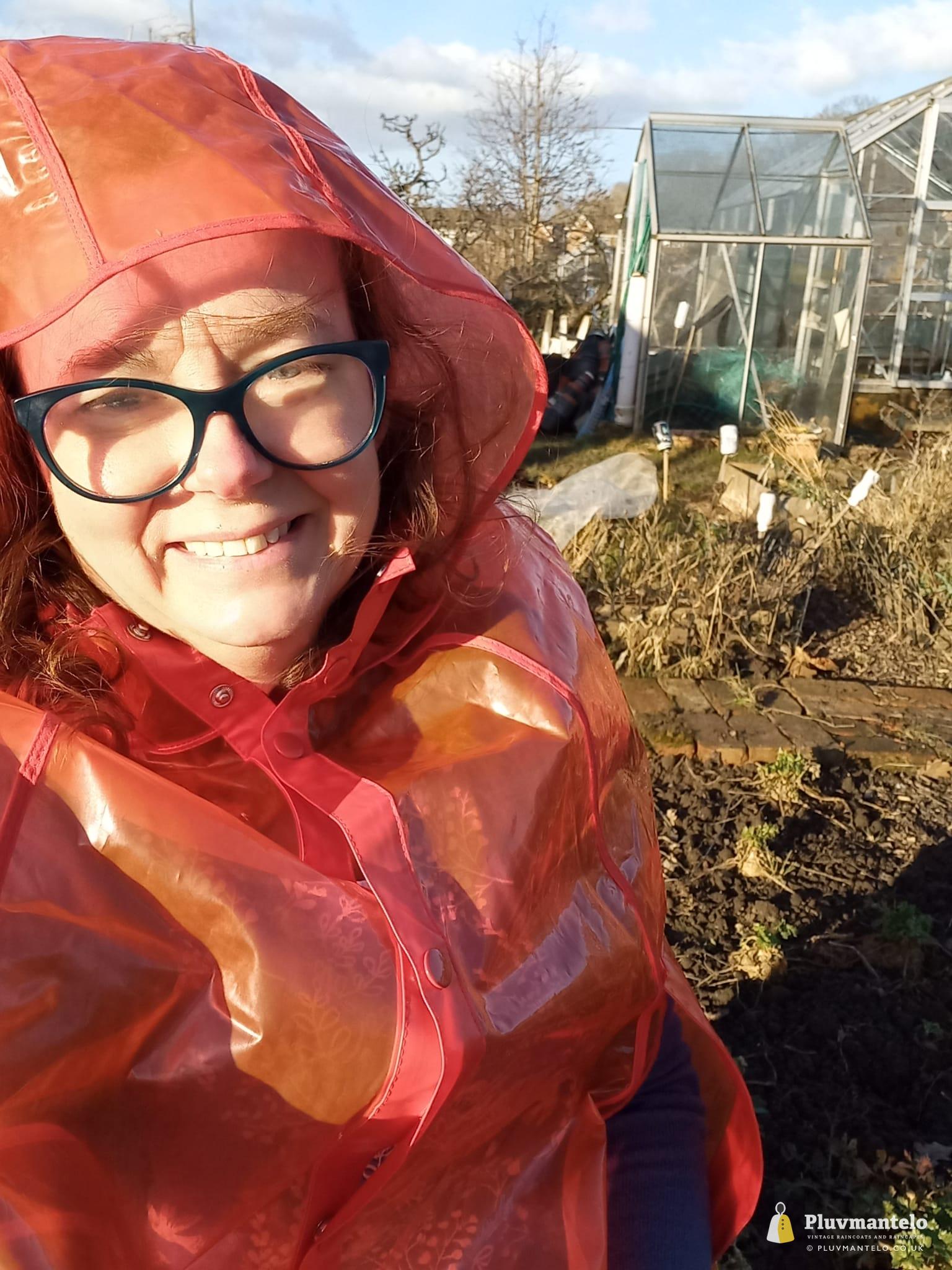 Anyway as Spring gets closer we’ll soon be seeing plenty of tips regarding what you should be doing in your garden or at your allotment. We say wear a cape. And Pluvmantelo’s friend Veronica recently made the most of the good weather and got stuck in with some cape gardening, wearing her orange pvc cape. The results look good…