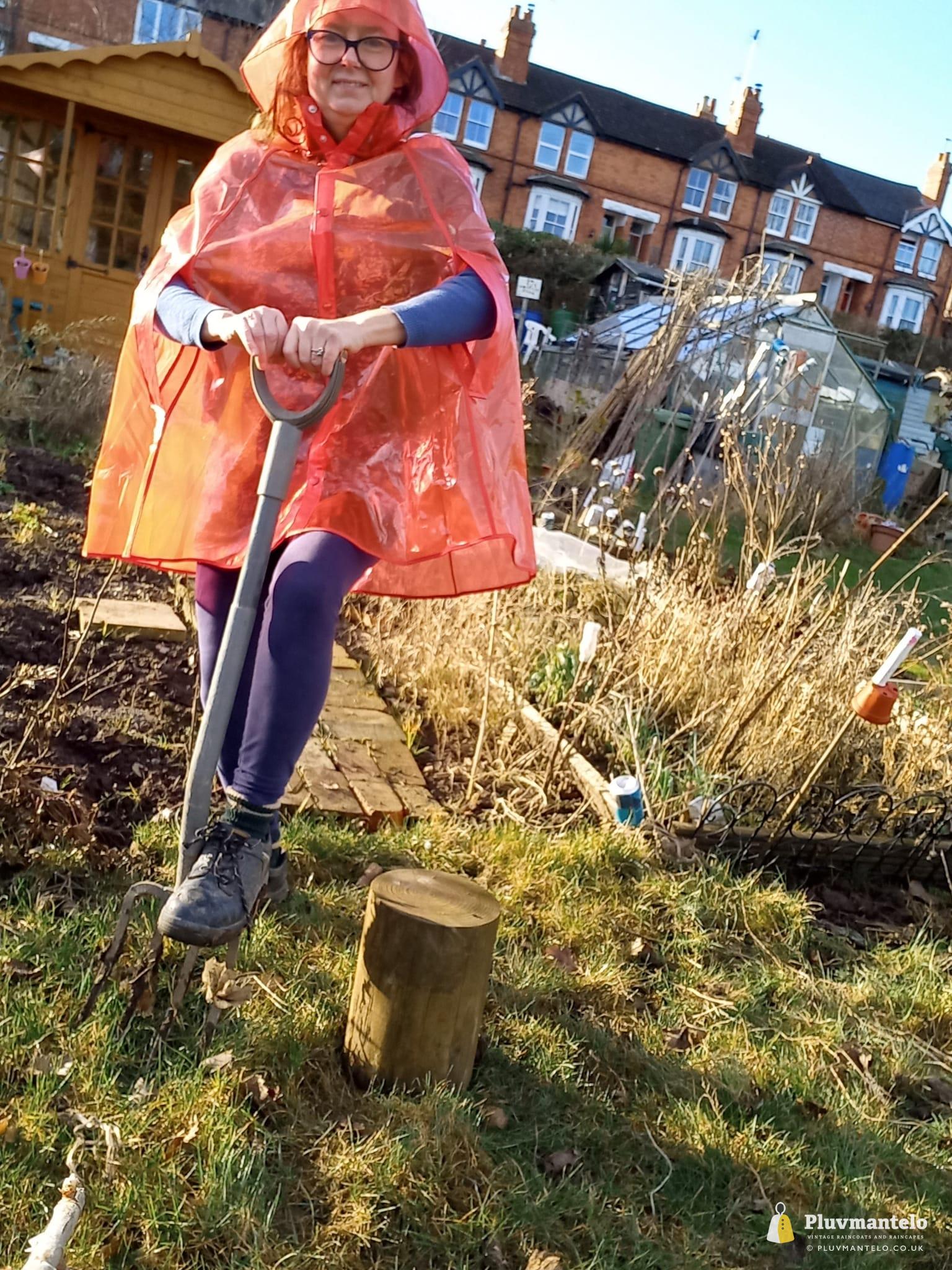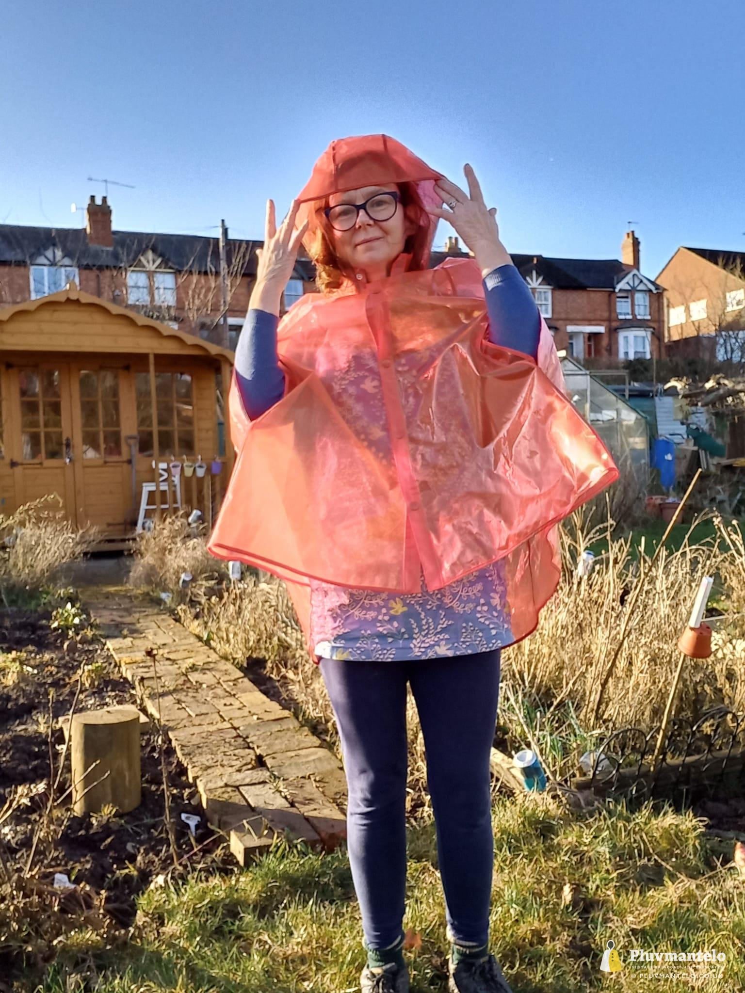 Anyway as Spring gets closer we’ll soon be seeing plenty of tips regarding what you should be doing in your garden or at your allotment. We say wear a cape. And Pluvmantelo’s friend Veronica recently made the most of the good weather and got stuck in with some cape gardening, wearing her orange pvc cape. The results look good…