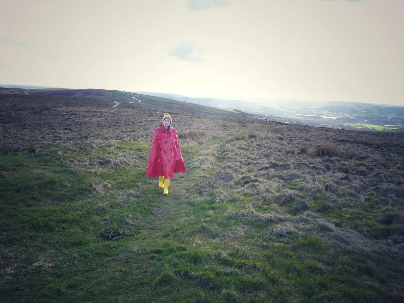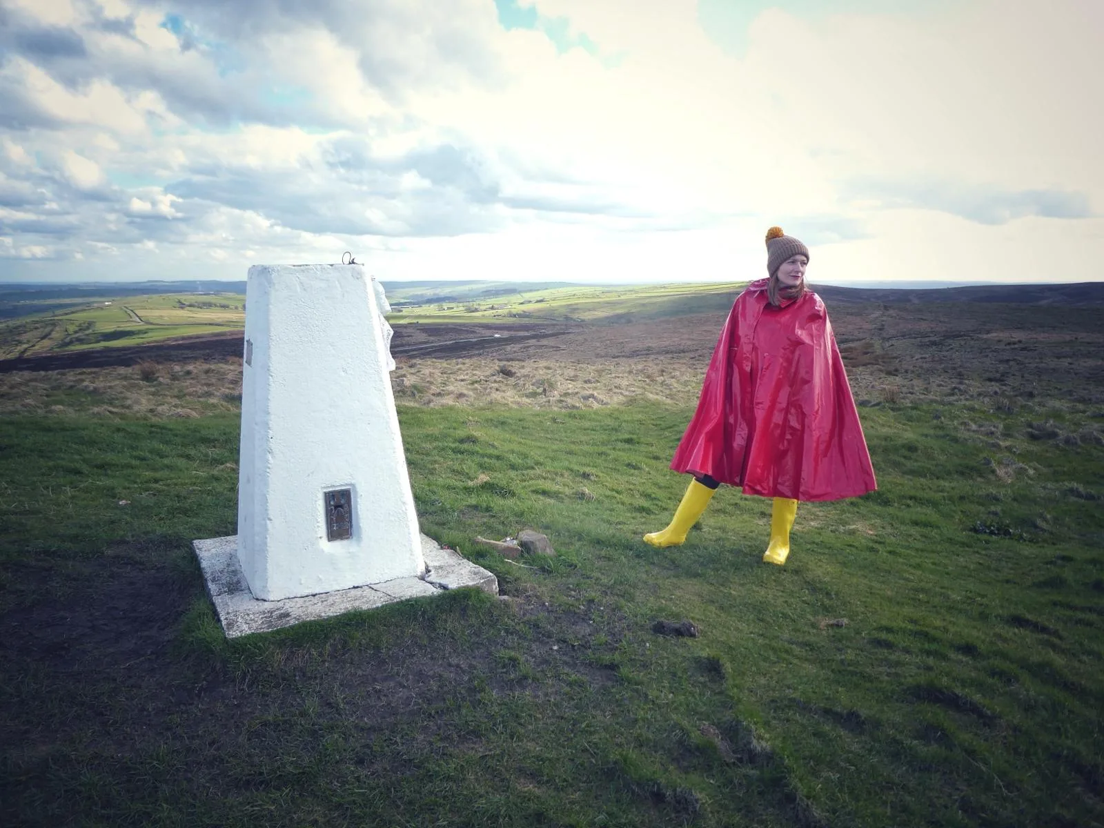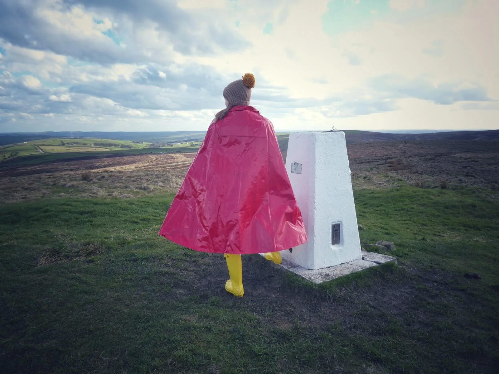 The Cape Queen’s interest in Mercia’s history means there’s plenty of walking in the hills, and it’s that often-happening bad weather that led to her love of raincapes and the all-enveloping protection they provide. Over Easter the rain fortunately didn’t come, but Clair still donned a cape as she hiked to this trig point high up on her favourite moors. Trig points were put up across the country between 1935 and 1962 as the Ordnance Survey, Britain’s mapping agency, sought to improve the accuracy of maps. On the day these pictures were taken the sky was blue, the numerous clouds were light and bowled along by a stiff breeze and the views were utterly spectacular. And let’s be honest, The Cape Queen was resplendent in red Bormax cape and yellow boots: a delightful sight indeed, we think you will agree.