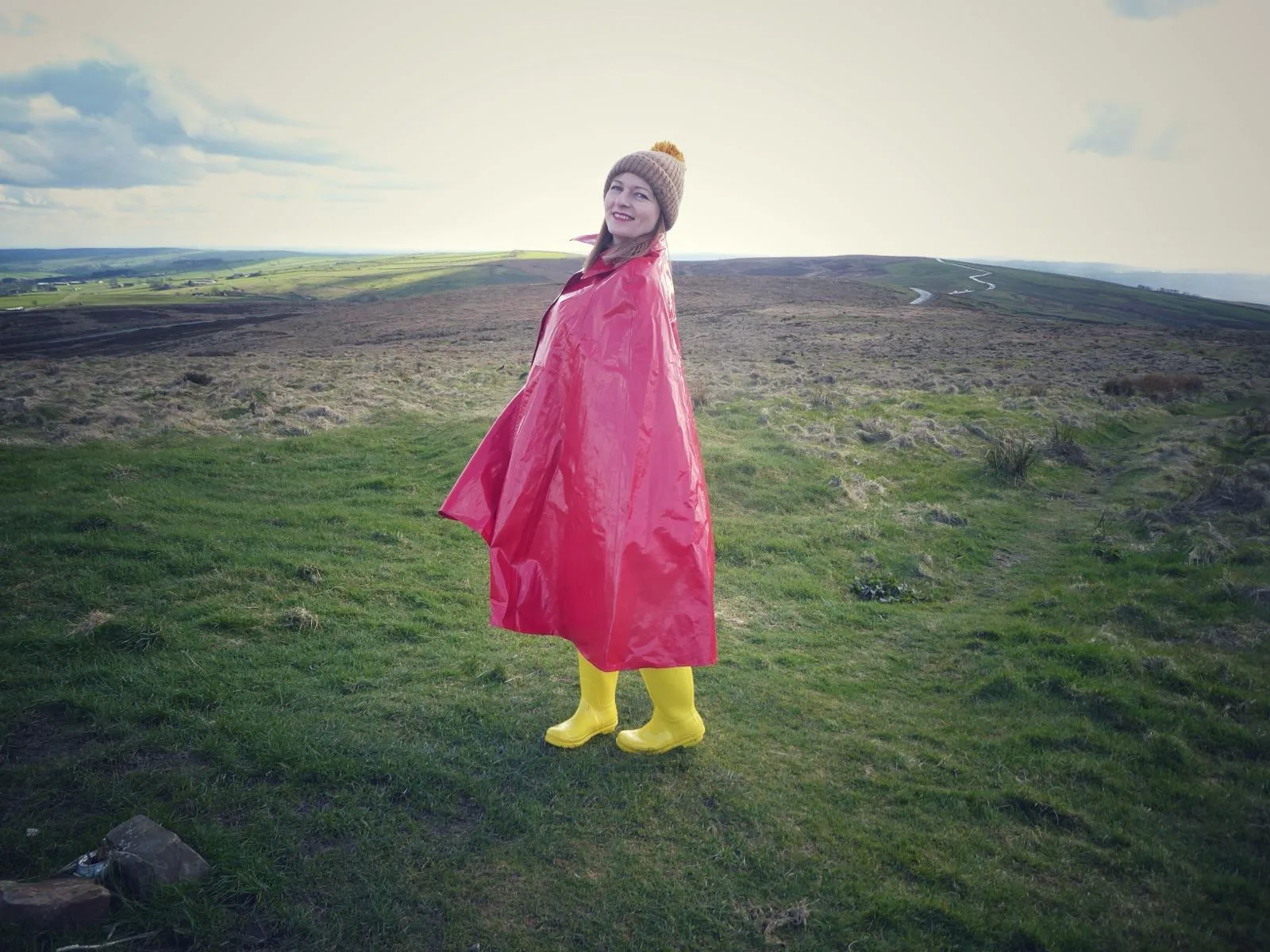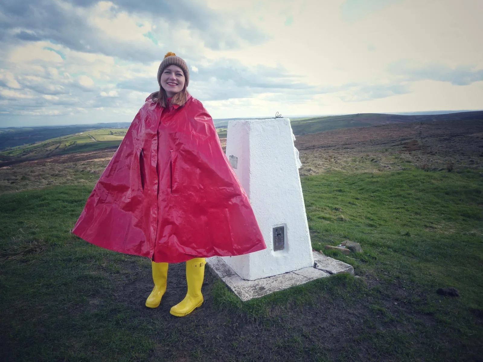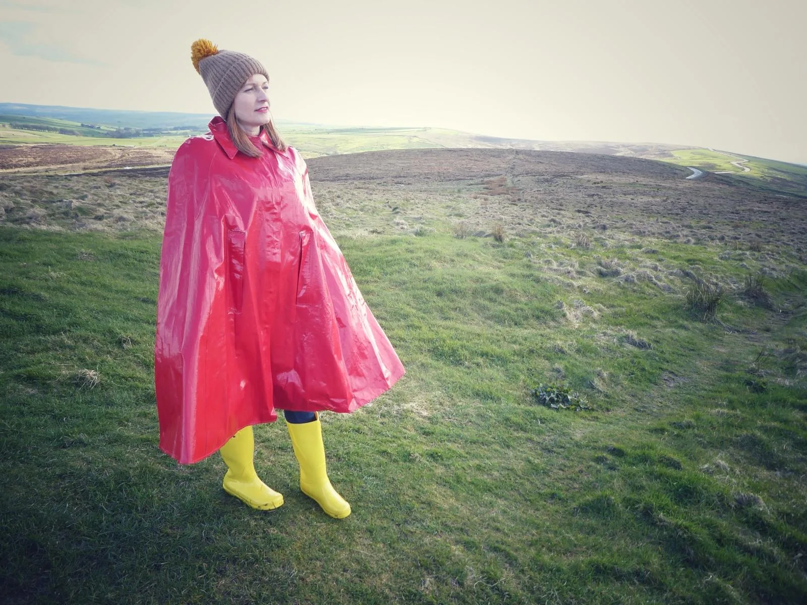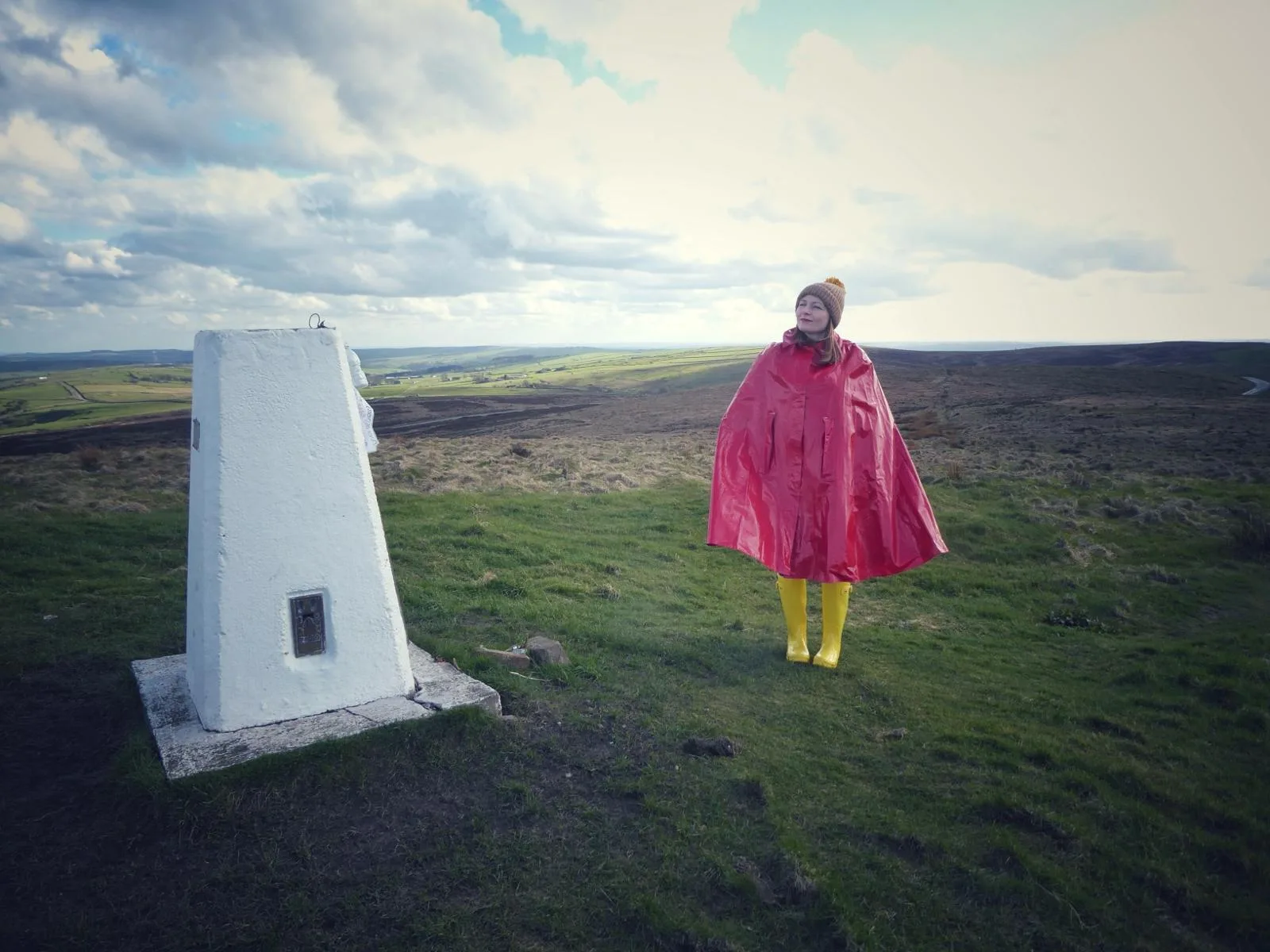 The Cape Queen’s interest in Mercia’s history means there’s plenty of walking in the hills, and it’s that often-happening bad weather that led to her love of raincapes and the all-enveloping protection they provide. Over Easter the rain fortunately didn’t come, but Clair still donned a cape as she hiked to this trig point high up on her favourite moors. Trig points were put up across the country between 1935 and 1962 as the Ordnance Survey, Britain’s mapping agency, sought to improve the accuracy of maps. On the day these pictures were taken the sky was blue, the numerous clouds were light and bowled along by a stiff breeze and the views were utterly spectacular. And let’s be honest, The Cape Queen was resplendent in red Bormax cape and yellow boots: a delightful sight indeed, we think you will agree.
