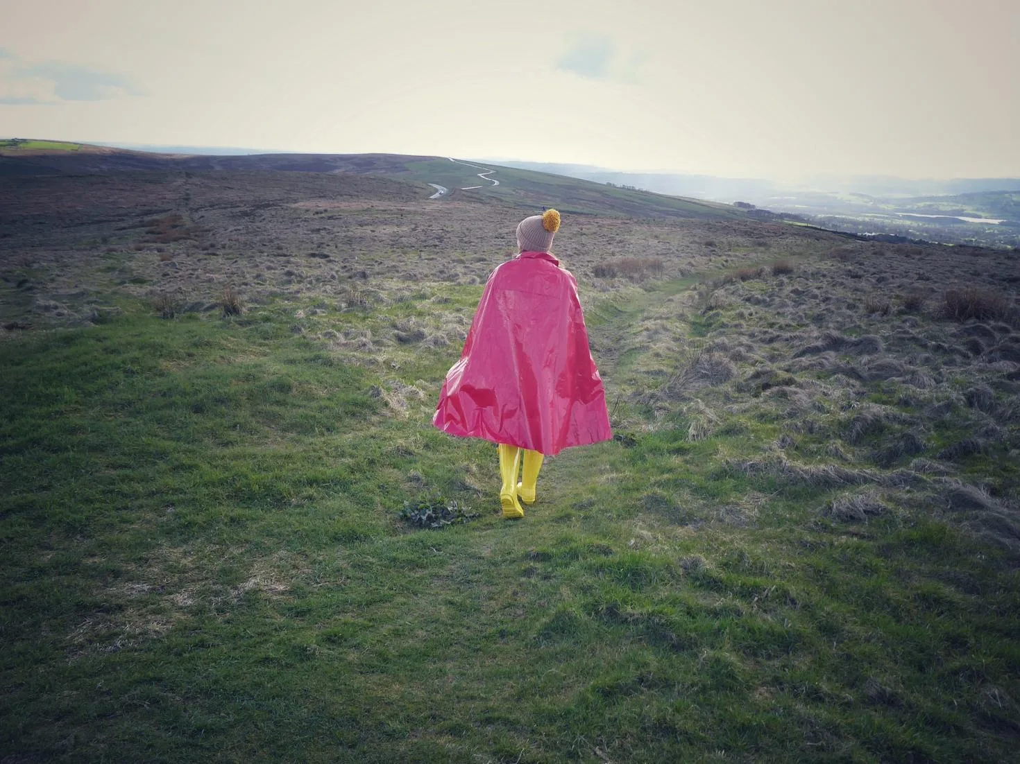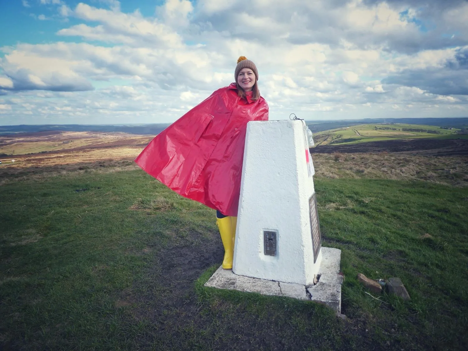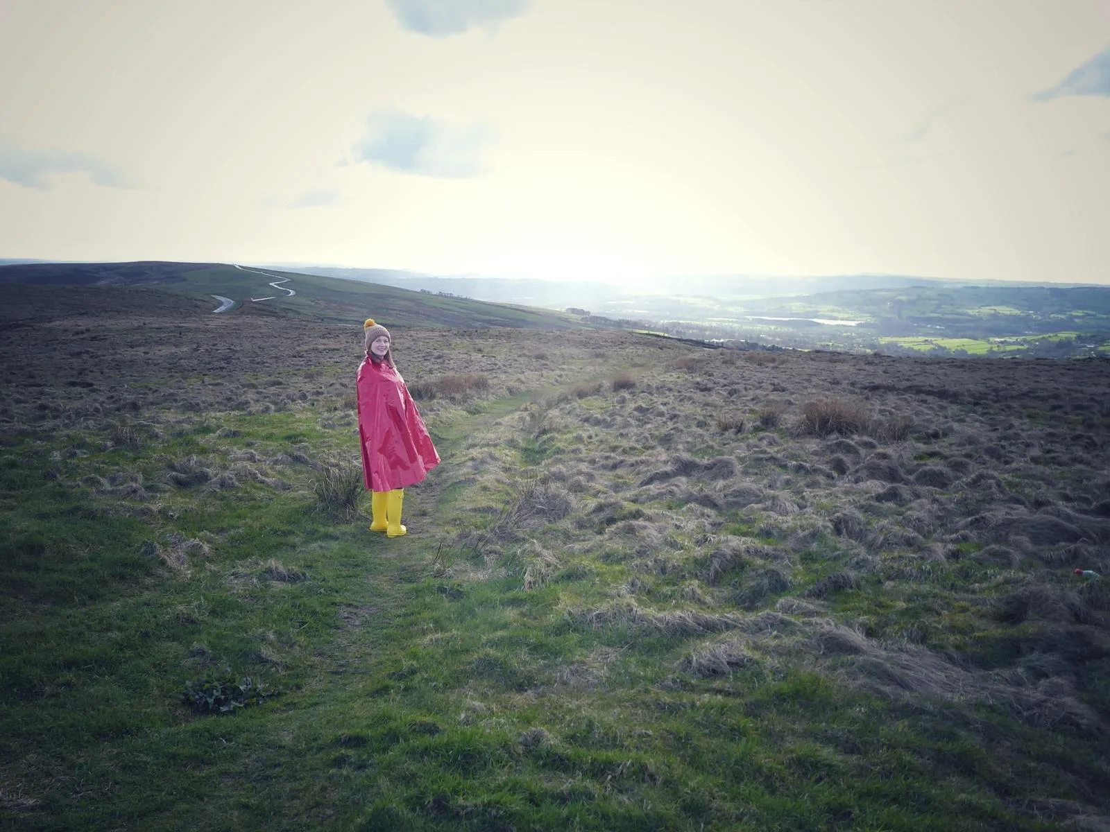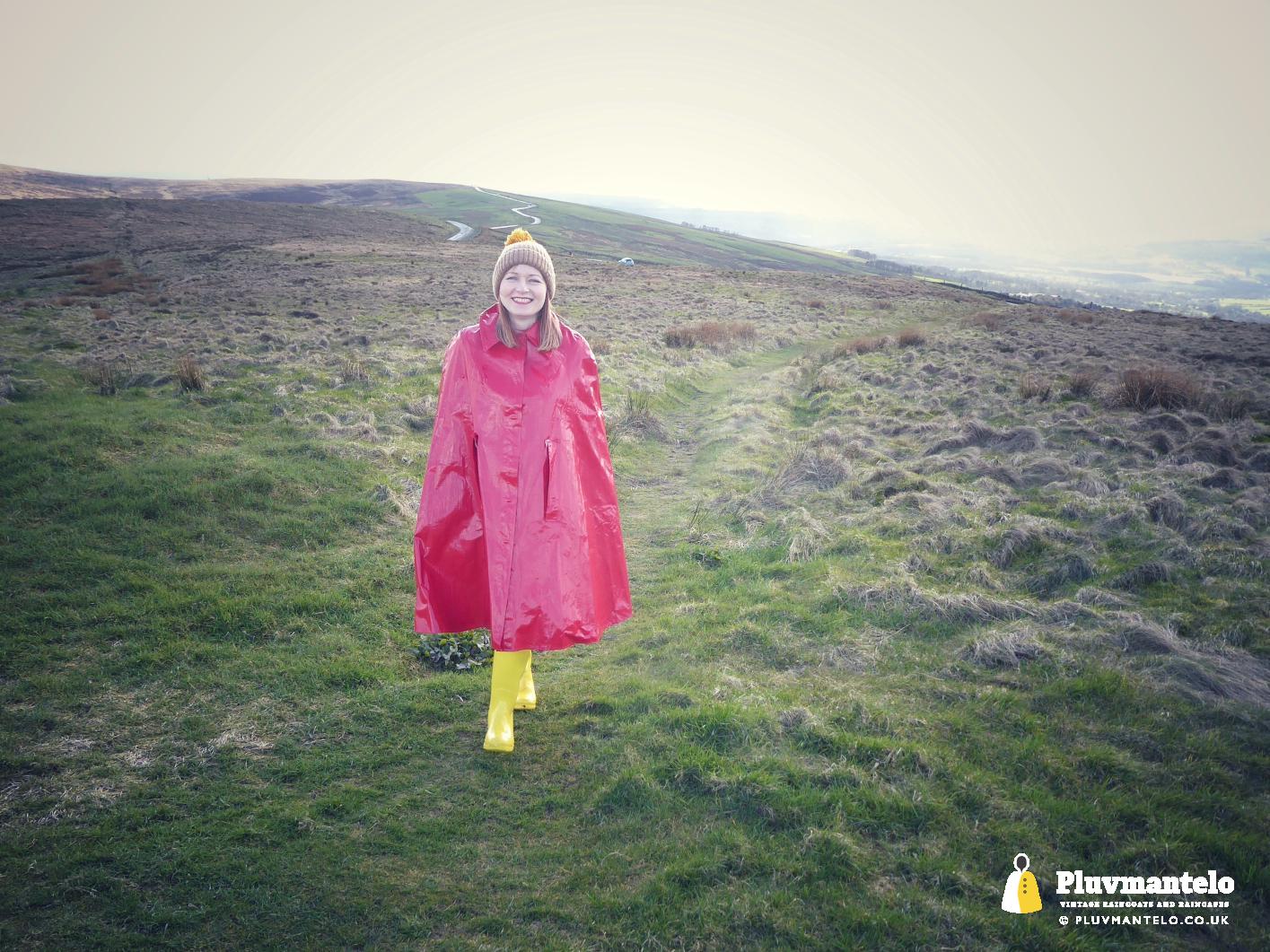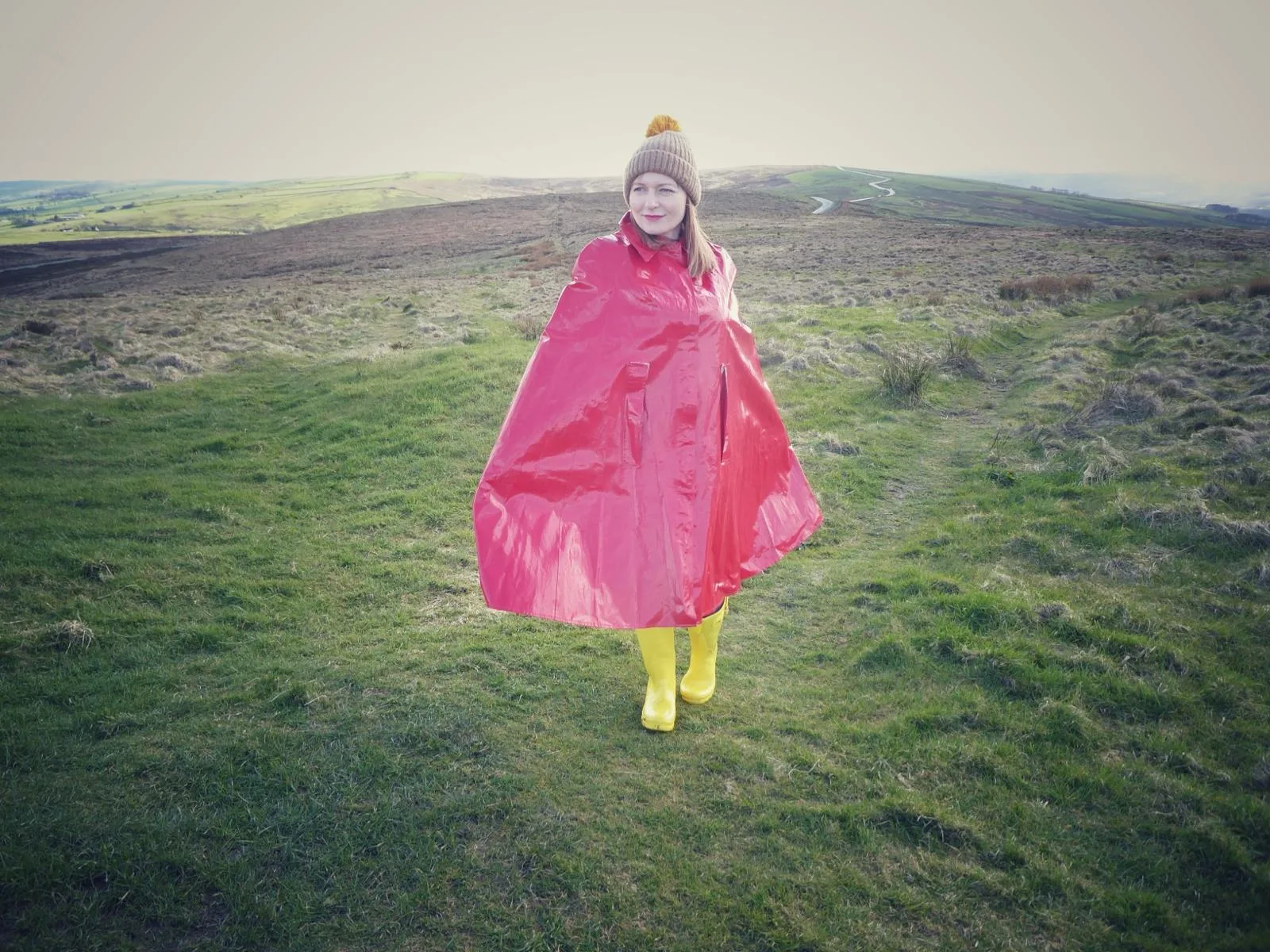 The Cape Queen’s interest in Mercia’s history means there’s plenty of walking in the hills, and it’s that often-happening bad weather that led to her love of raincapes and the all-enveloping protection they provide. Over Easter the rain fortunately didn’t come, but Clair still donned a cape as she hiked to this trig point high up on her favourite moors. Trig points were put up across the country between 1935 and 1962 as the Ordnance Survey, Britain’s mapping agency, sought to improve the accuracy of maps. On the day these pictures were taken the sky was blue, the numerous clouds were light and bowled along by a stiff breeze and the views were utterly spectacular. And let’s be honest, The Cape Queen was resplendent in red Bormax cape and yellow boots: a delightful sight indeed, we think you will agree.