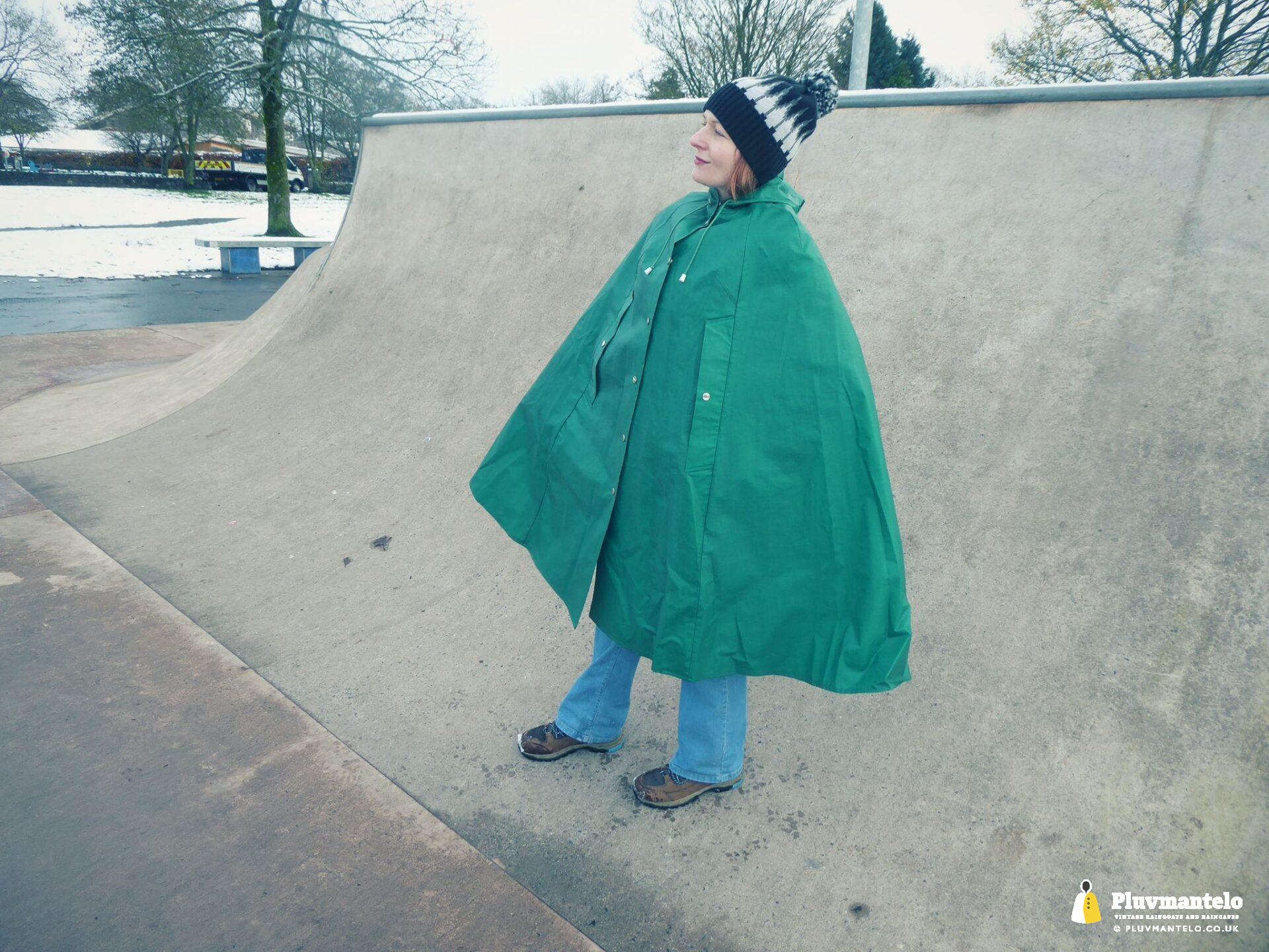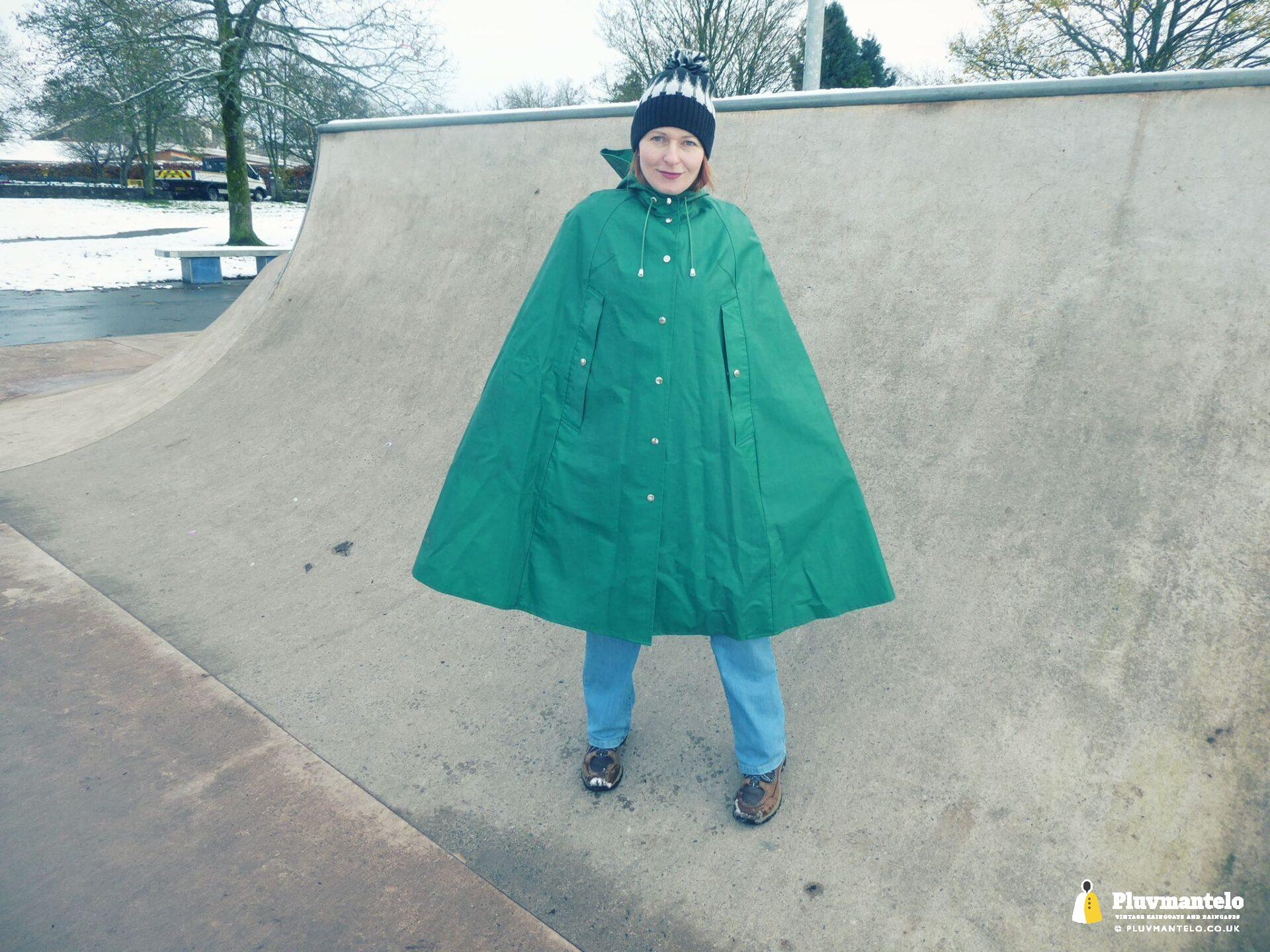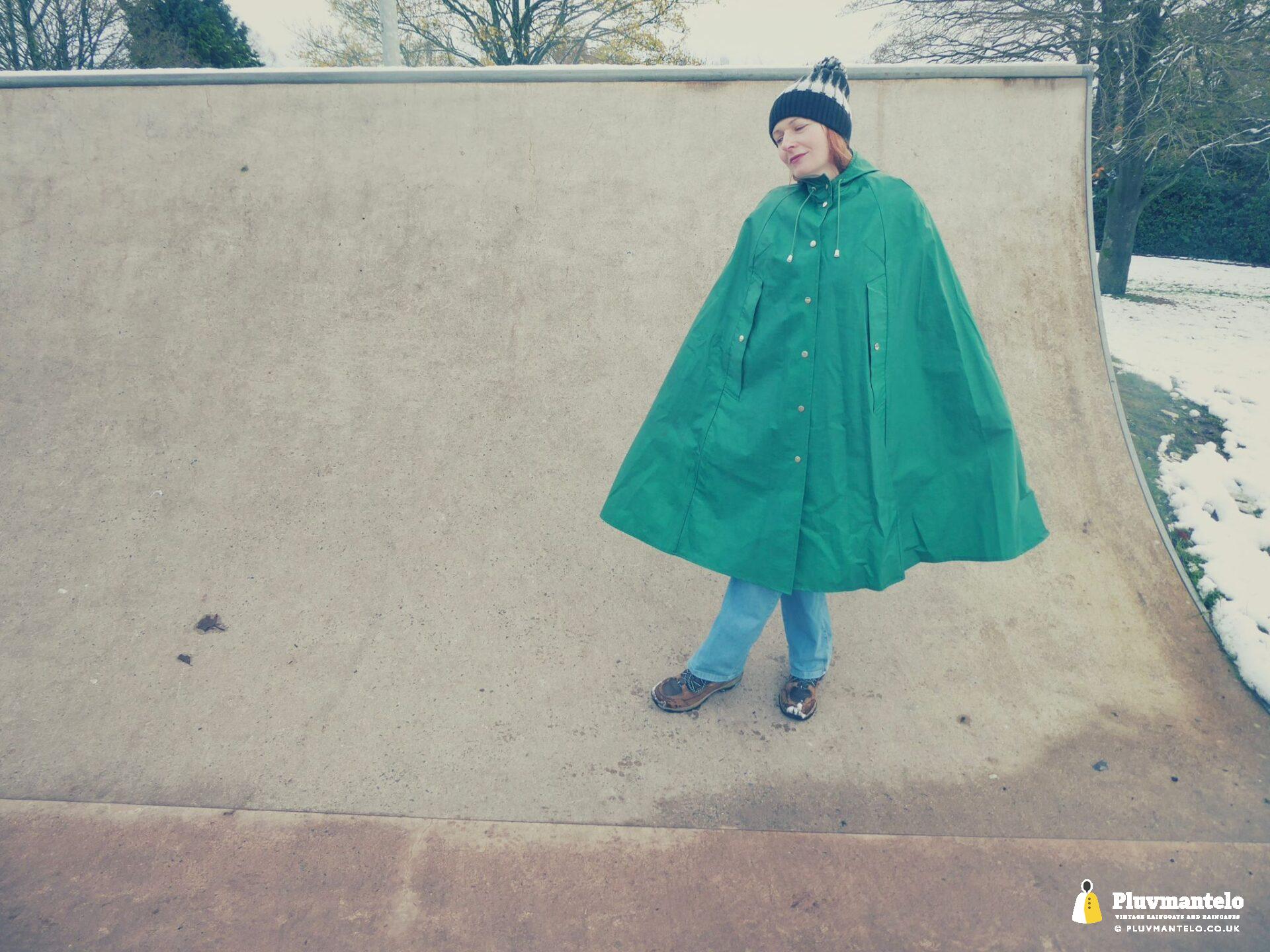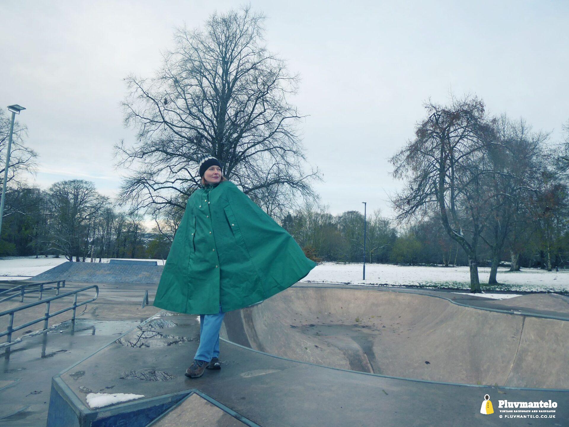 It certainly was on a cold, slightly snowy day in Clair The Cape Queen’s part of the world. This was the first outing for her Rukka cape in quite some time and she appreciates both its rain and wind resistance, courtesy of its waxed cotton construction. And yes, it hangs well too – and sounds good too!