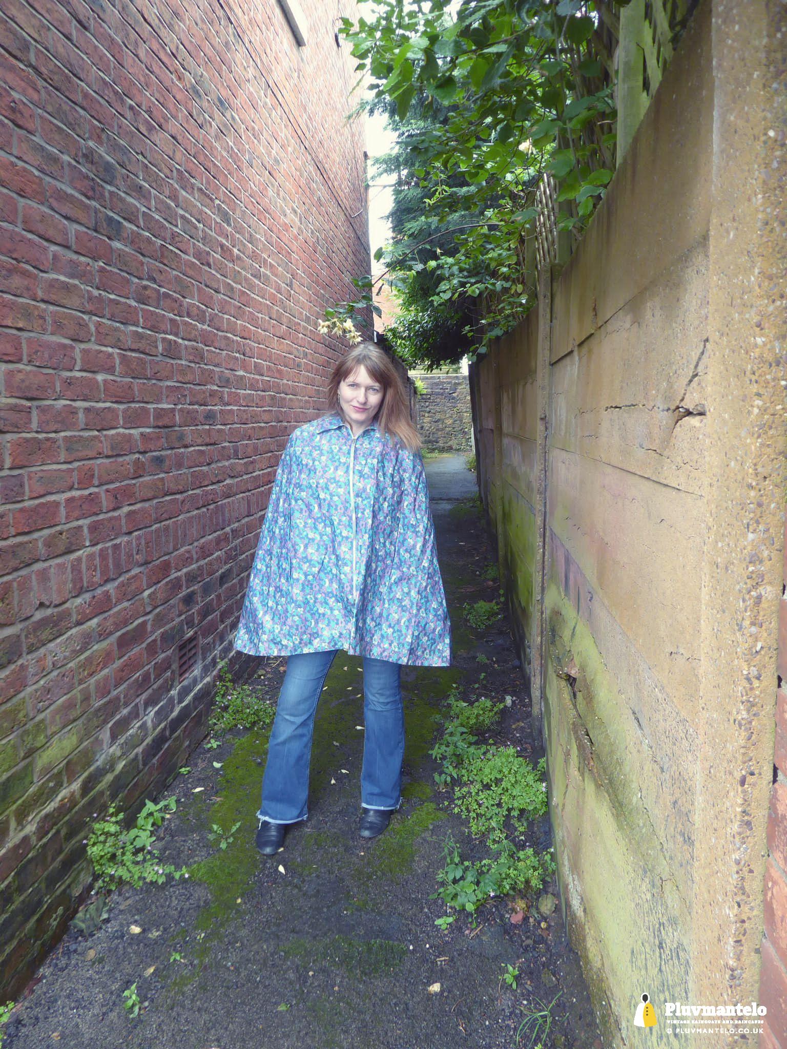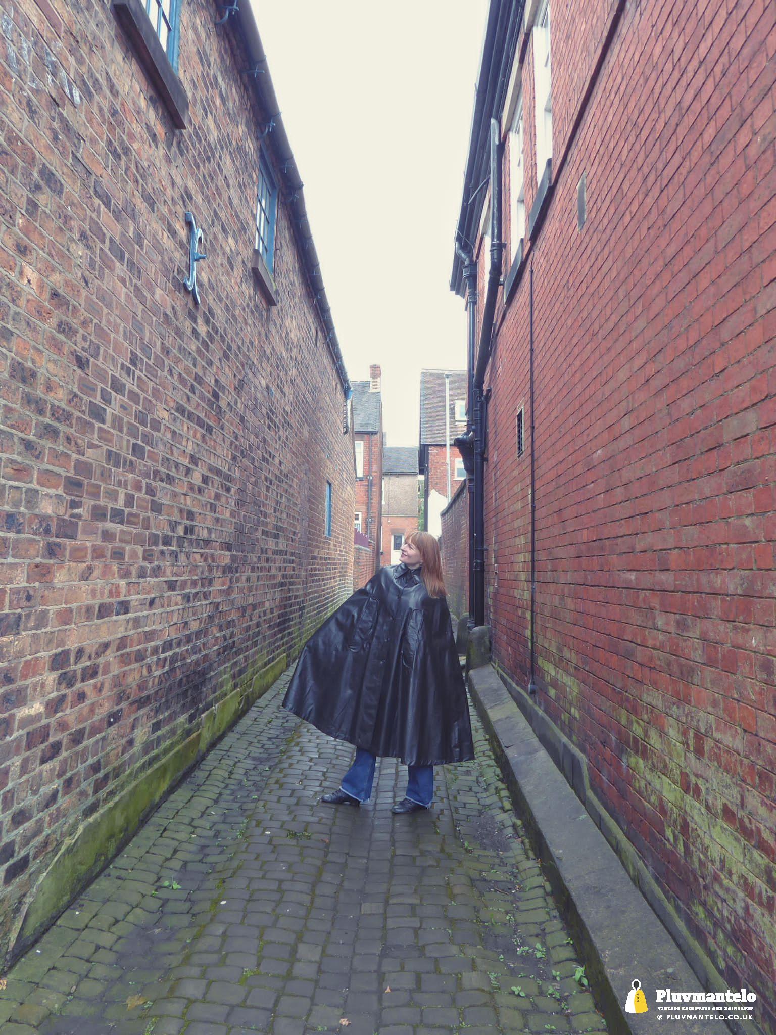 The title was highly appropriate for The cape Queen as she spent an afternoon exploring some industrial architecture, wearing not one but two capes. The first, an old black rubber cape, has the higher collar Clair likes (and we know some of our followers do too) and the other is her older plastic floral print number, which added some colour to an otherwise dull day.