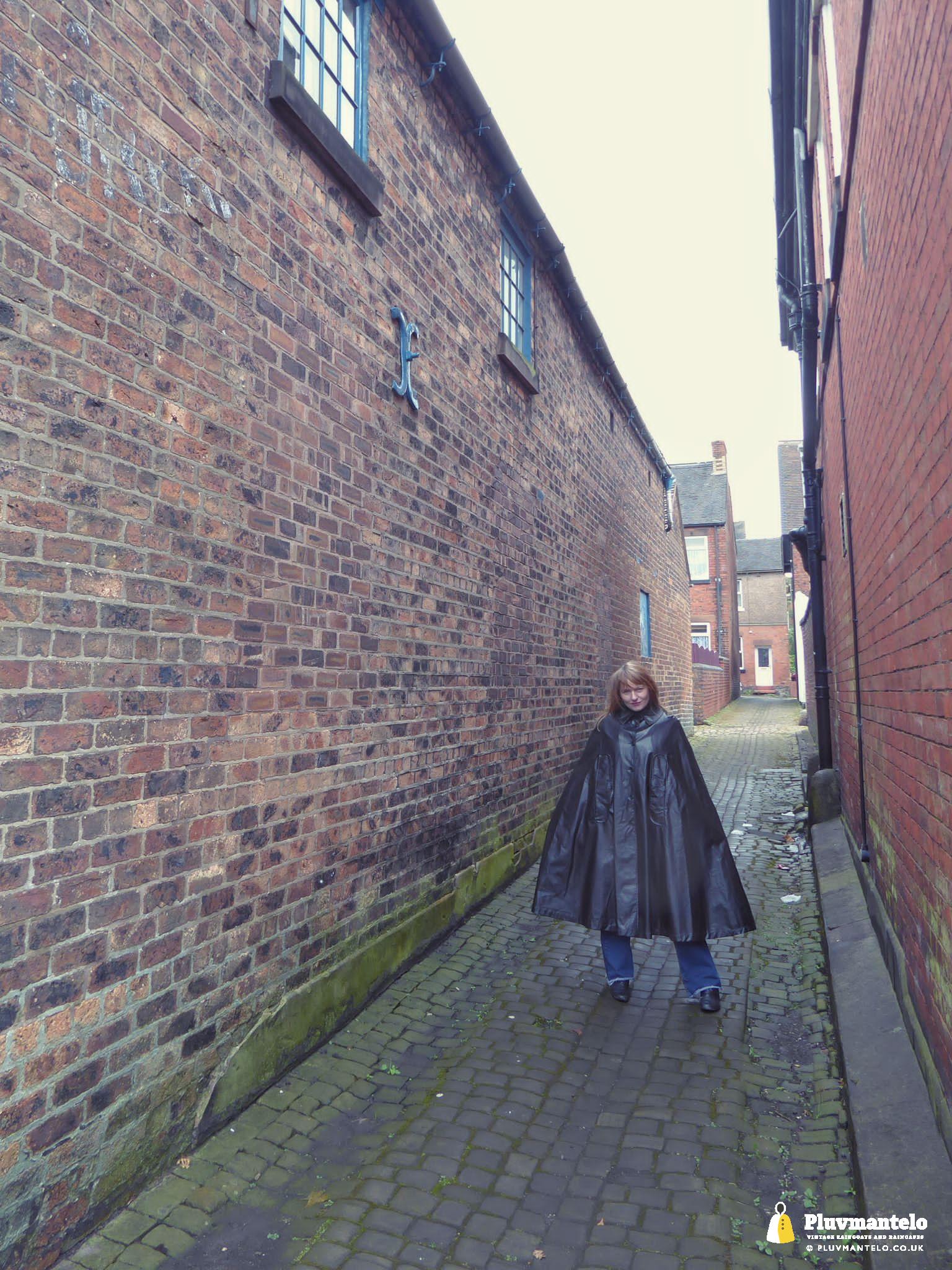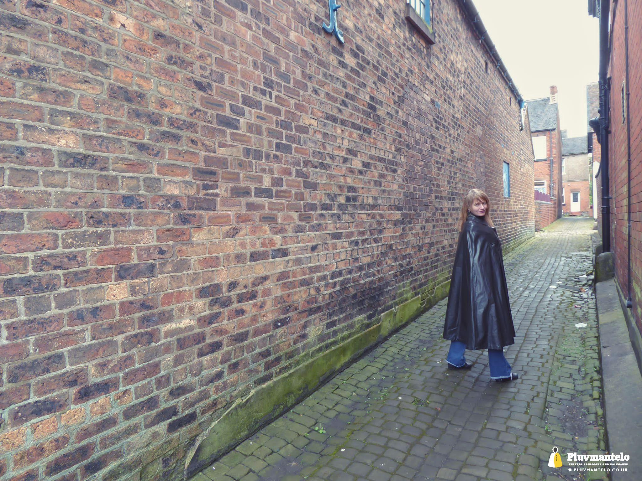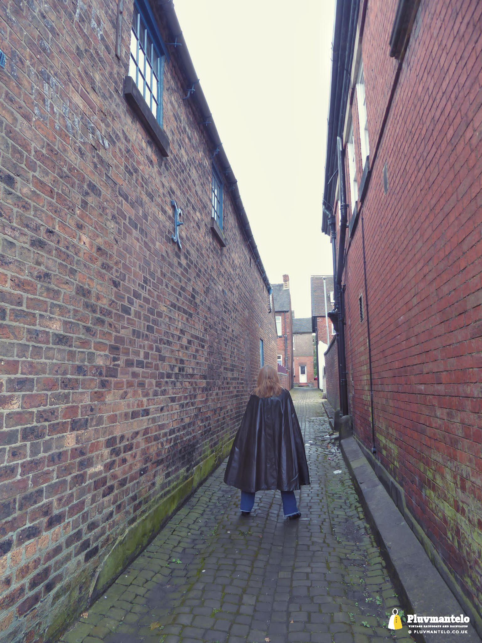 The title was highly appropriate for The cape Queen as she spent an afternoon exploring some industrial architecture, wearing not one but two capes. The first, an old black rubber cape, has the higher collar Clair likes (and we know some of our followers do too) and the other is her older plastic floral print number, which added some colour to an otherwise dull day.
