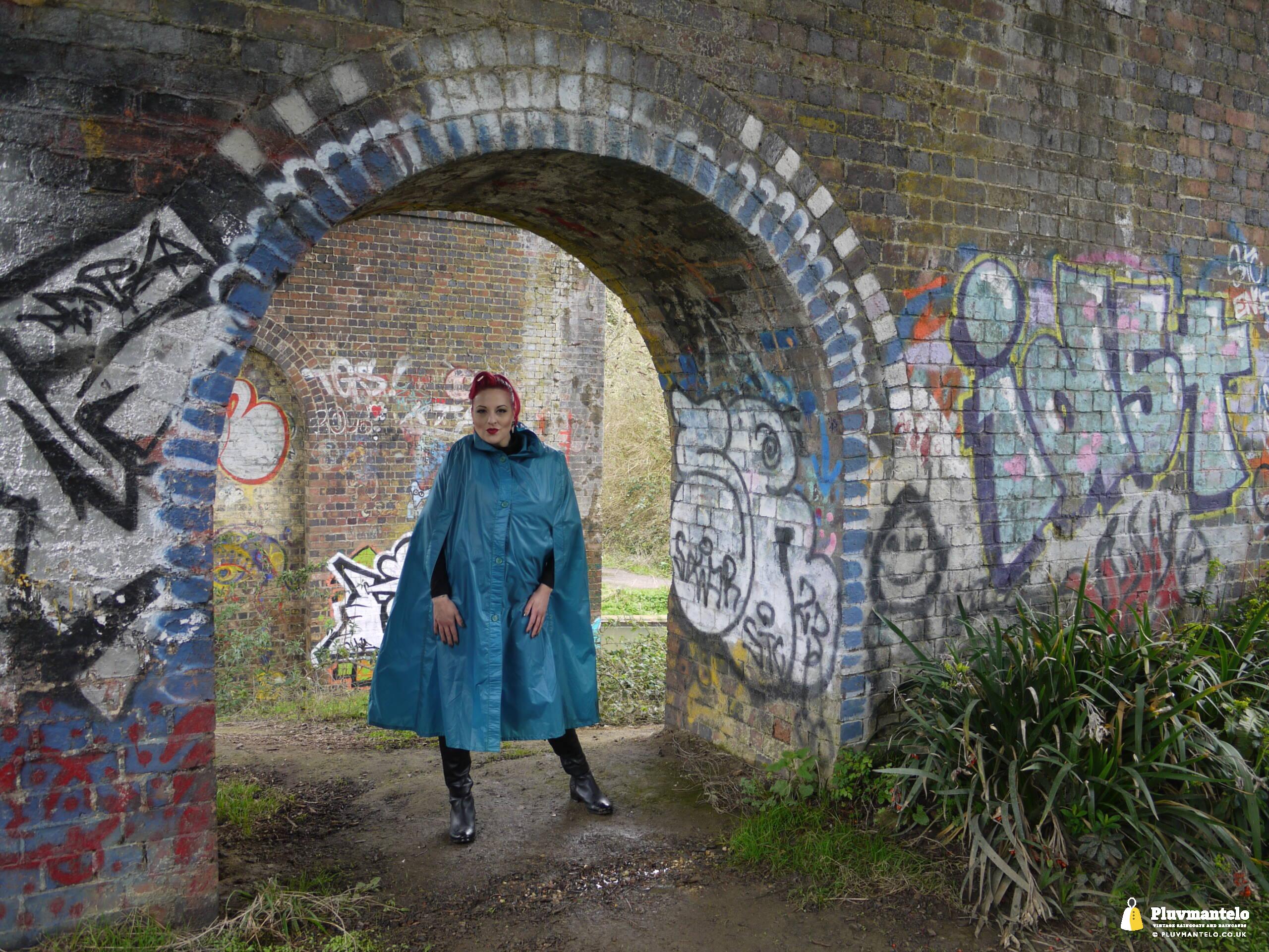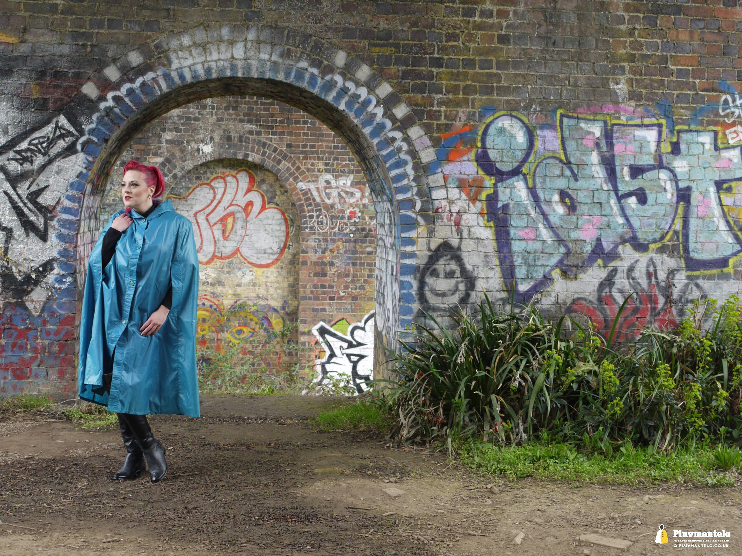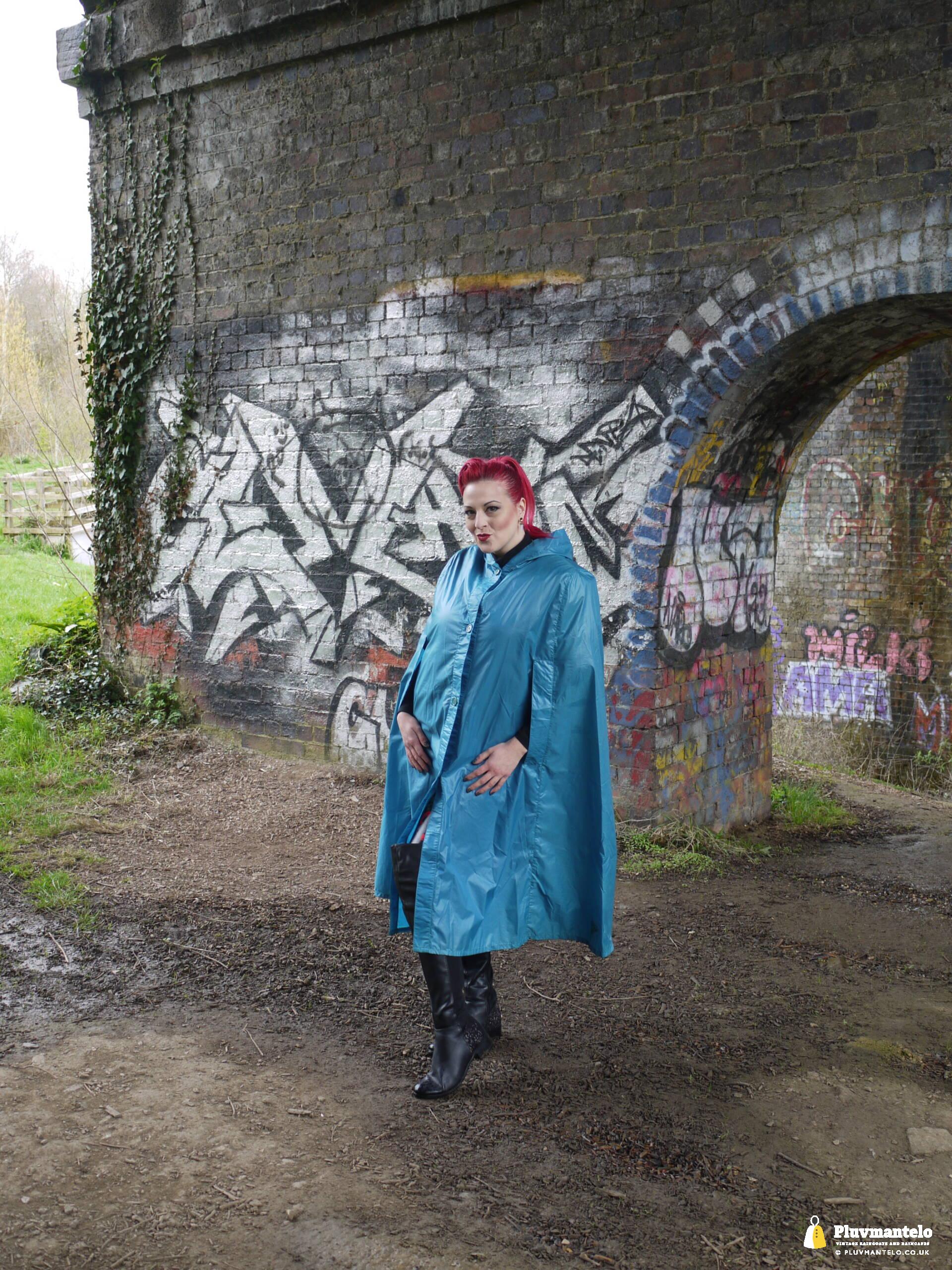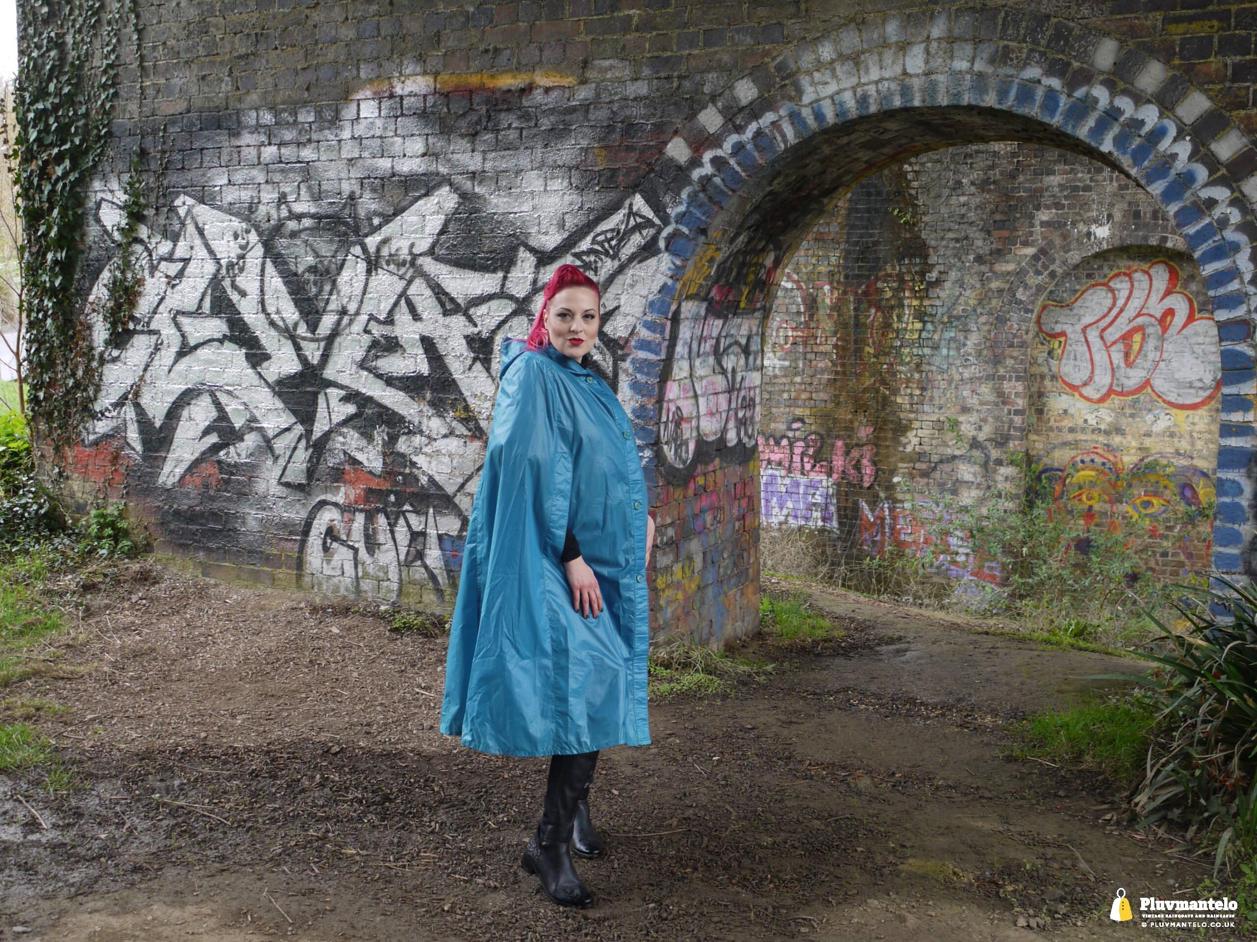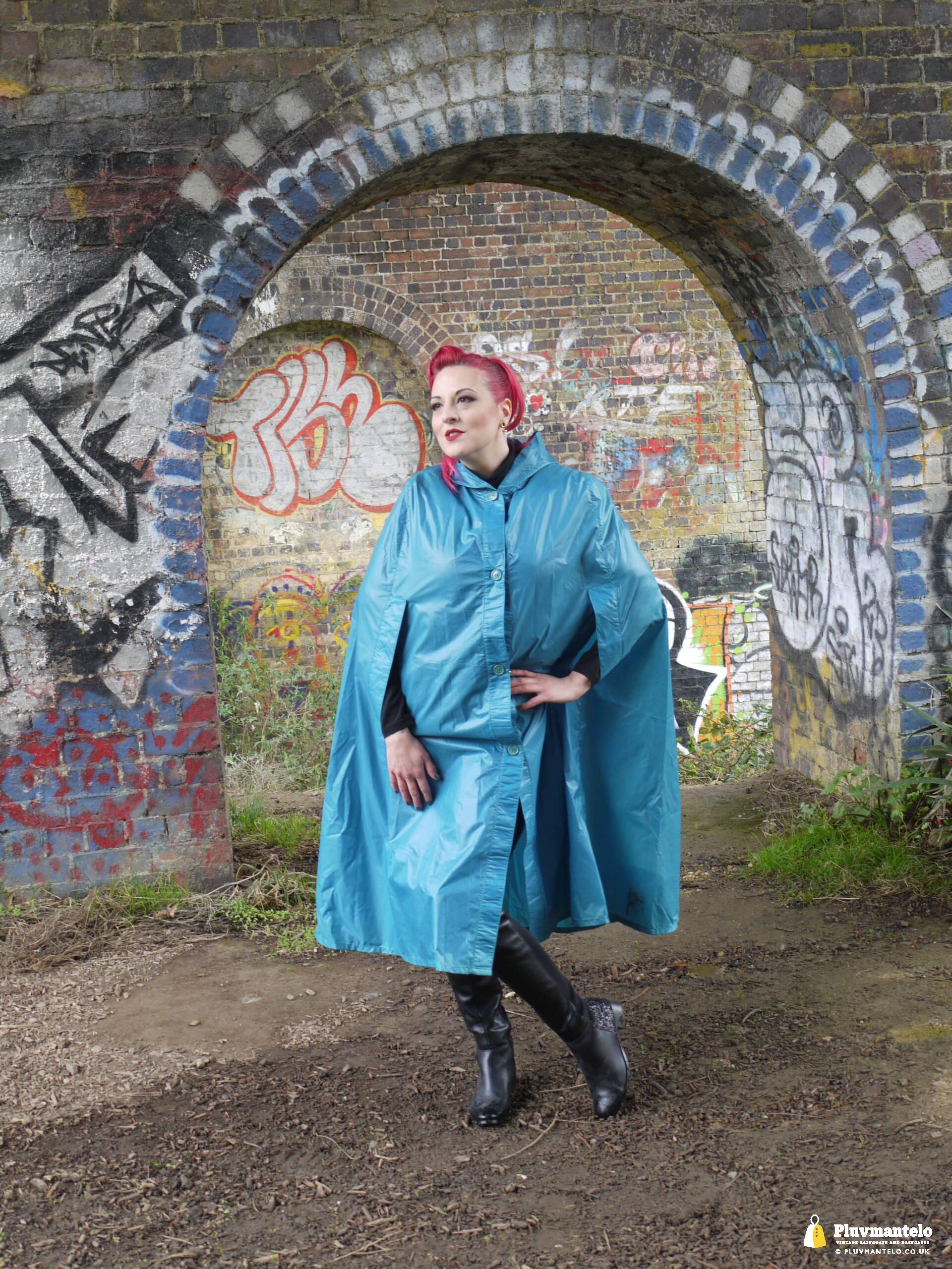 So, Pluvmantelo followers, we’d like to introduce you to The Capeatrix, a true connoisseur of the cape. We were invited to her domain while she wore a selection of 1960s and 1970s capes, beginning with this nylon early 1970s number.