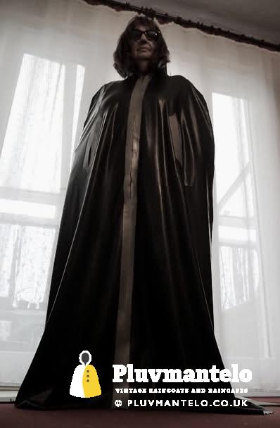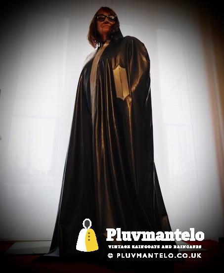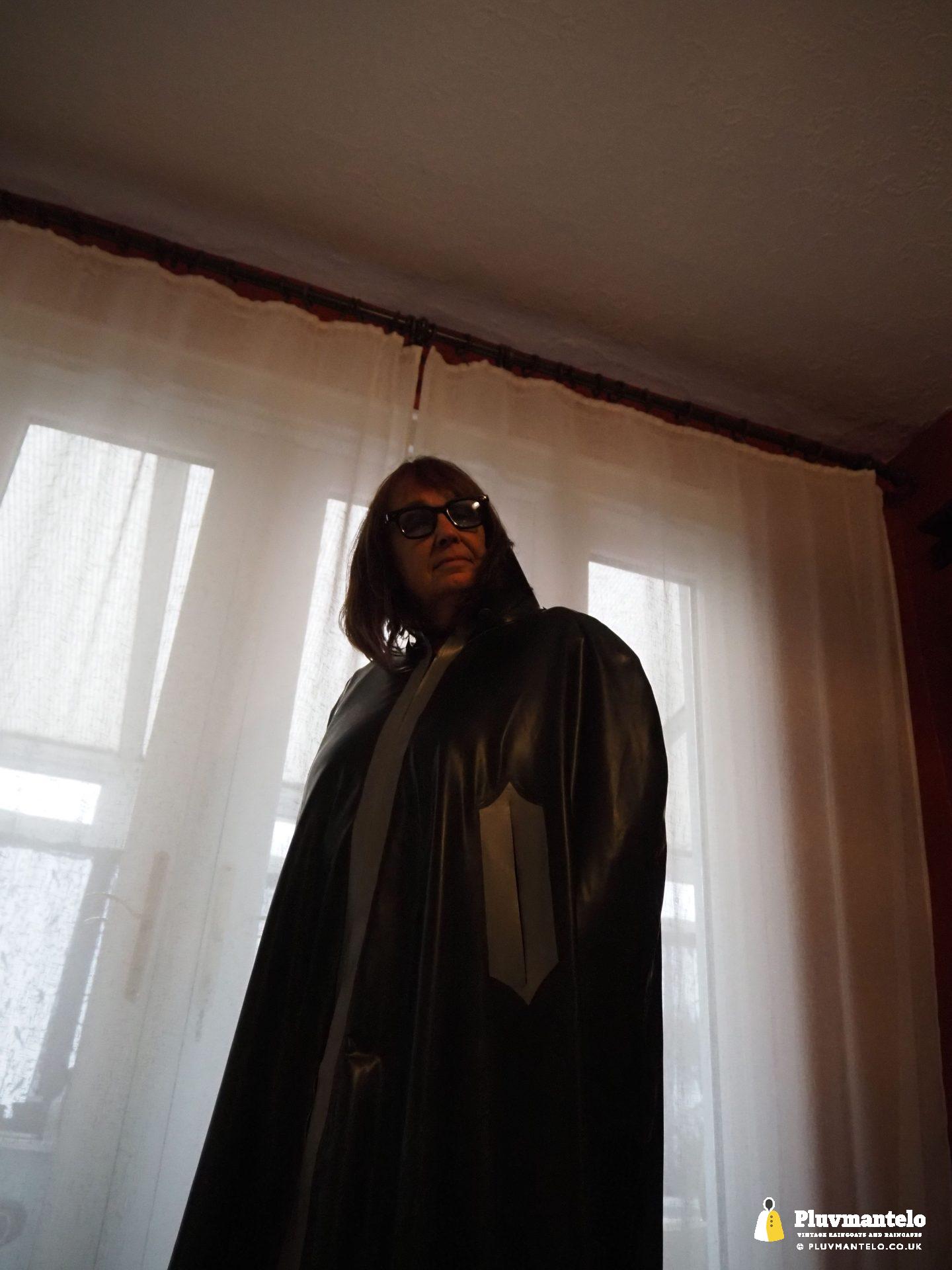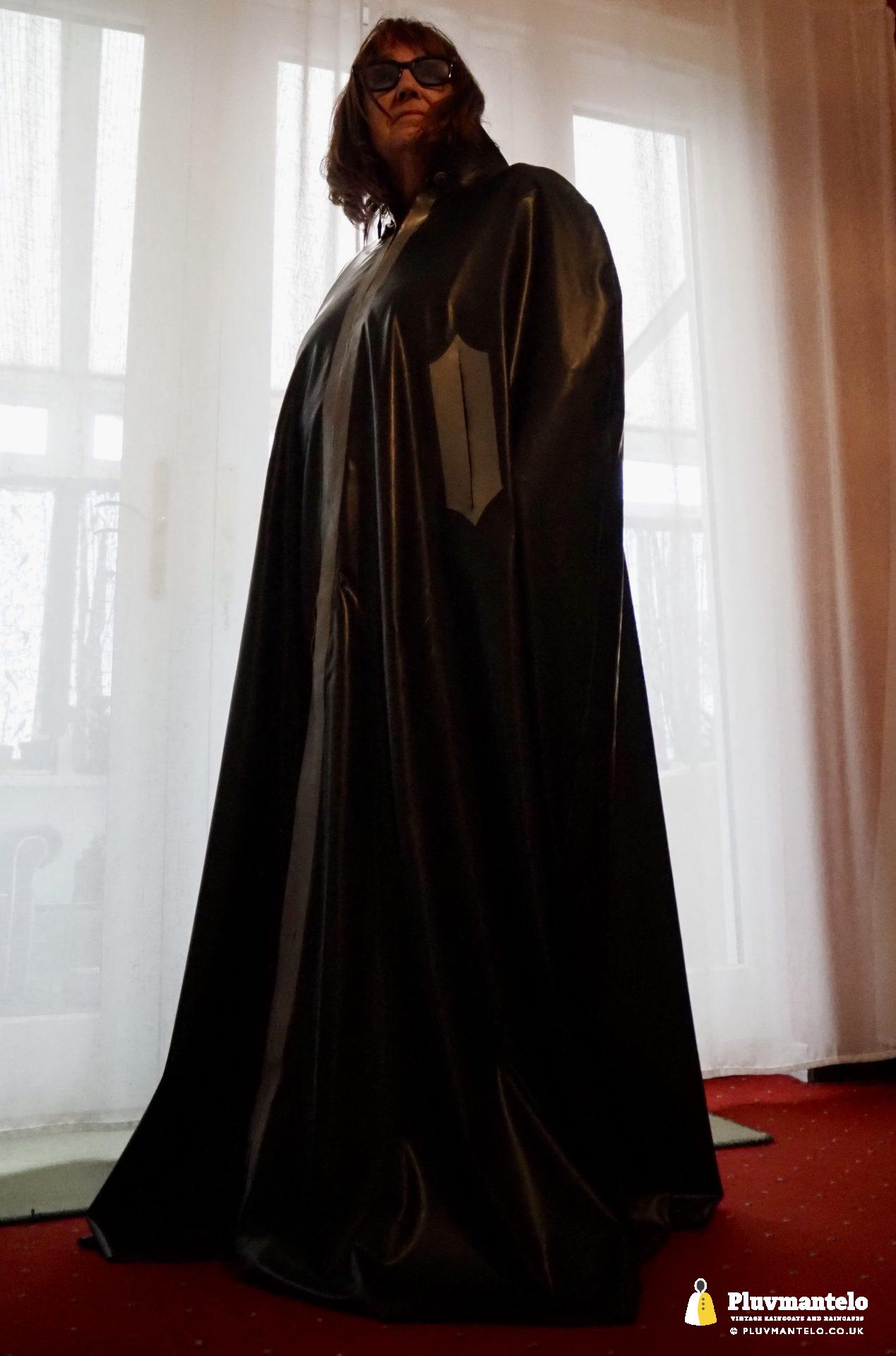 Recently Miss Pluv’ had enough of the gardening chores and decided to stay in, wearing her very long rubber cape she was going to wear outside. It’s just about the longest cape she has and over the years gardening chores have taken heir toll, but she still likes it. It’s long, it’s heavy, it has a great high collar and it sounds good when she’s walking in it: in other words, a fine cape.