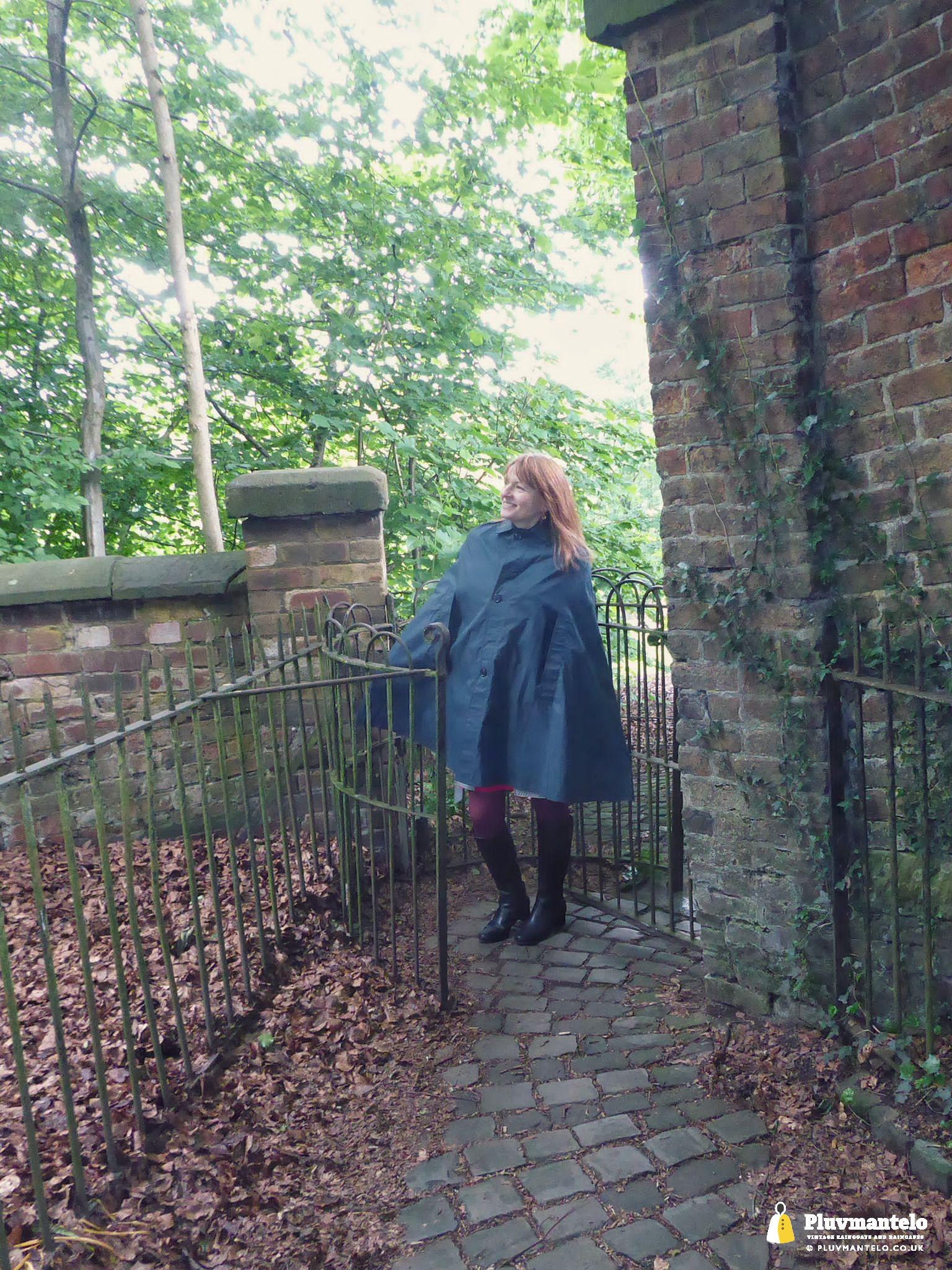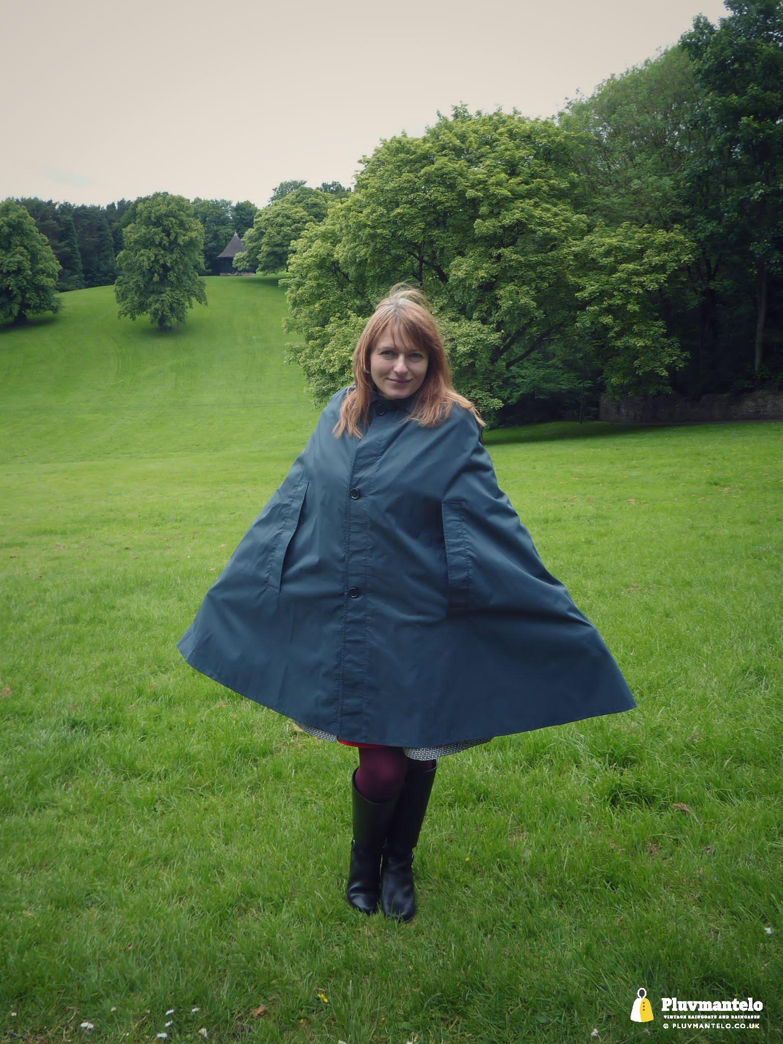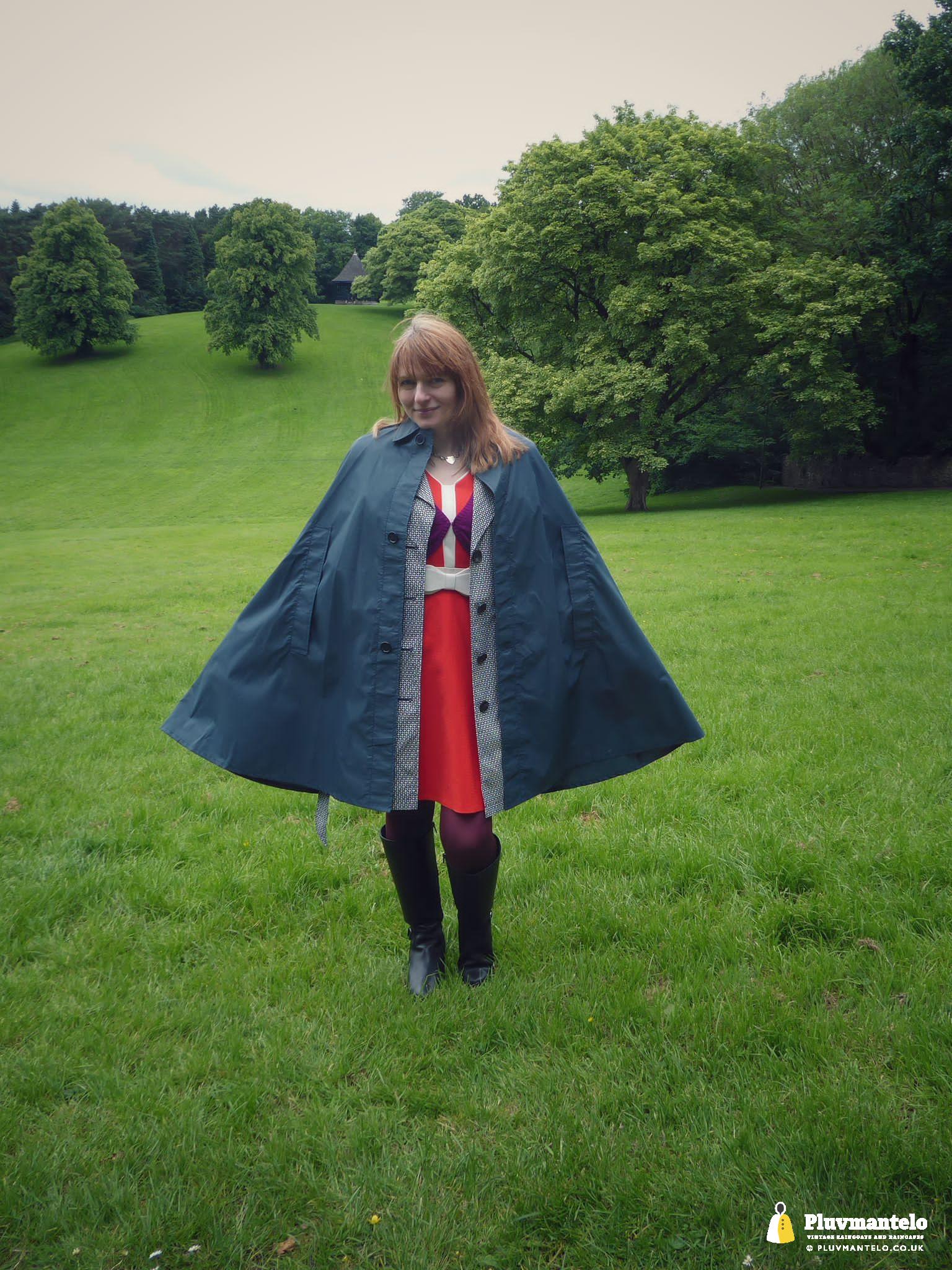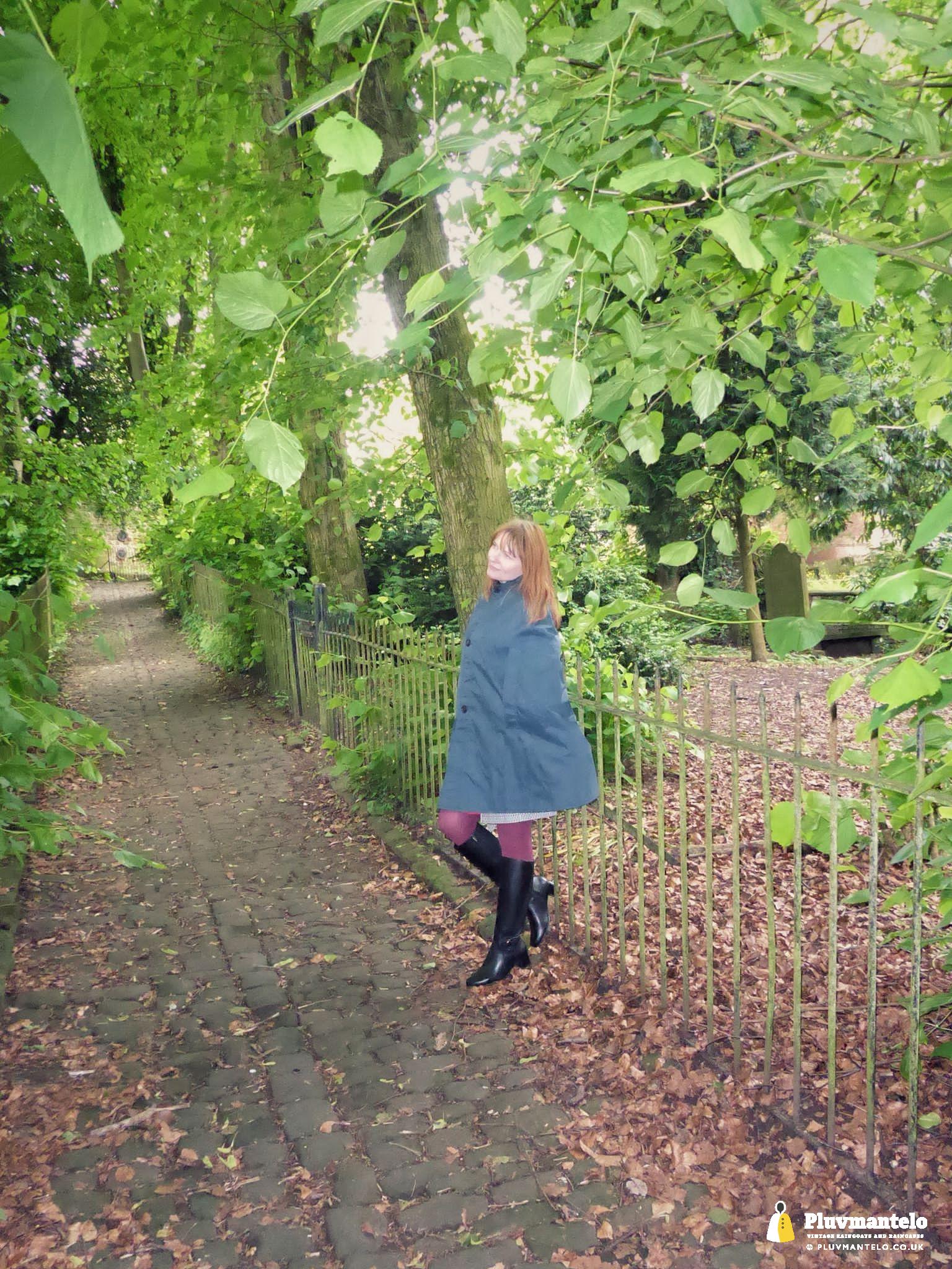 … and you might find Clair The Cape Queen enjoying an afternoon stroll. But summer hasn’t started in this part of Mercia and it’s pretty cold: it’s been raining a fair bit too, so Clair’s afternoon walk involved her fine 1960s dark blue American nylon number once again.