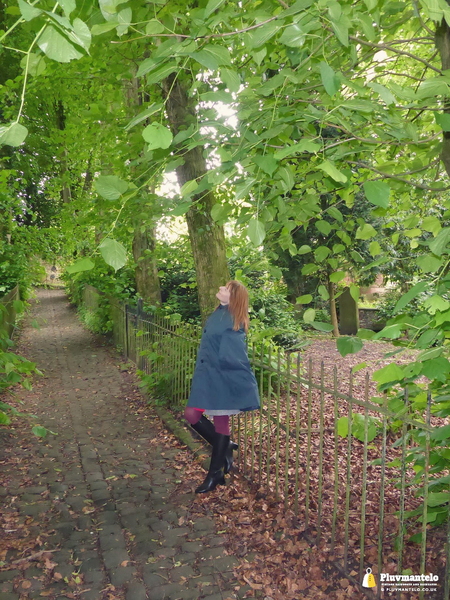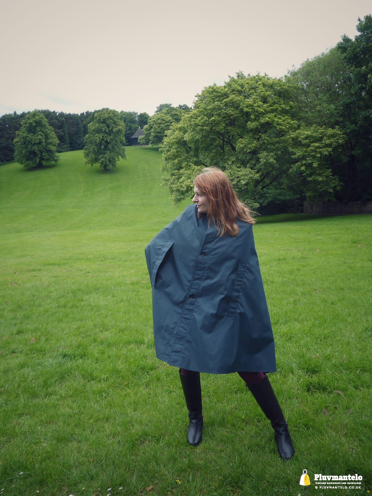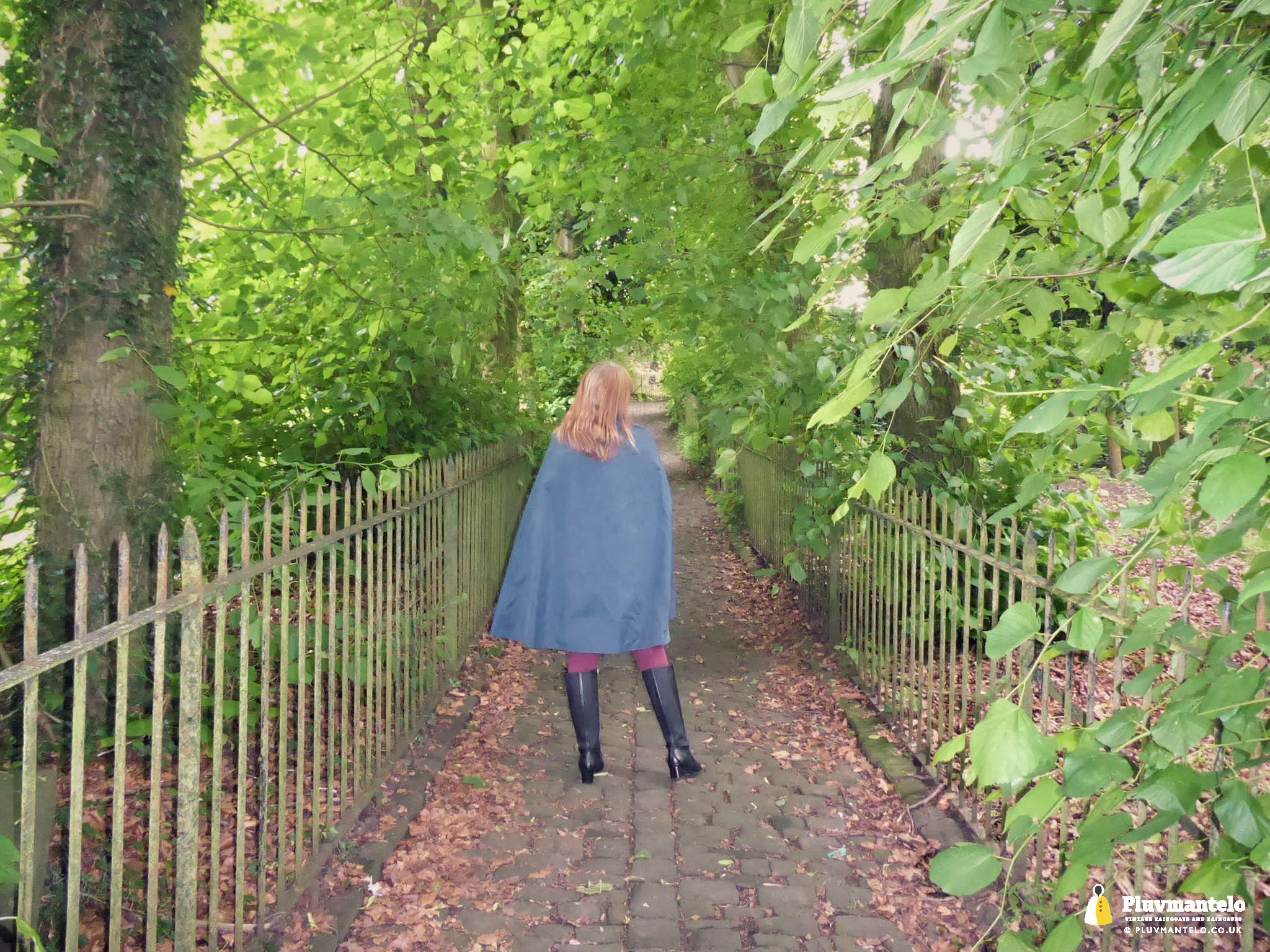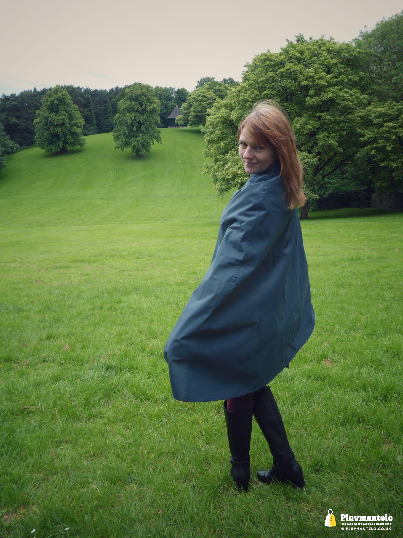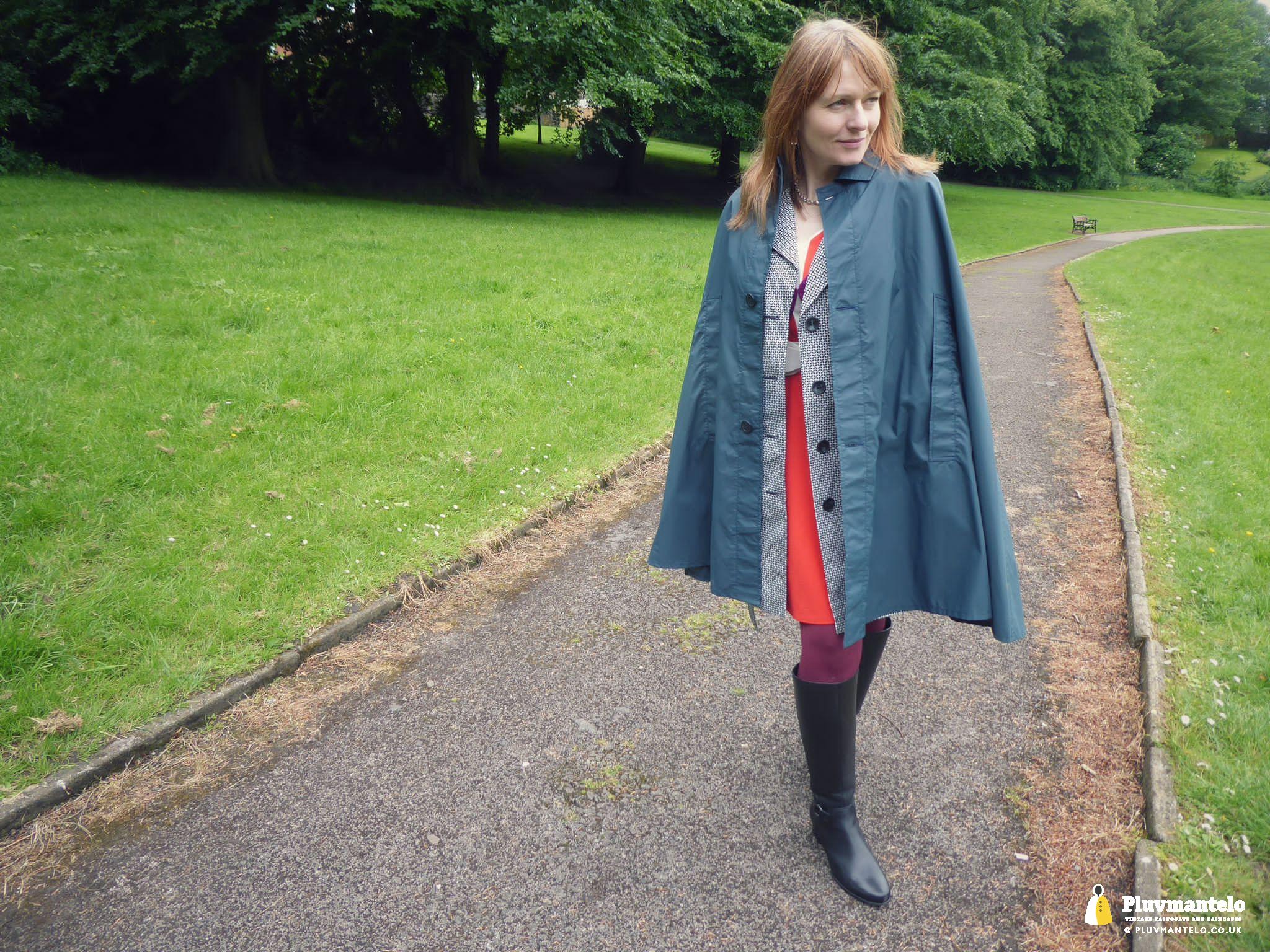 … and you might find Clair The Cape Queen enjoying an afternoon stroll. But summer hasn’t started in this part of Mercia and it’s pretty cold: it’s been raining a fair bit too, so Clair’s afternoon walk involved her fine 1960s dark blue American nylon number once again.