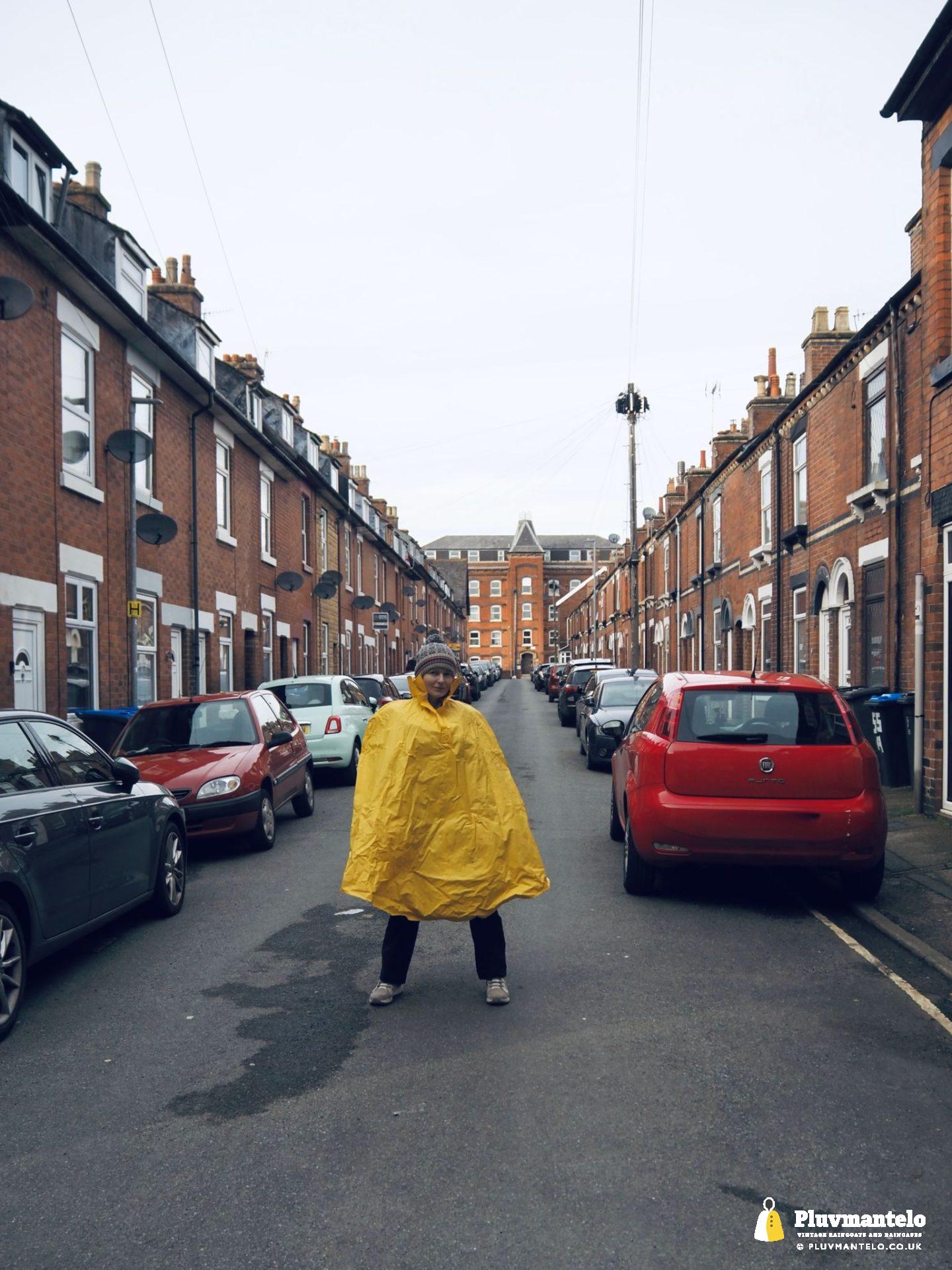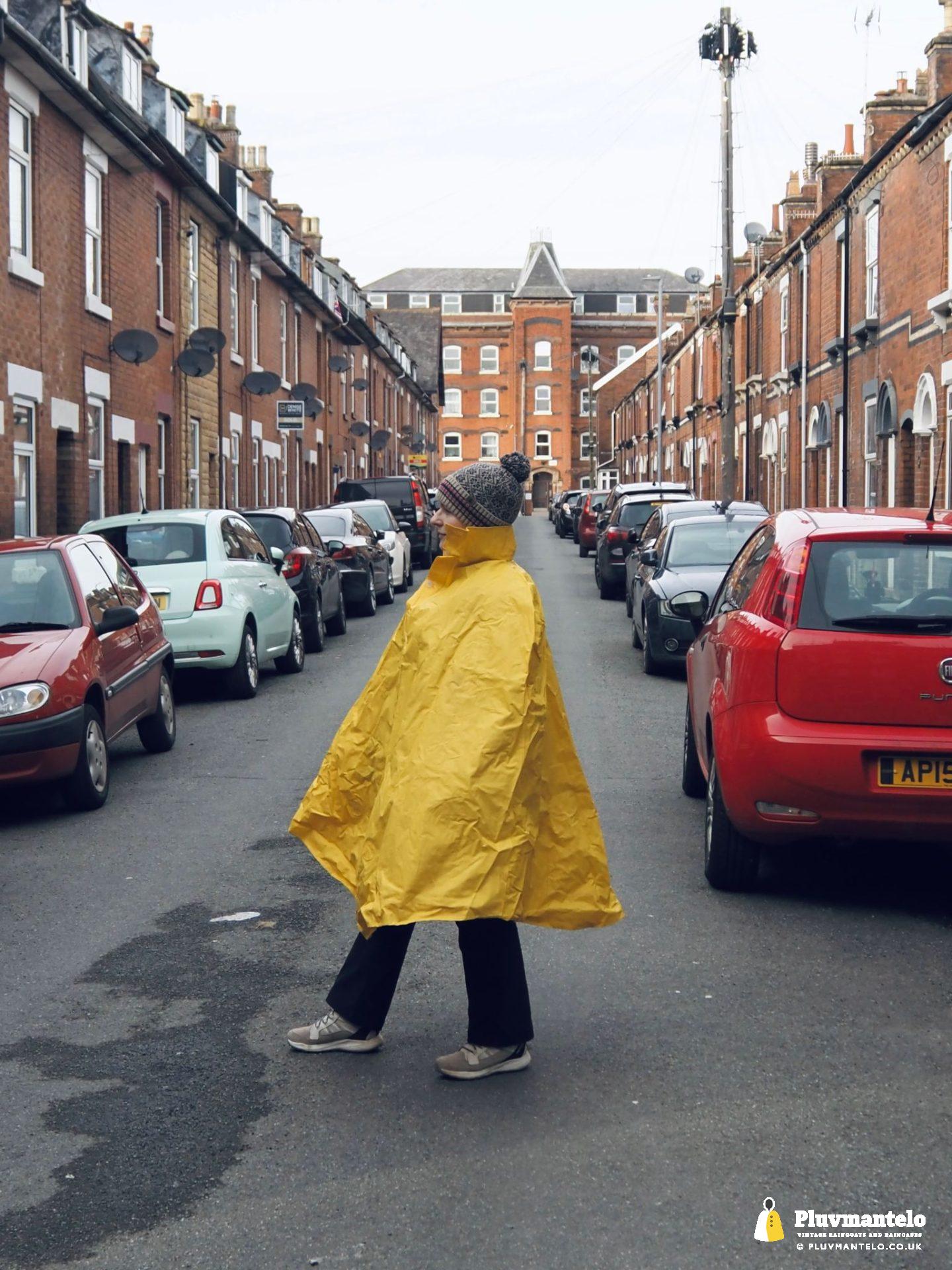 After the red, the yellow, as The Cape Queen donned an old-school cycle cape to thwart the showers that decided to descend on a Mercia town. Luckily the shopping trip was delayed by a matter of seconds as Clair put her cape on.