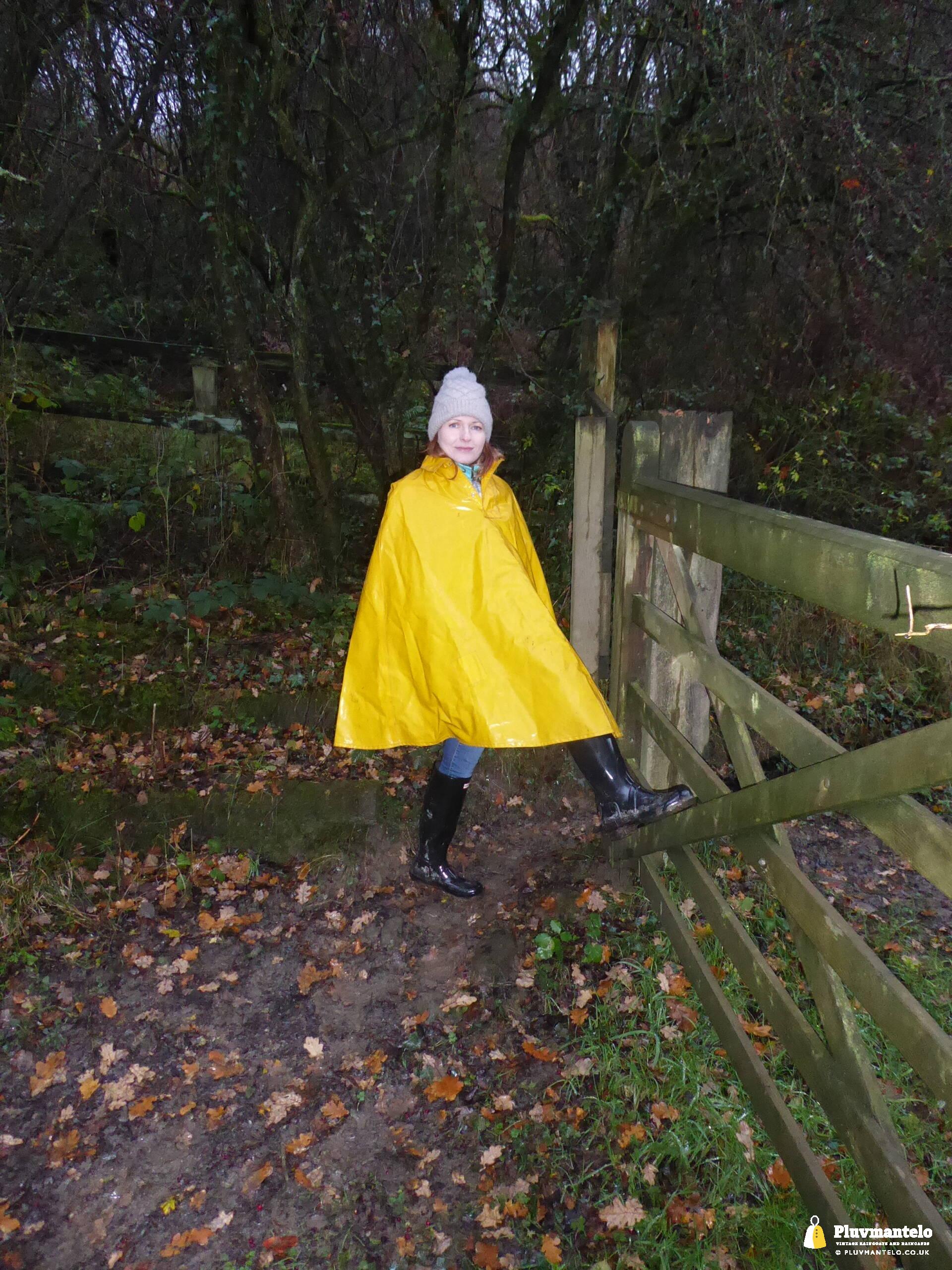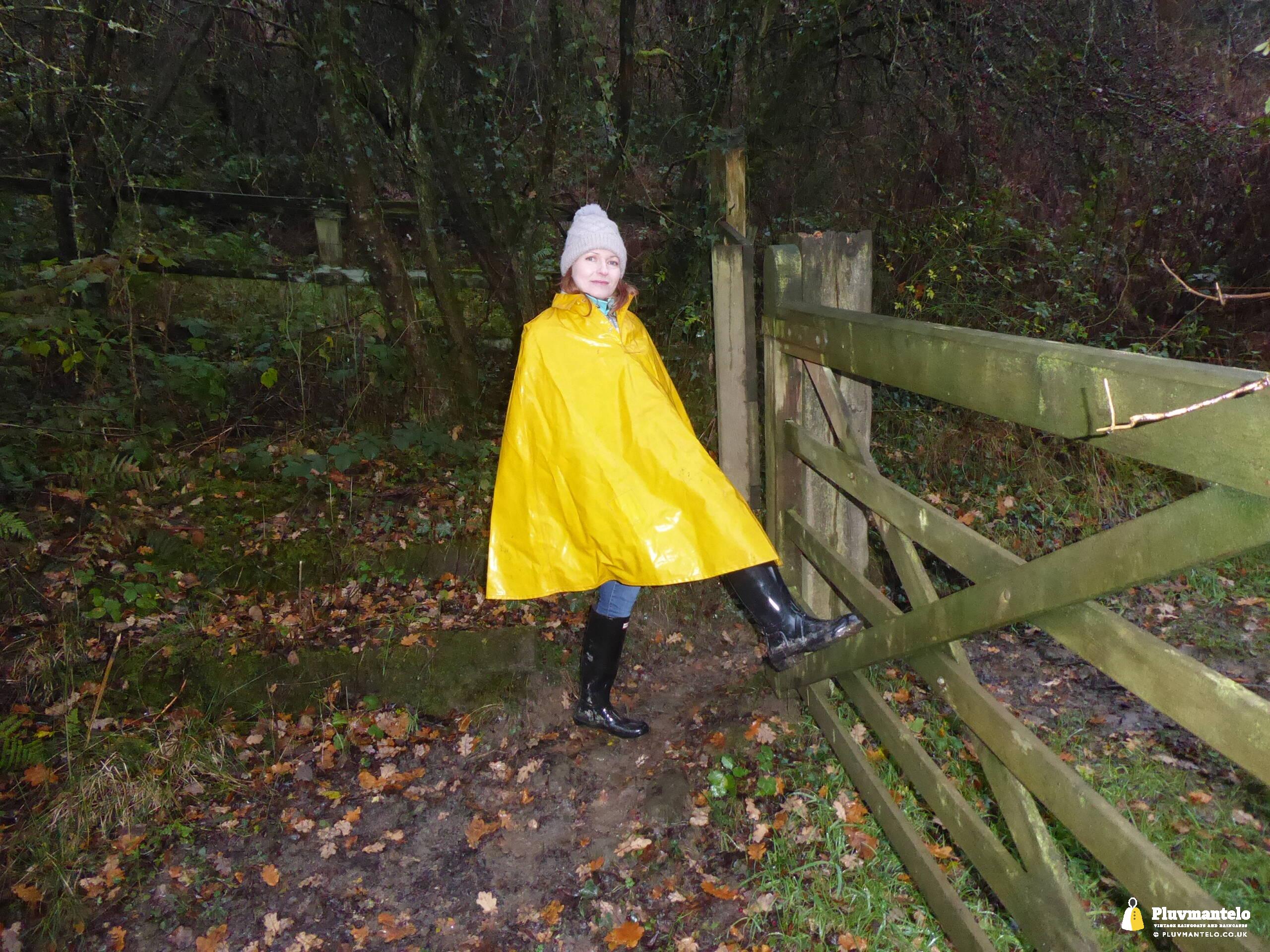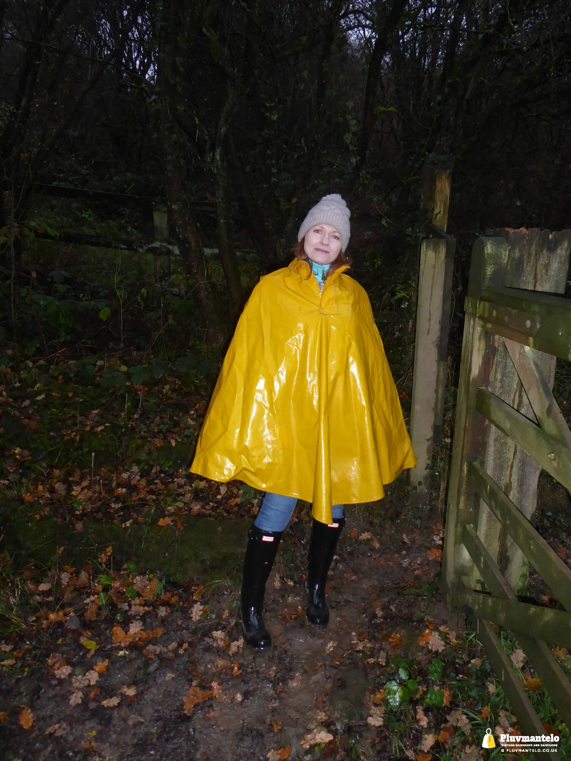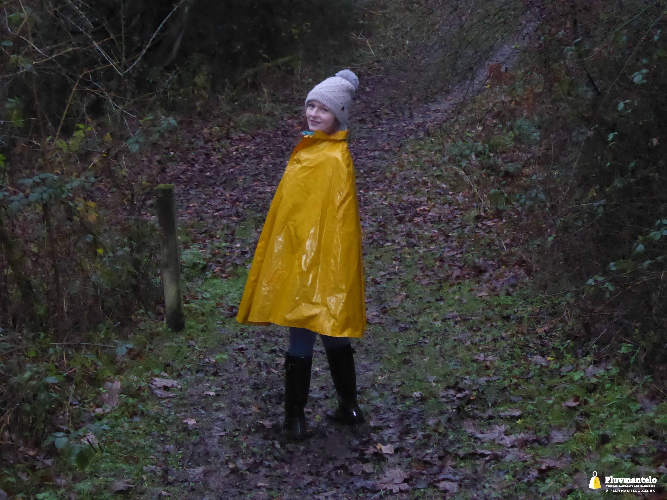 As a watery sun went down on deepest Mercia Clair The Cape Queen brought some much-needed colourful cape cheer to the late afternoon. This time it was with her old – we think 1960s – oilskin cycle cape. The cape has aged well and way better than other oilskin ones in the Pluvmantelo collection and Clair really enjoyed wearing it, especially with a pair of glossy black Hunters and a typically Cape Queen bobble hat. The look’s unsurpassed in our eyes: what do you think?