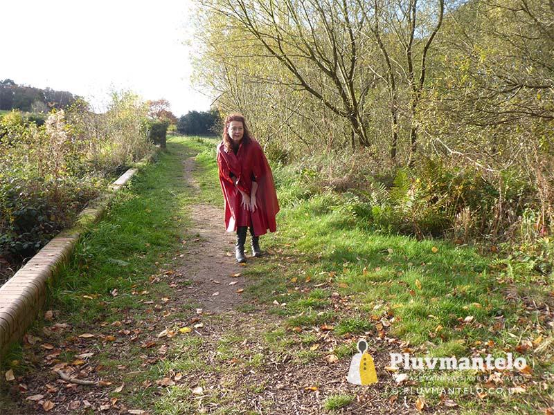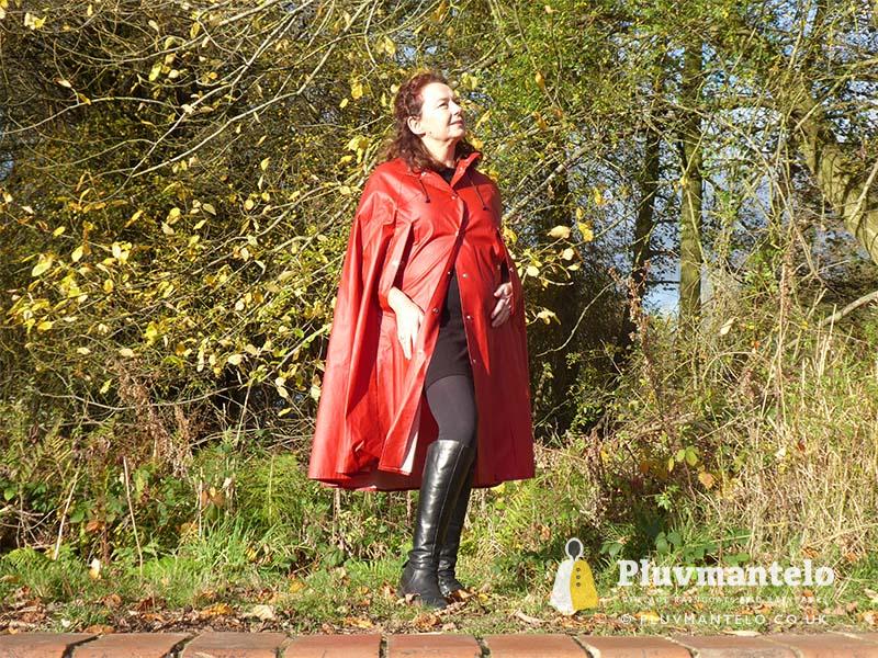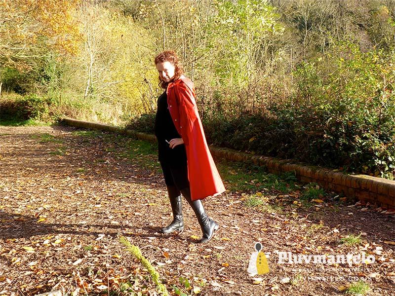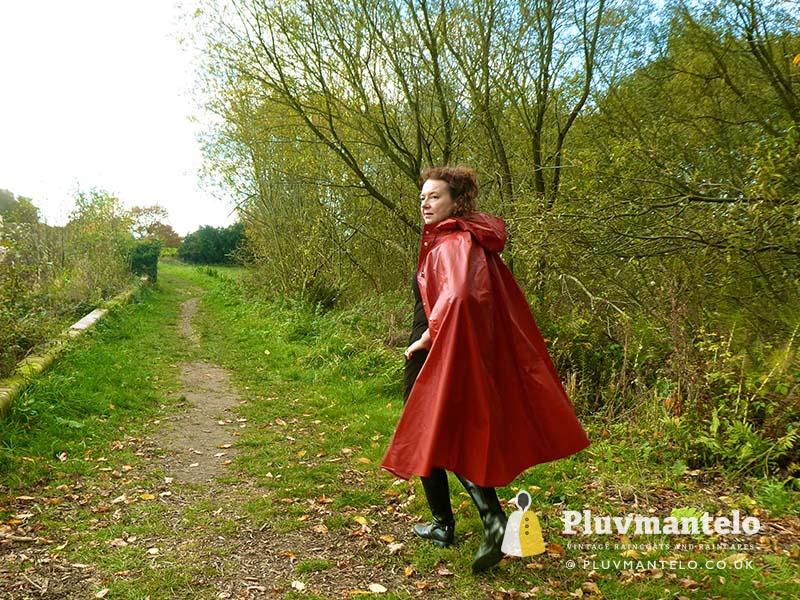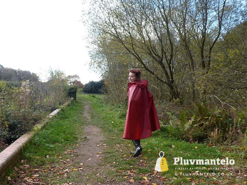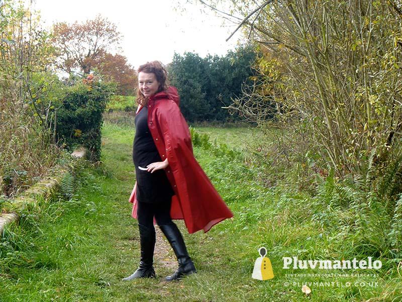 When it comes to classic rain capes is there a more valued name than Rukka? Their quality means even older ones hold their value but they’re more easily found than a Bormax cape, whose prices are way higher. Here we see Veronica wearing one of several Rukka capes from the Pluvmantelo collection. Its decent, homely dark red suited the leaf-carpeted wooded location we used on the England/Wales border and Veronica clearly loved wearing it. The cape’s still in remarkably good order despite being more than 30 years and given a chance Veronica would probably have taken it home…