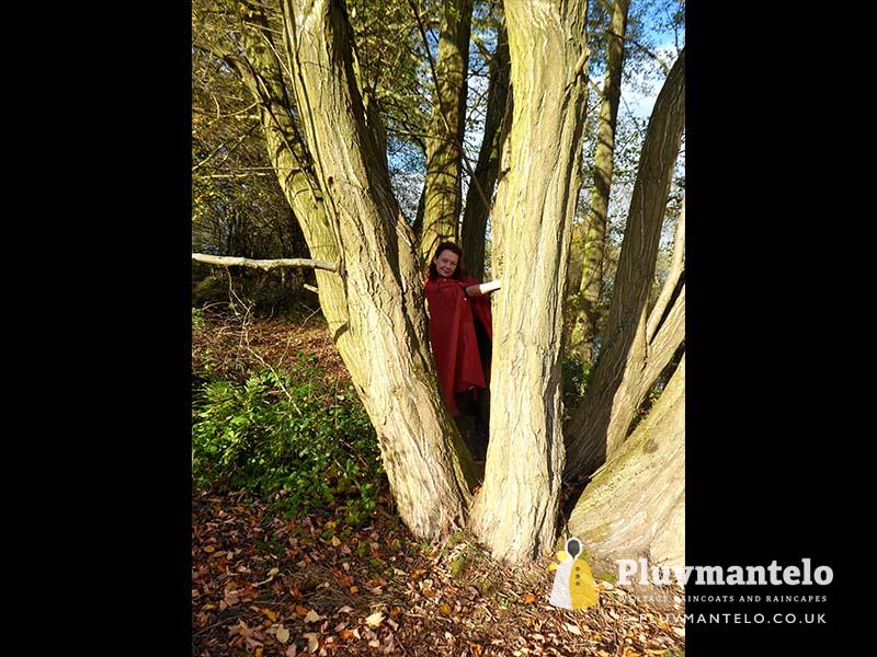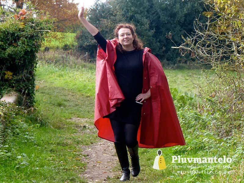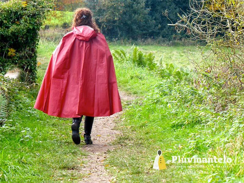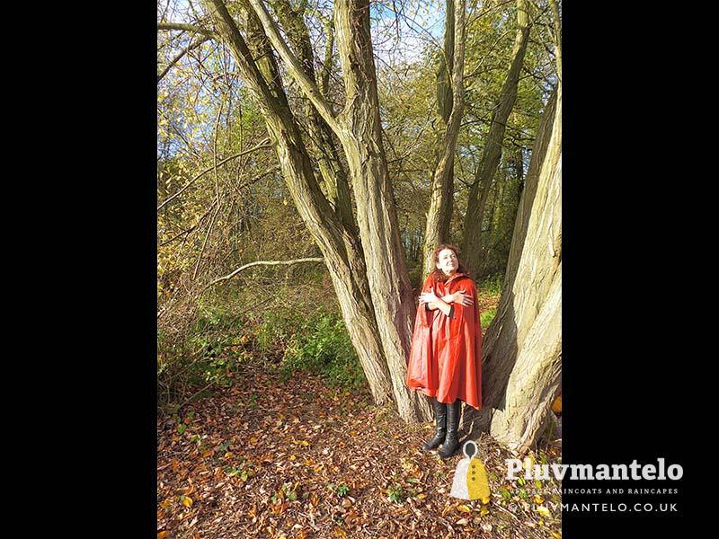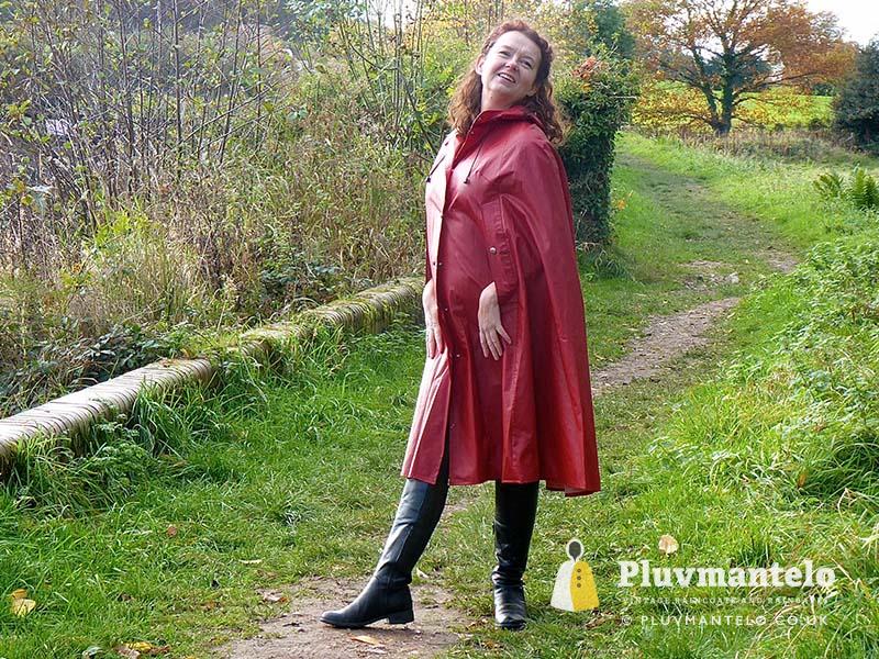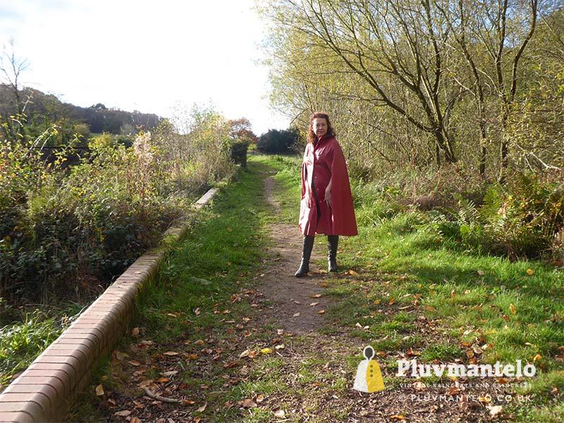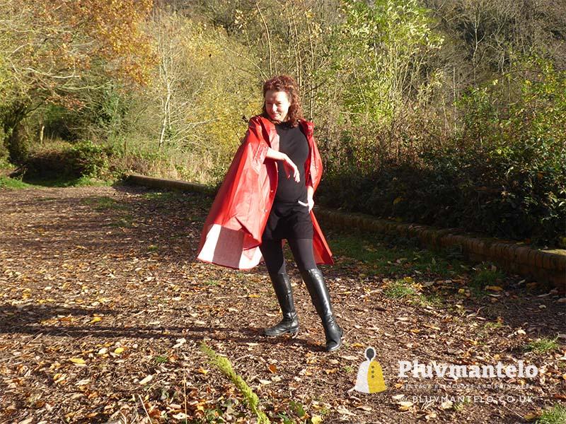 When it comes to classic rain capes is there a more valued name than Rukka? Their quality means even older ones hold their value but they’re more easily found than a Bormax cape, whose prices are way higher. Here we see Veronica wearing one of several Rukka capes from the Pluvmantelo collection. Its decent, homely dark red suited the leaf-carpeted wooded location we used on the England/Wales border and Veronica clearly loved wearing it. The cape’s still in remarkably good order despite being more than 30 years and given a chance Veronica would probably have taken it home…