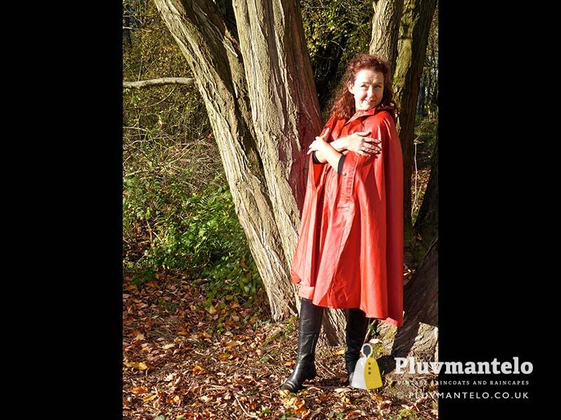When it comes to classic rain capes is there a more valued name than Rukka? Their quality means even older ones hold their value but they’re more easily found than a Bormax cape, whose prices are way higher. Here we see Veronica wearing one of several Rukka capes from the Pluvmantelo collection. Its decent, homely dark red suited the leaf-carpeted wooded location we used on the England/Wales border and Veronica clearly loved wearing it. The cape’s still in remarkably good order despite being more than 30 years and given a chance Veronica would probably have taken it home…