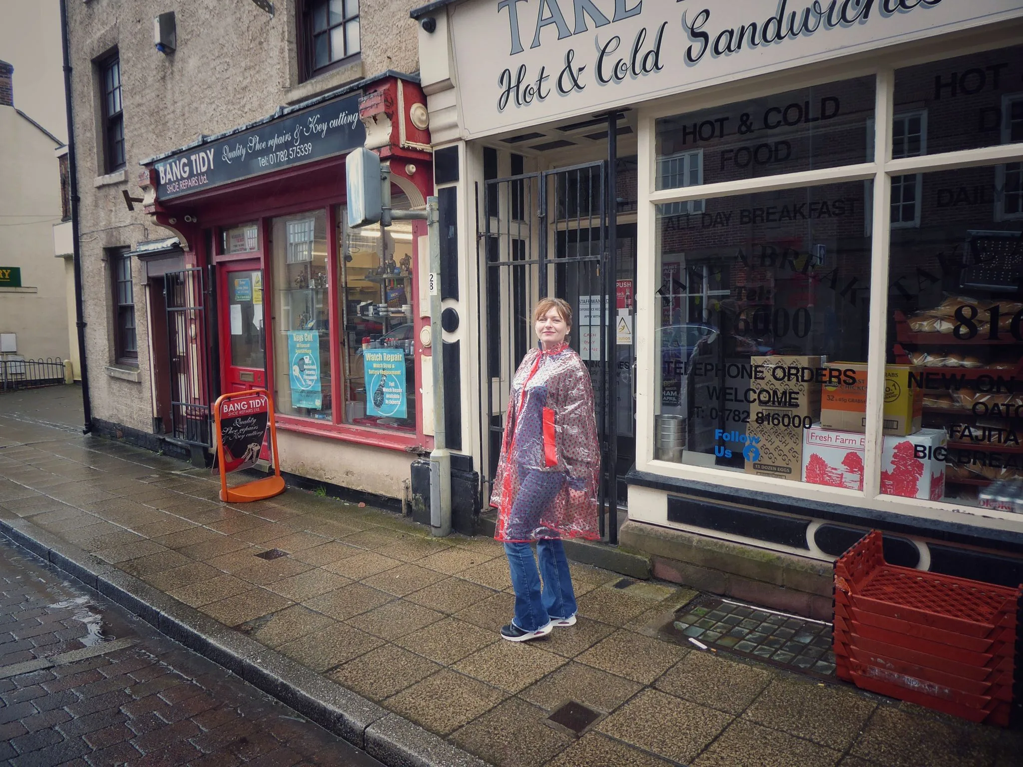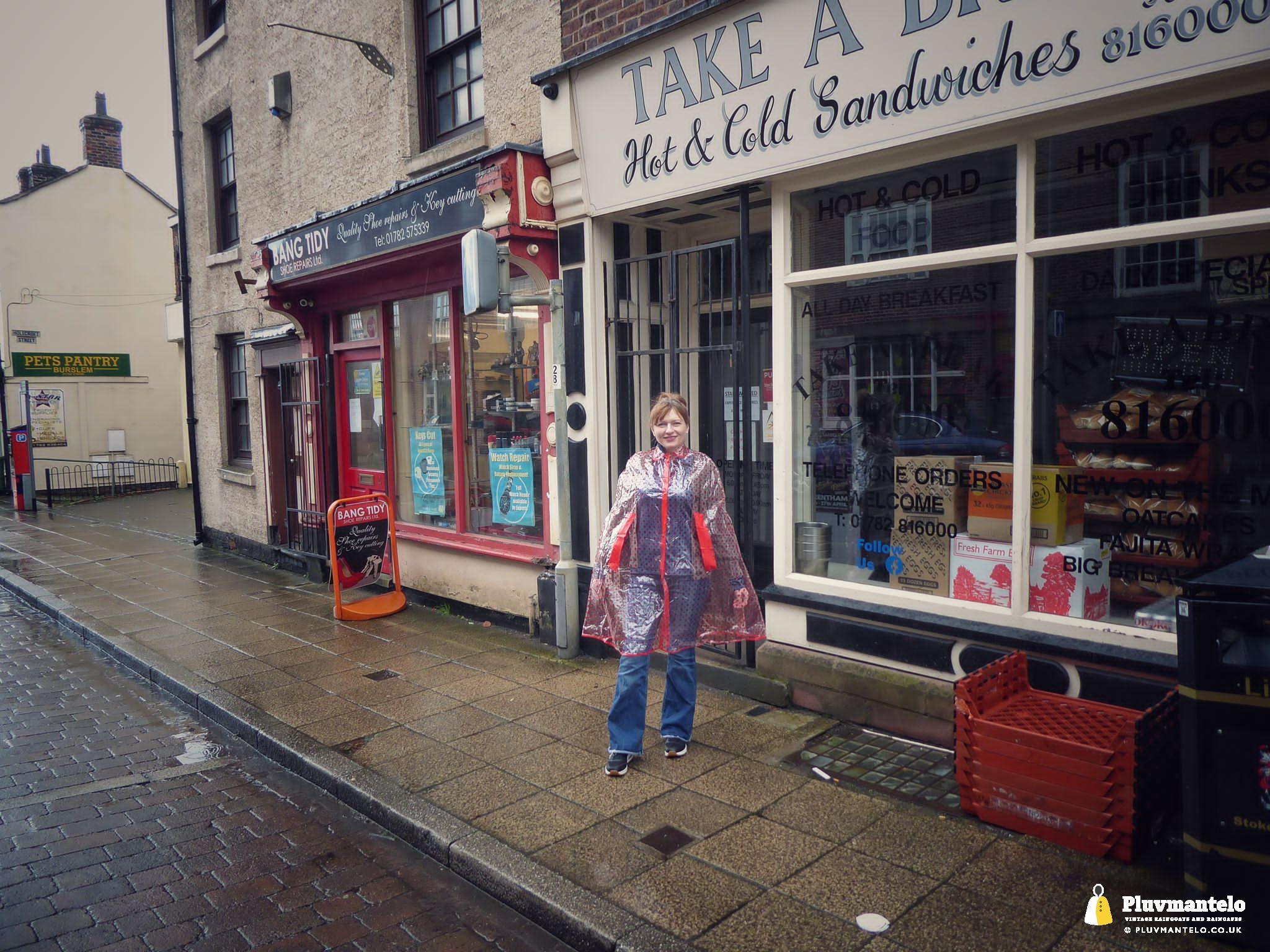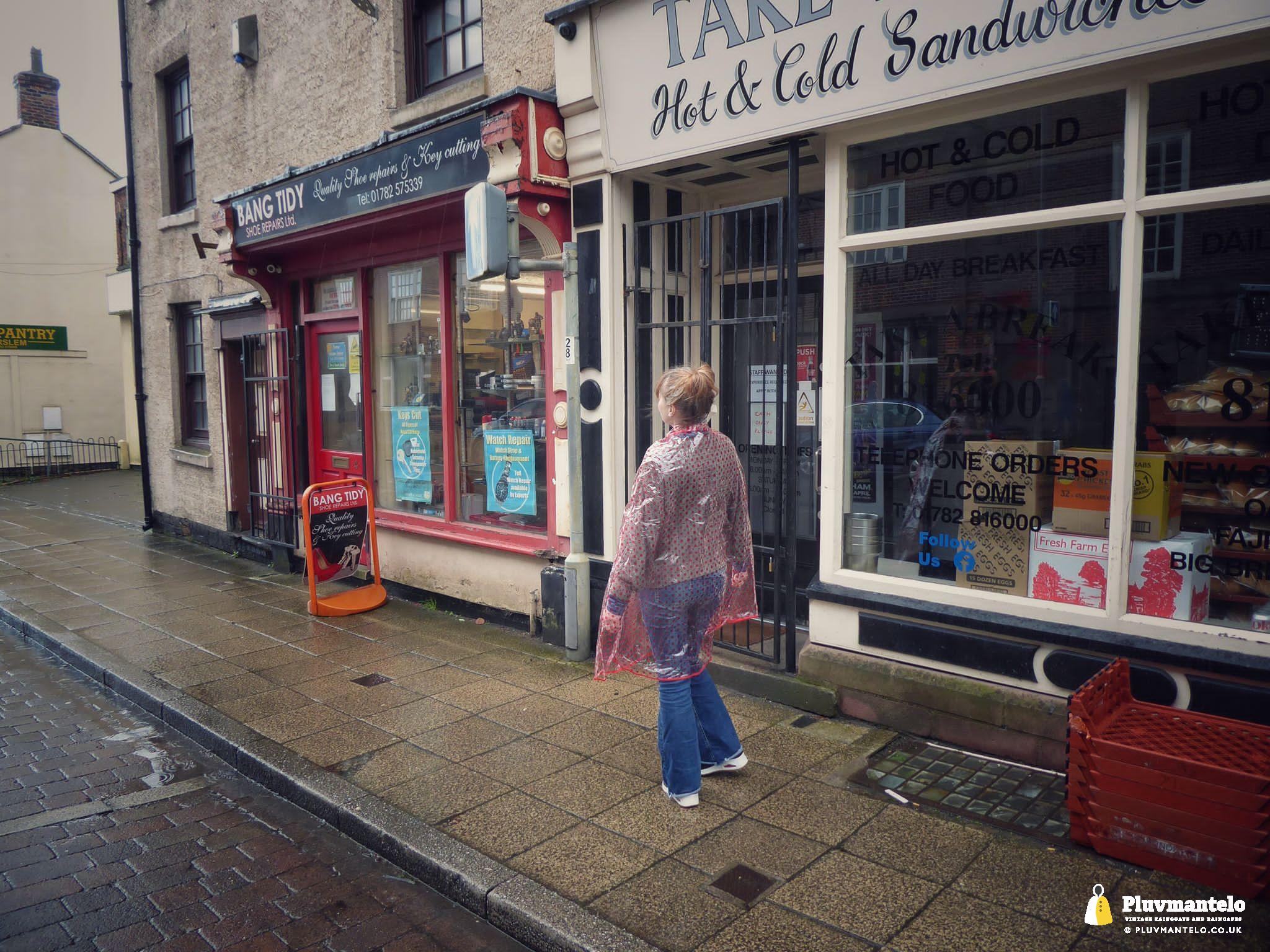 A rainy day’s shopping meant Clair The Cape Queen had to go suitably attired: what better than her recently-bought (from the USA no less) new-old-stock polka dot pvc cape? Such raincape finery cut a dash on the wet streets and while there was nobody about when we took these pics she’d certainly turned heads earlier.