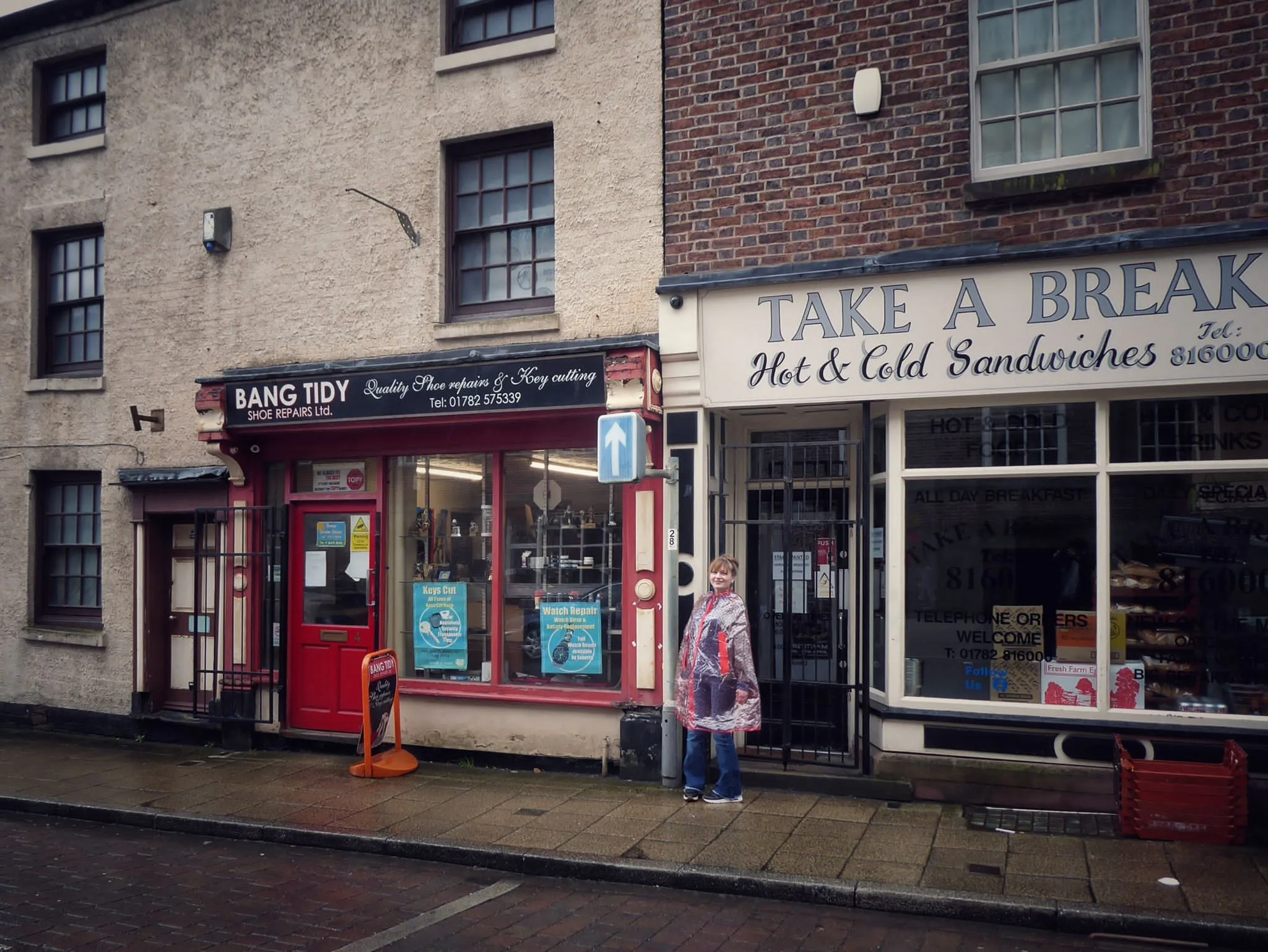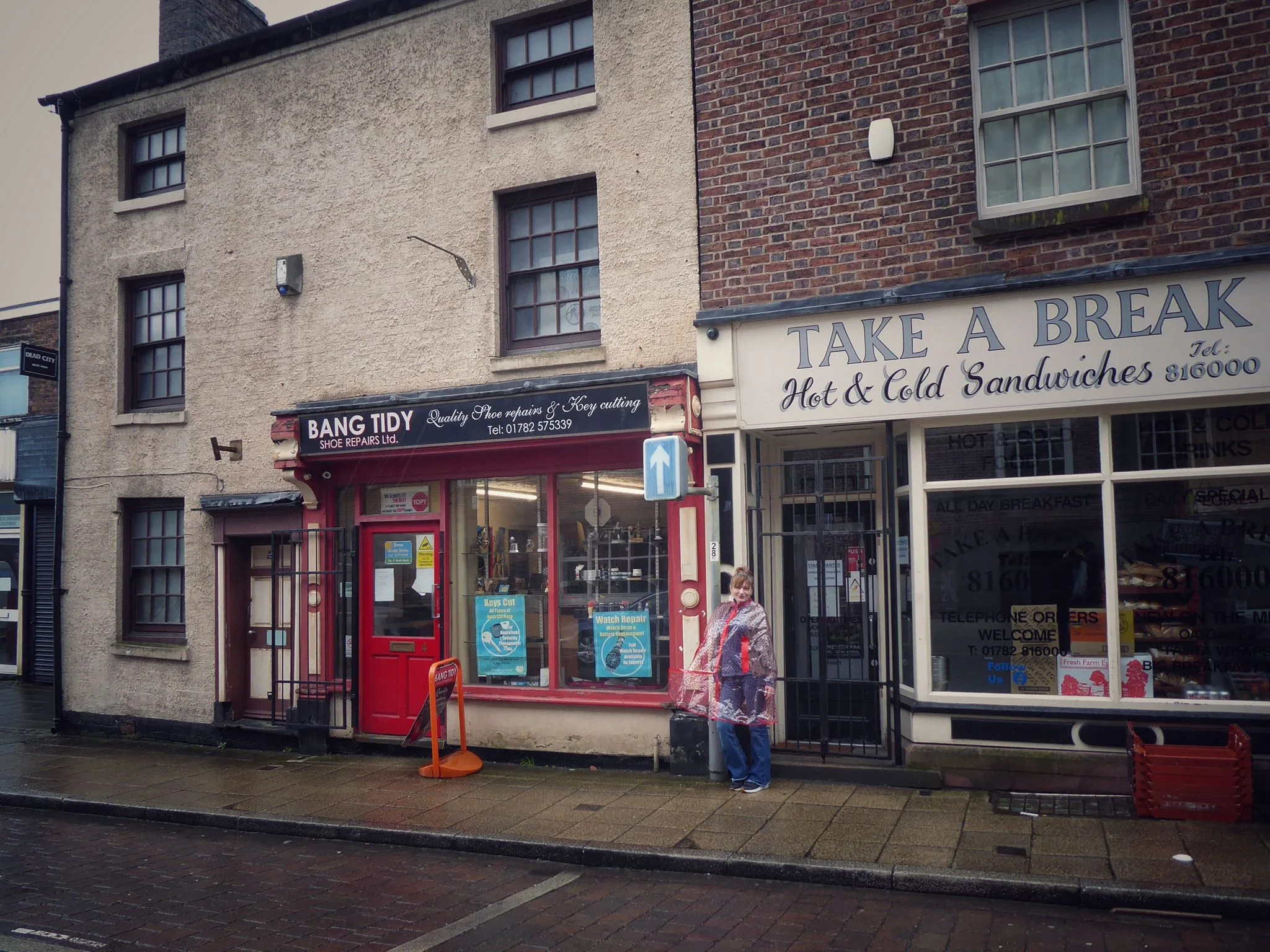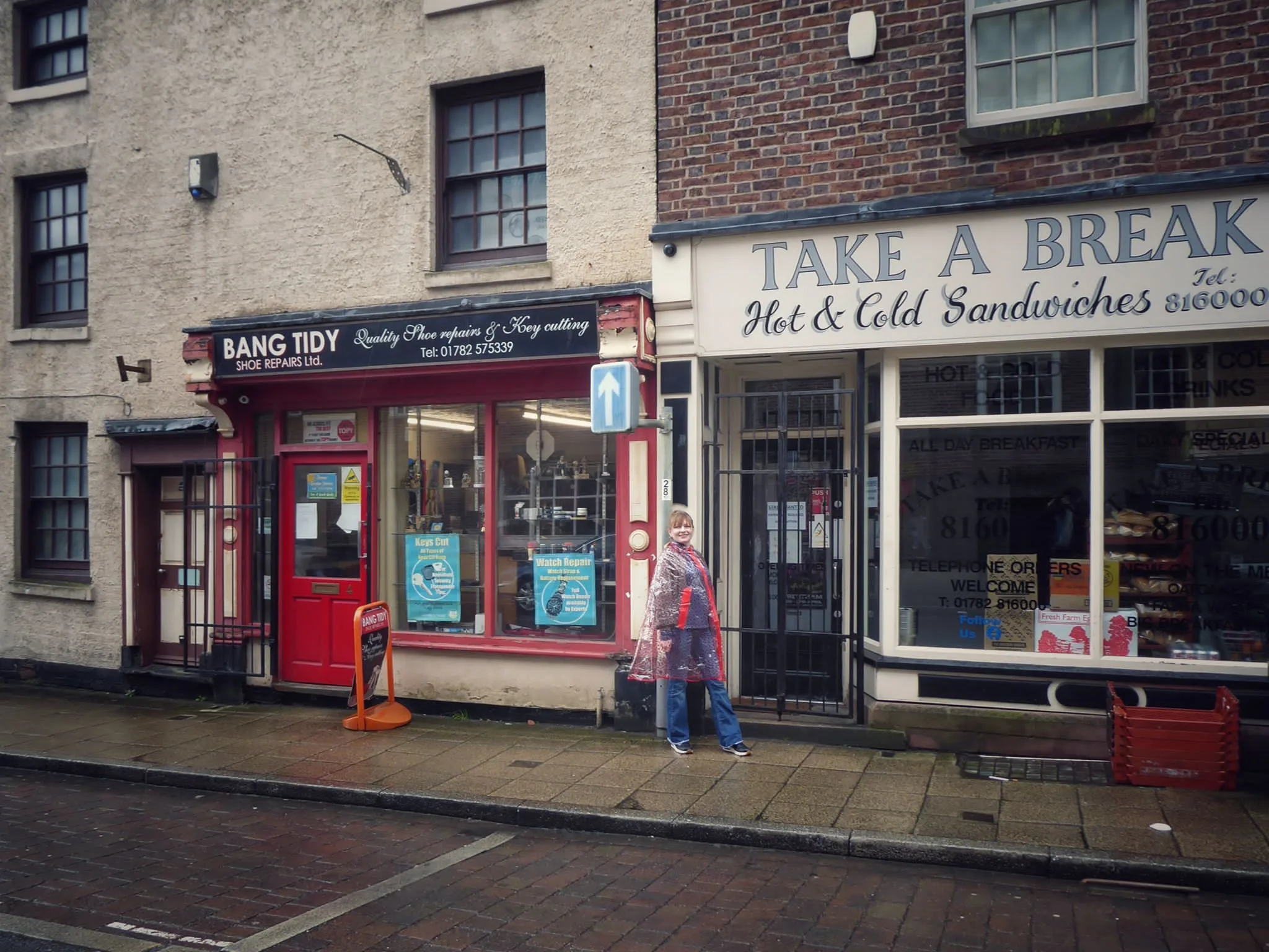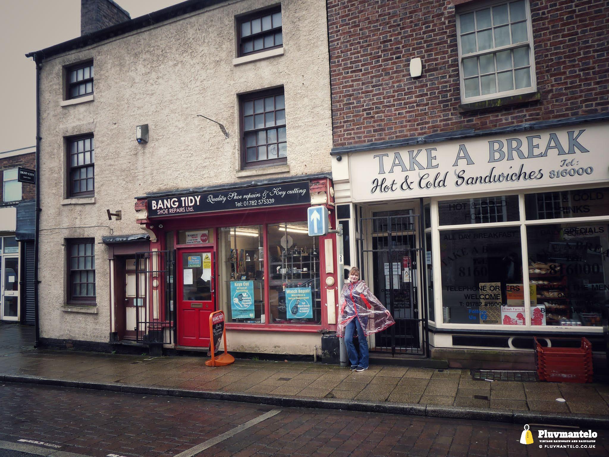 A rainy day’s shopping meant Clair The Cape Queen had to go suitably attired: what better than her recently-bought (from the USA no less) new-old-stock polka dot pvc cape? Such raincape finery cut a dash on the wet streets and while there was nobody about when we took these pics she’d certainly turned heads earlier.