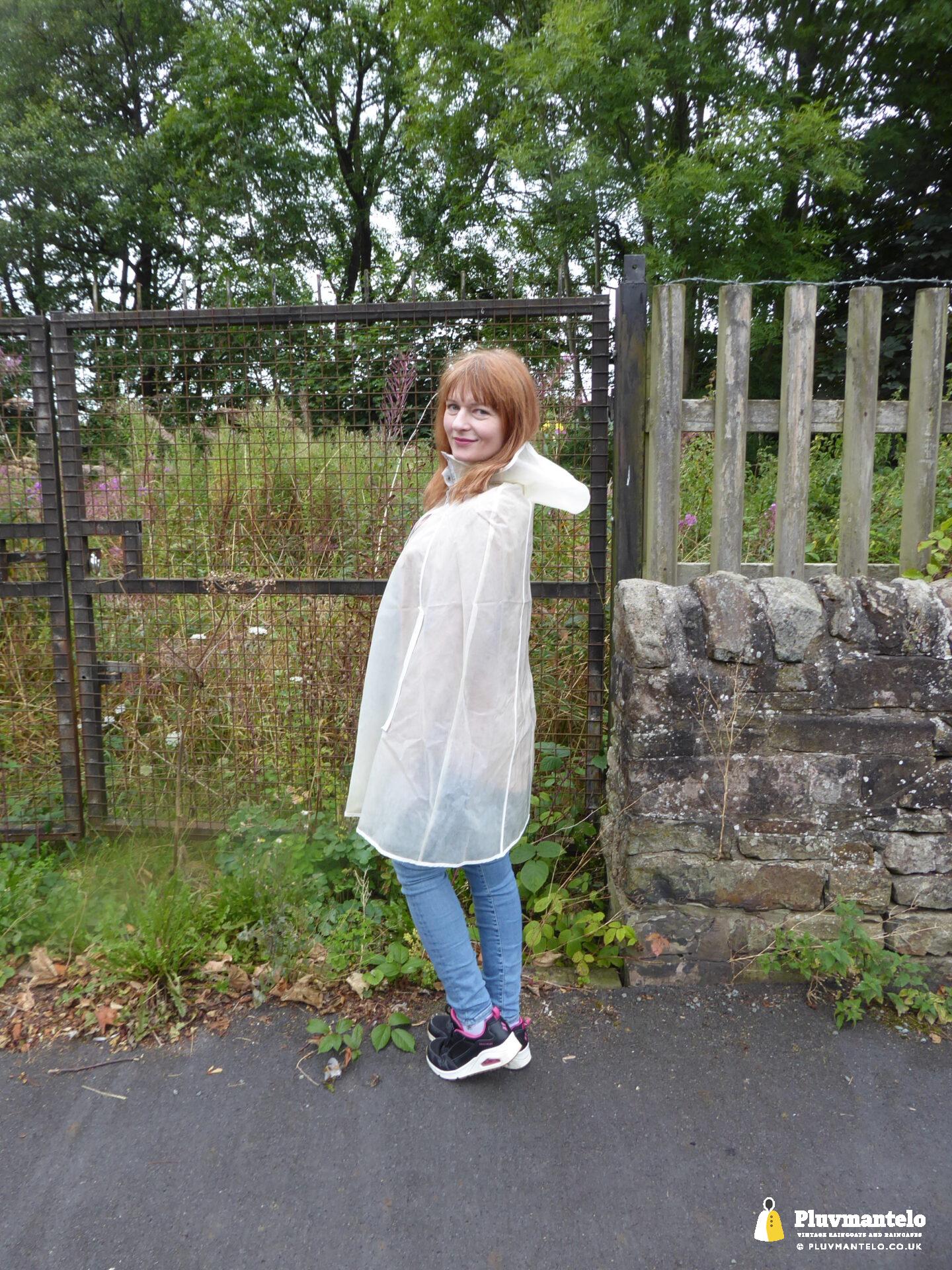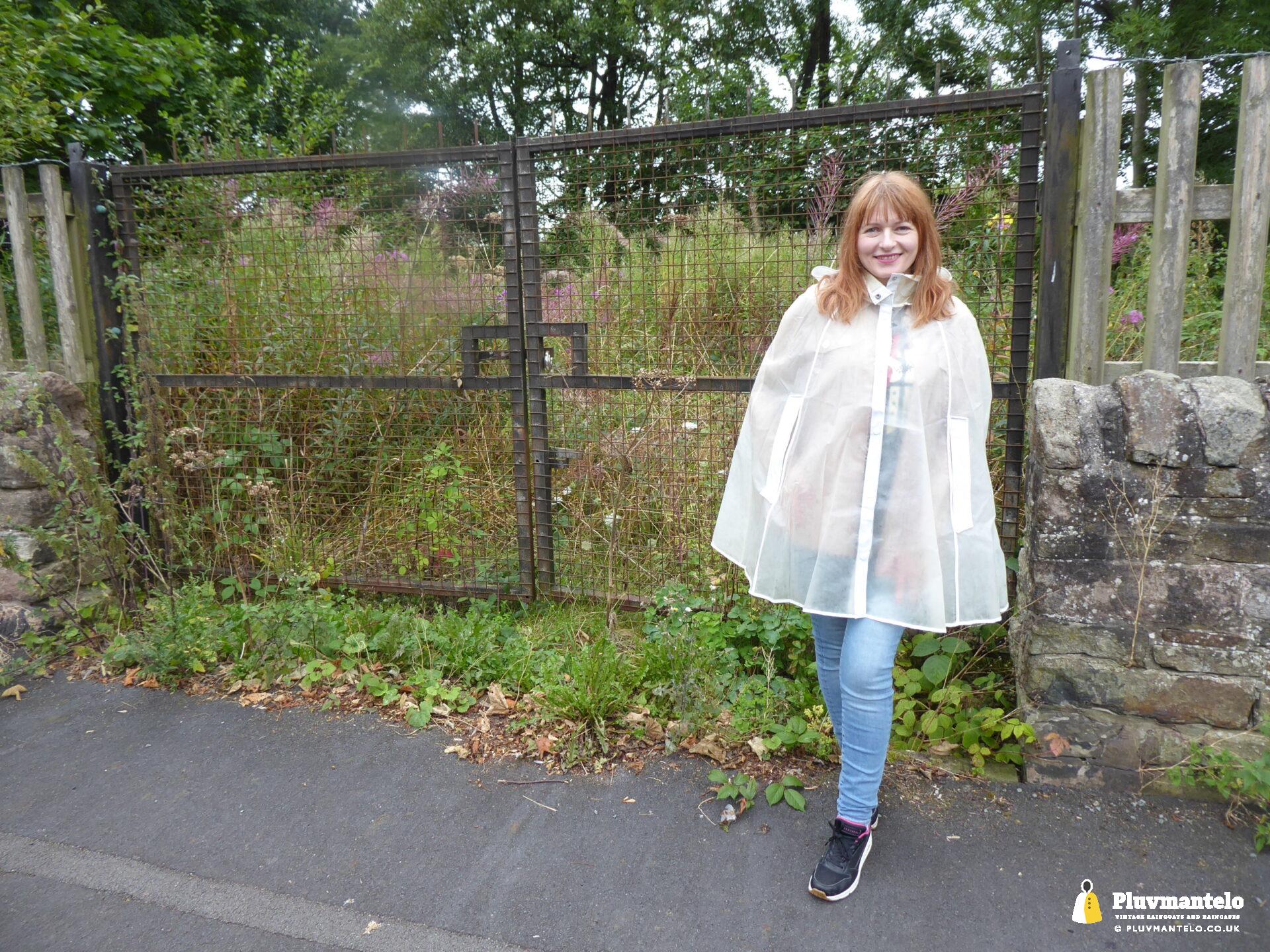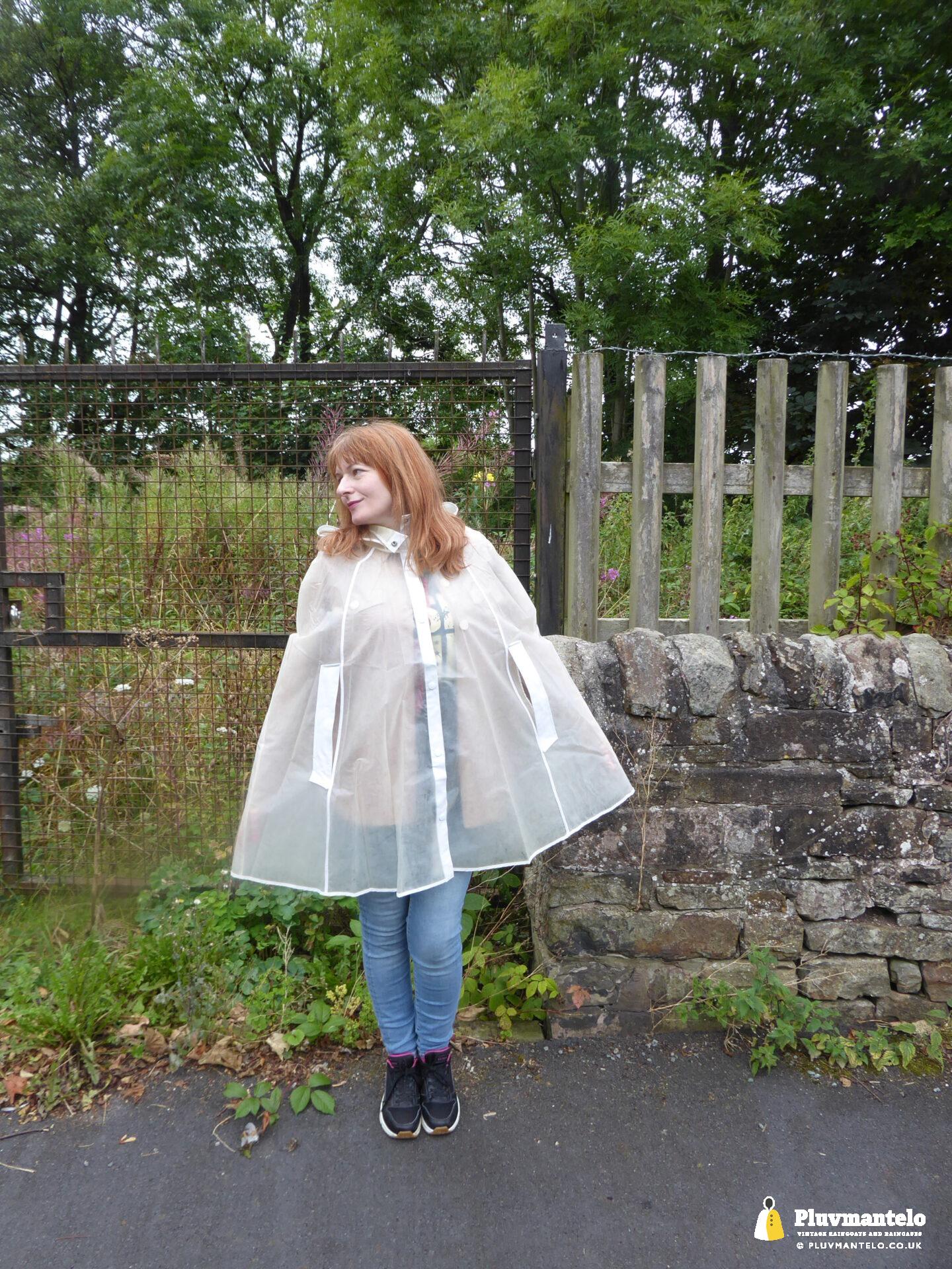 There’s something about a clear cape and Clair The Cape Queen’s been keeping dry during Mercia’s recent rather wet weather. This cape – one that’s ideal for going to the shops in – is quite heavy and it’s not entirely clear, its more ‘foggy’material giving it an almost silver look. And it has a hood: rain? Who cares? The Cape Queen doesn’t!