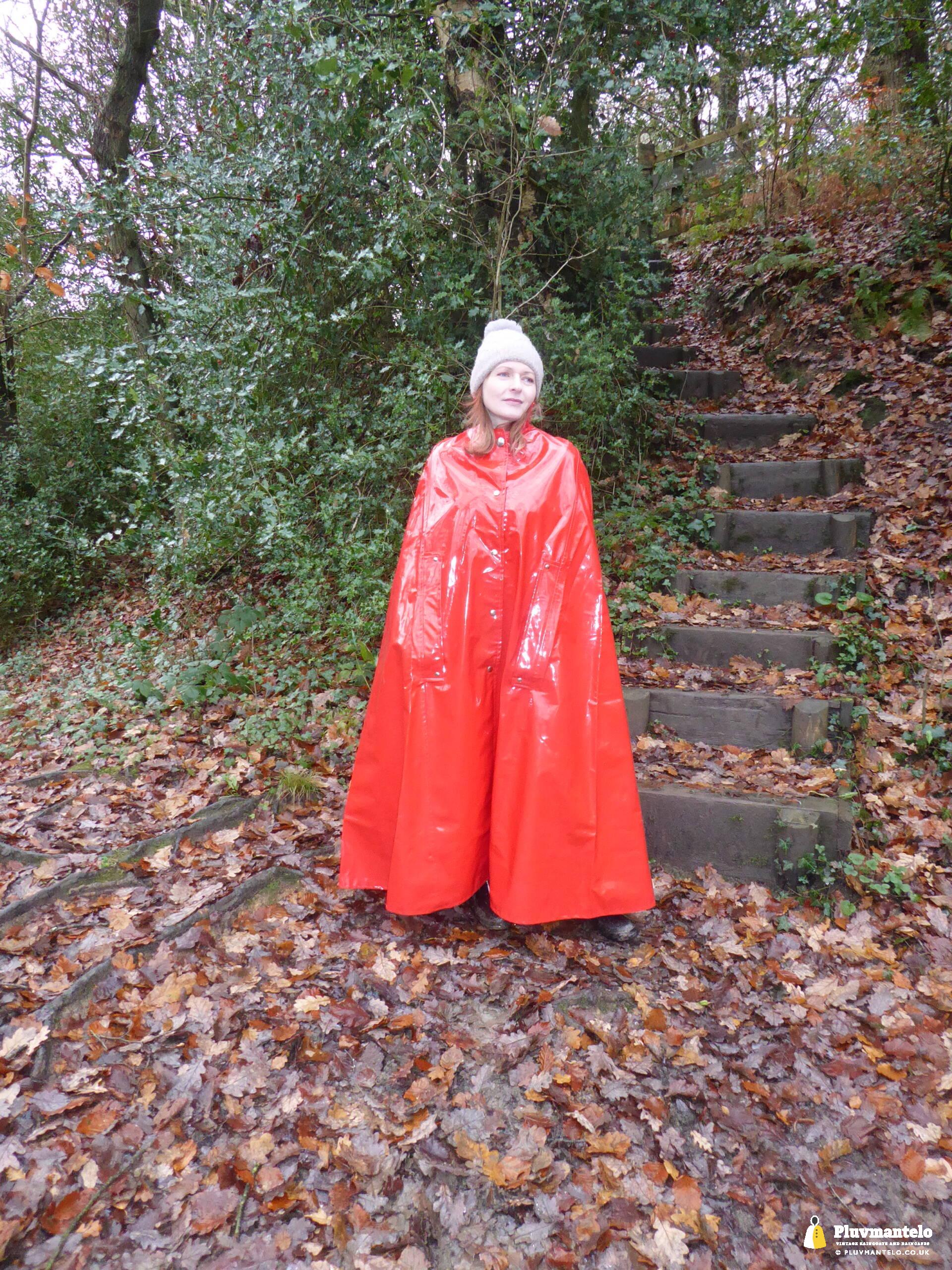 Dear Clair, the Cape Queen. You have a beautifull red and long cape. I love it. It’s splendid. You are merveillous when you wear it. Personnaly, I have about 7 or 8 capes or pelerine. Thèse which I prefere are a blue vinyl, different long transparent PVC (the same as you), a german NVA military (you have the same – color and intérior) and when it’s fresh as thèse season a splendid long cape of Scout (its also name « Chasseur alpin cape »). I like frequently wear these in town too.