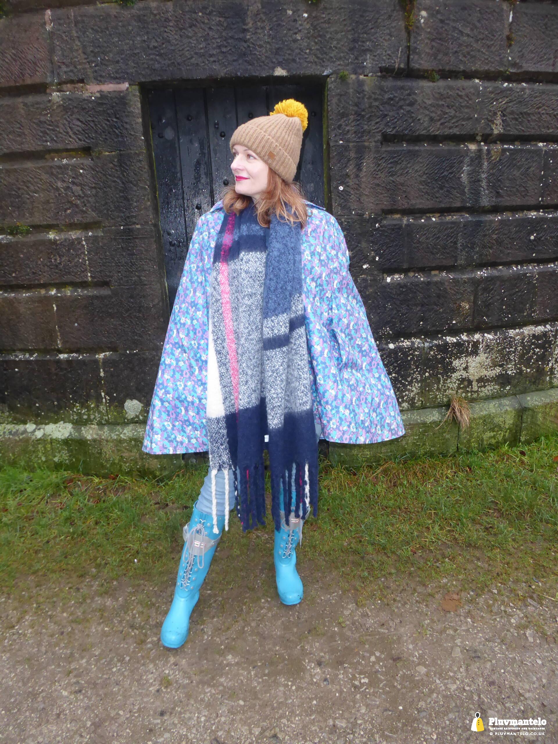 Clair The Cape Queen’s keeping the retro-raincape vibe alive and well, as this shorter floral-print number proves. Again out on a dull day that marked the end of 2023, suddenly we were back to 1973, give or take a couple of years. But unlike some of the single-hue capes The Cape Queen’s been wearing, this time she went the patterned route, with something clearly eye-catching. While the colours are slightly muted the cape received plenty of attention, and rightly so. Fortunately we didn’t encounter any Austin Allegros or beige bell-bottoms: The Cape Queen’s cape showed that there was plenty to like from five decades ago.