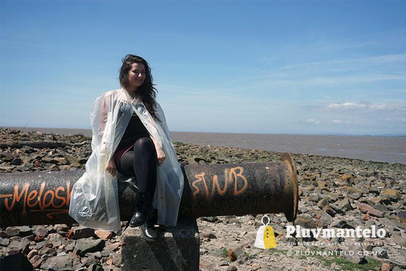 UW began the shoot in a red Bormax cape, moving onto a fine-condition yellow Stormcheetah and then a green Rukka number – always popular in the Finnish company’s mid-green. As the midday sun rose above the Severn Estuary she changed to a no-name long clear plastic cape and a black rubber one which again we don’t know anything about because it has no label. It’s clearly older and, to our eyes at least, probably from the 1960s.
