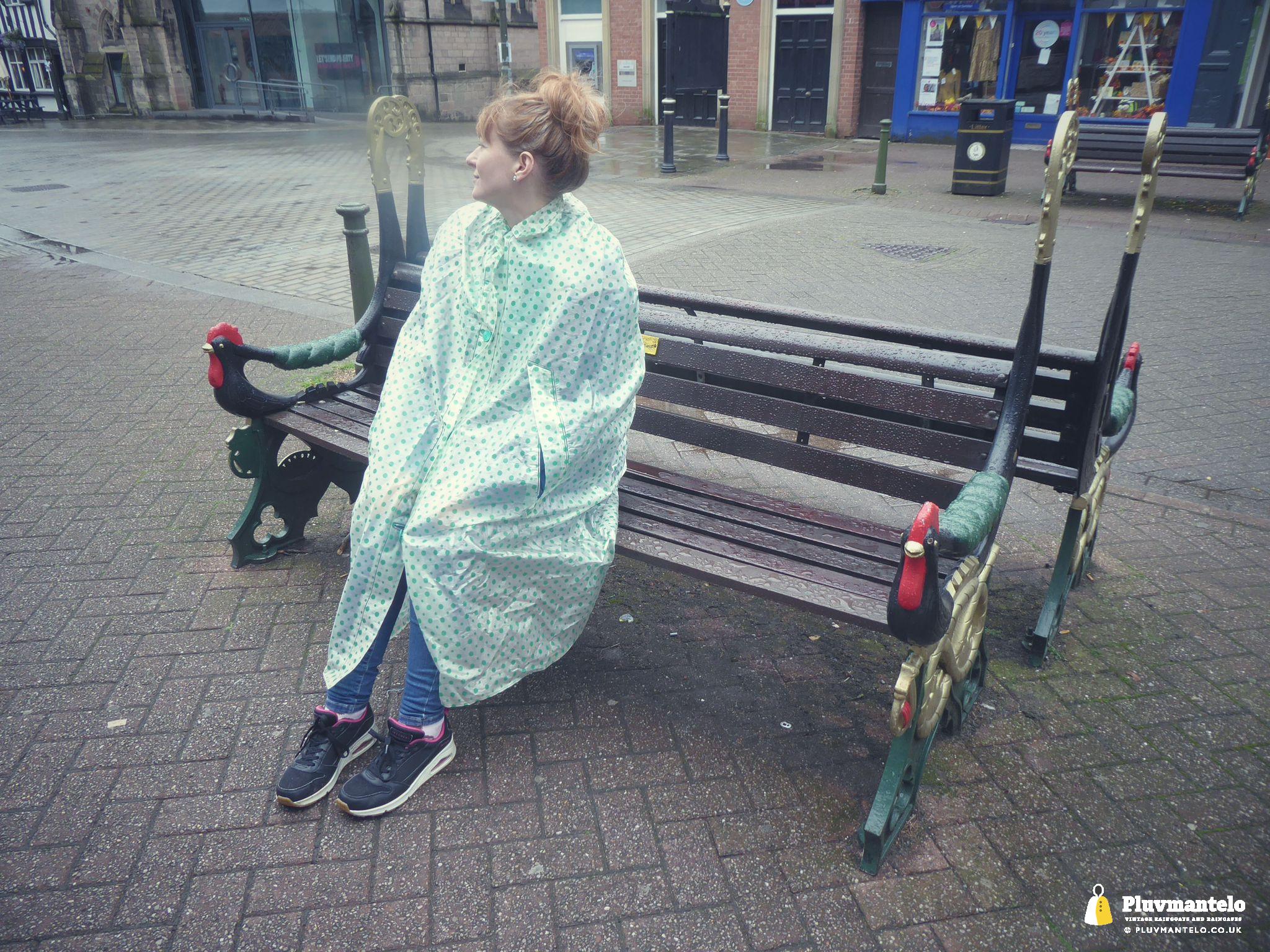 Liebe Clair, ich bewundere dich in deinen Polka-Dot-Regencapes. Am besten gefällt mir das Foto, wo du in dem grüngepunkteten Cape auf der Bank sitzt und das Cape dich so schön umhüllt. Und die Schwarz-Weiß-Fotos der nächsten Serie sind super edel!