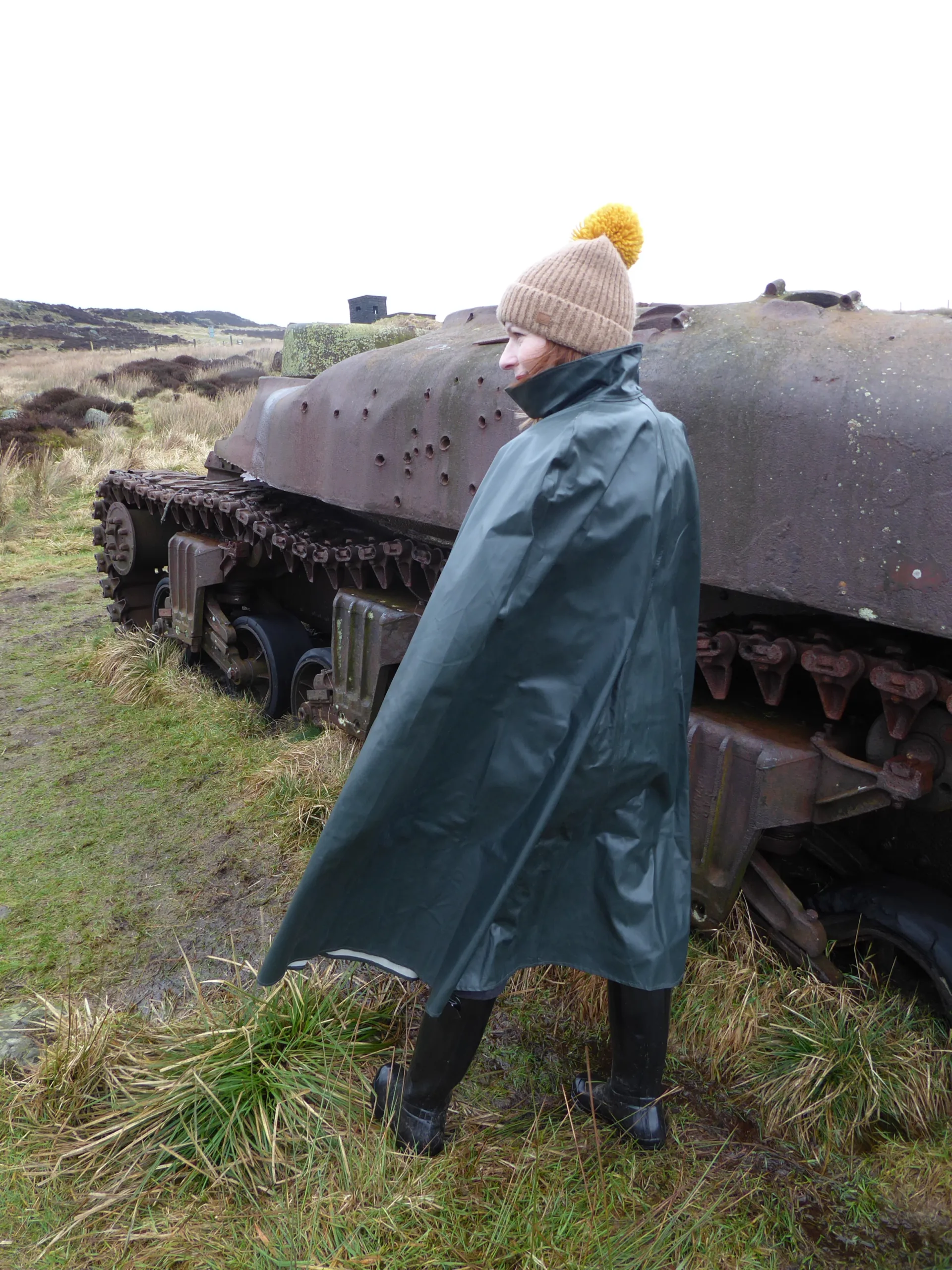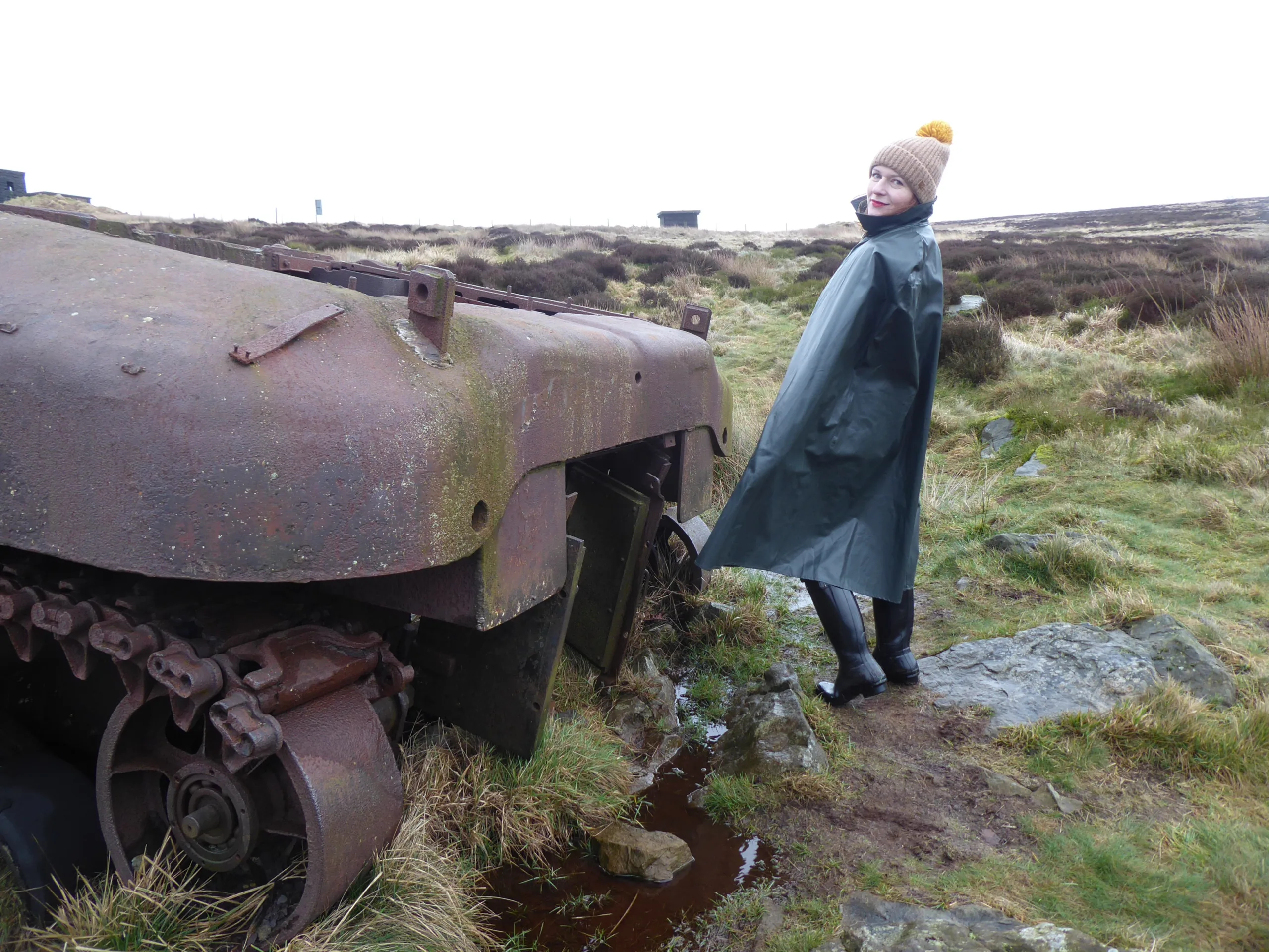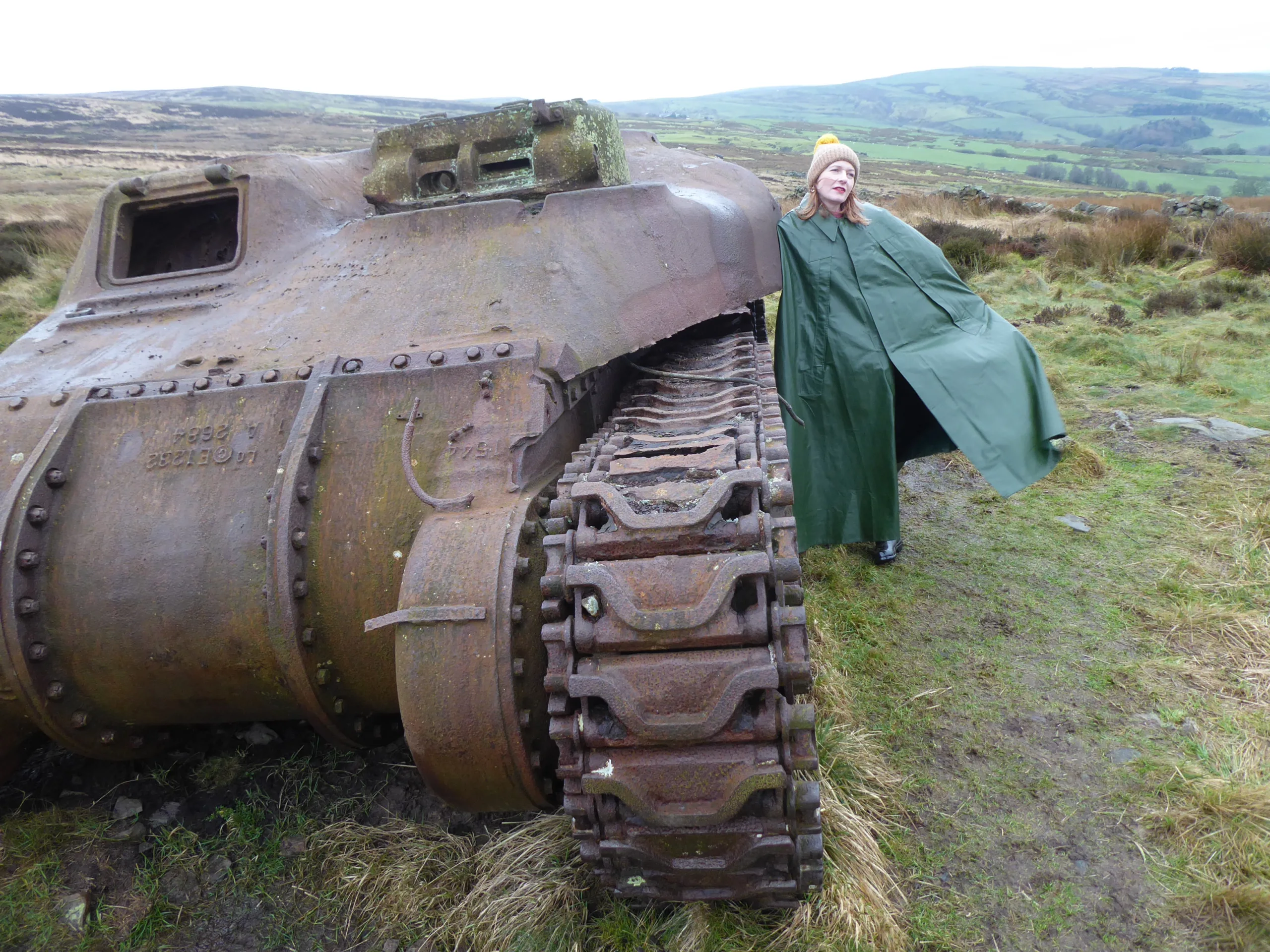 In 1978 The Stranglers released a three-track single, ‘Walk On By’/‘Tank’/‘Old Codger’, the new wave seven-inch peaking at number 21. Whether Clair The Cape Queen was thinking of Surrey’s finest we don’t know, but she showed us the abandoned Sherman tank she’d discovered in the wild moors of Mercia. The voluminous rubber military cape she wore was entirely appropriate, not only because of the tank but also the wild, unforgiving weather she had to put up with. But a large cape such as this one meant The Cape Queen was dry and warm. So… kool and practical and lookin’ good, mixed with some military history: The Cape Queen nailed it.