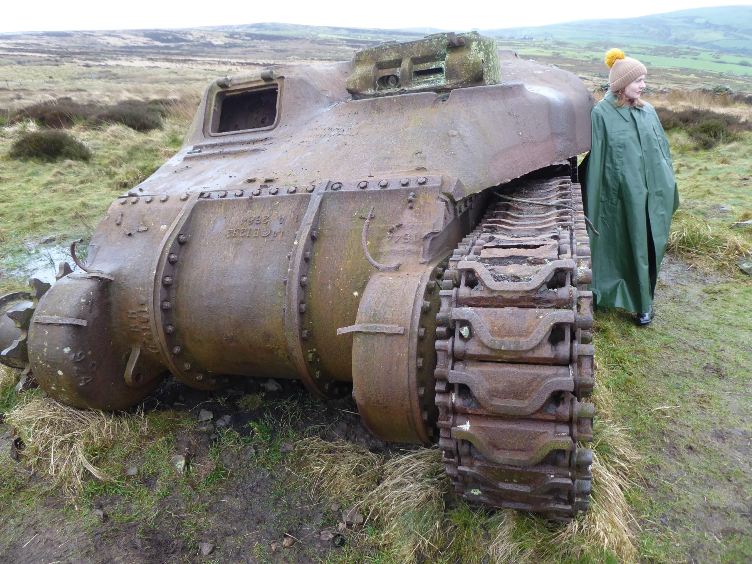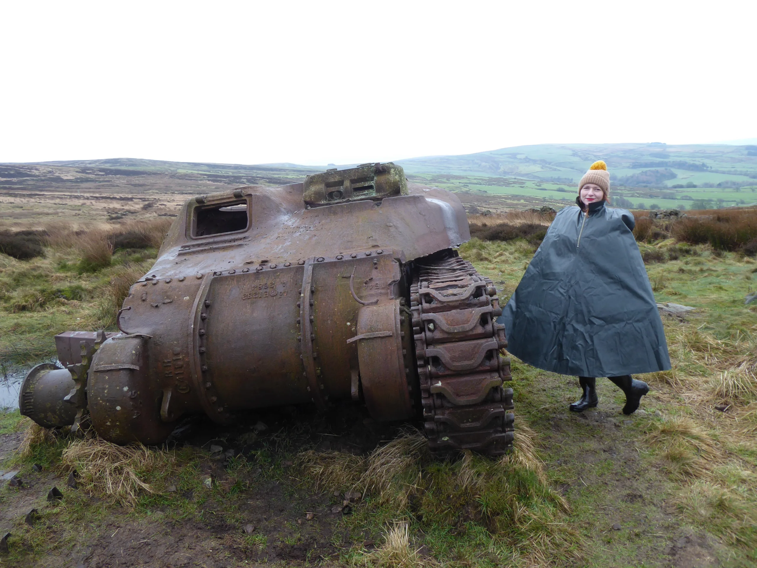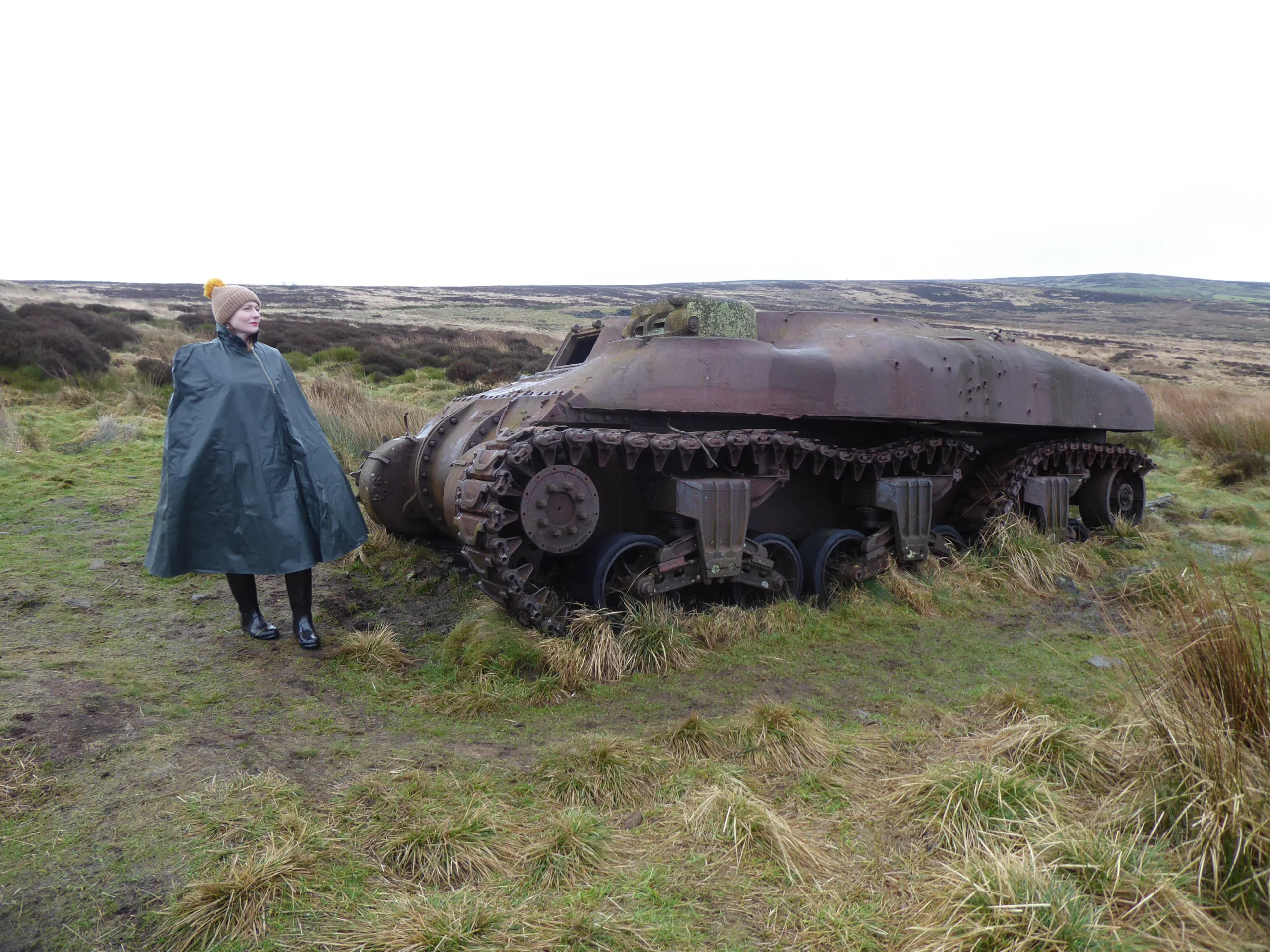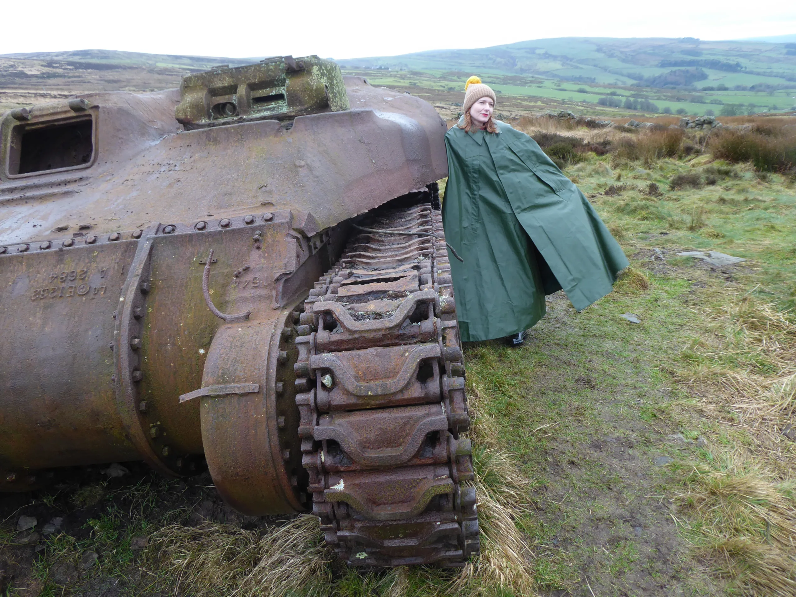 In 1978 The Stranglers released a three-track single, ‘Walk On By’/‘Tank’/‘Old Codger’, the new wave seven-inch peaking at number 21. Whether Clair The Cape Queen was thinking of Surrey’s finest we don’t know, but she showed us the abandoned Sherman tank she’d discovered in the wild moors of Mercia. The voluminous rubber military cape she wore was entirely appropriate, not only because of the tank but also the wild, unforgiving weather she had to put up with. But a large cape such as this one meant The Cape Queen was dry and warm. So… kool and practical and lookin’ good, mixed with some military history: The Cape Queen nailed it.