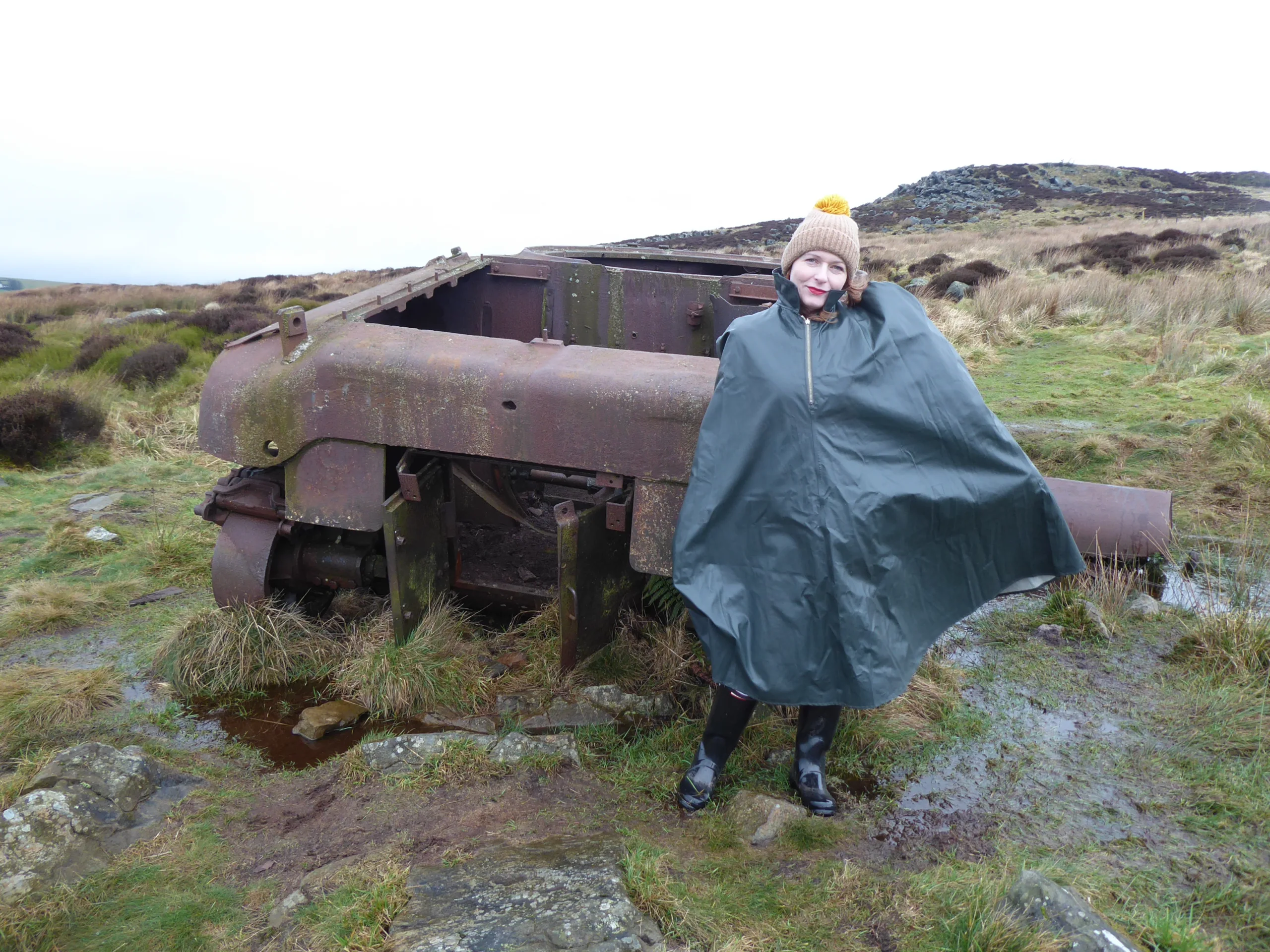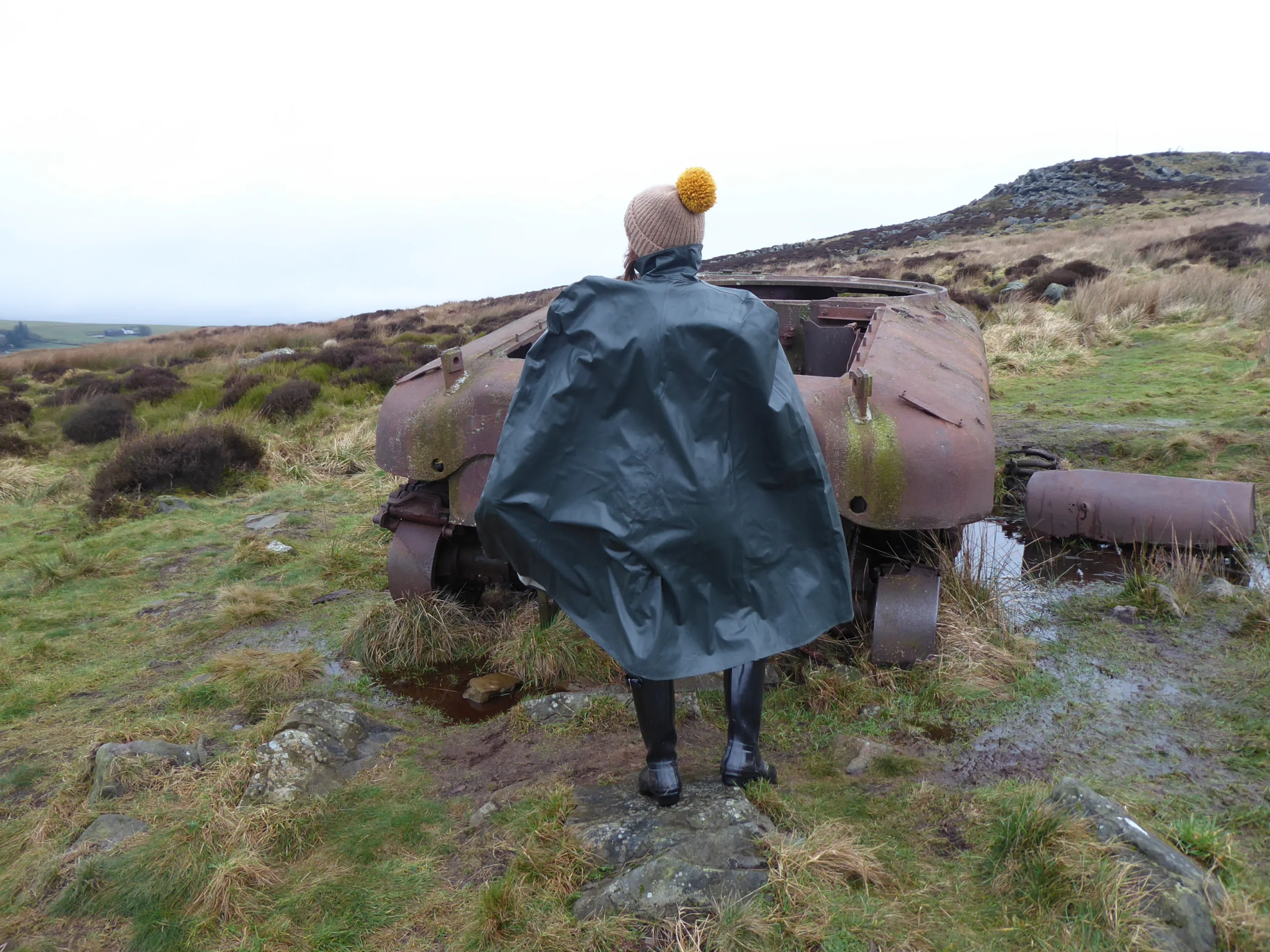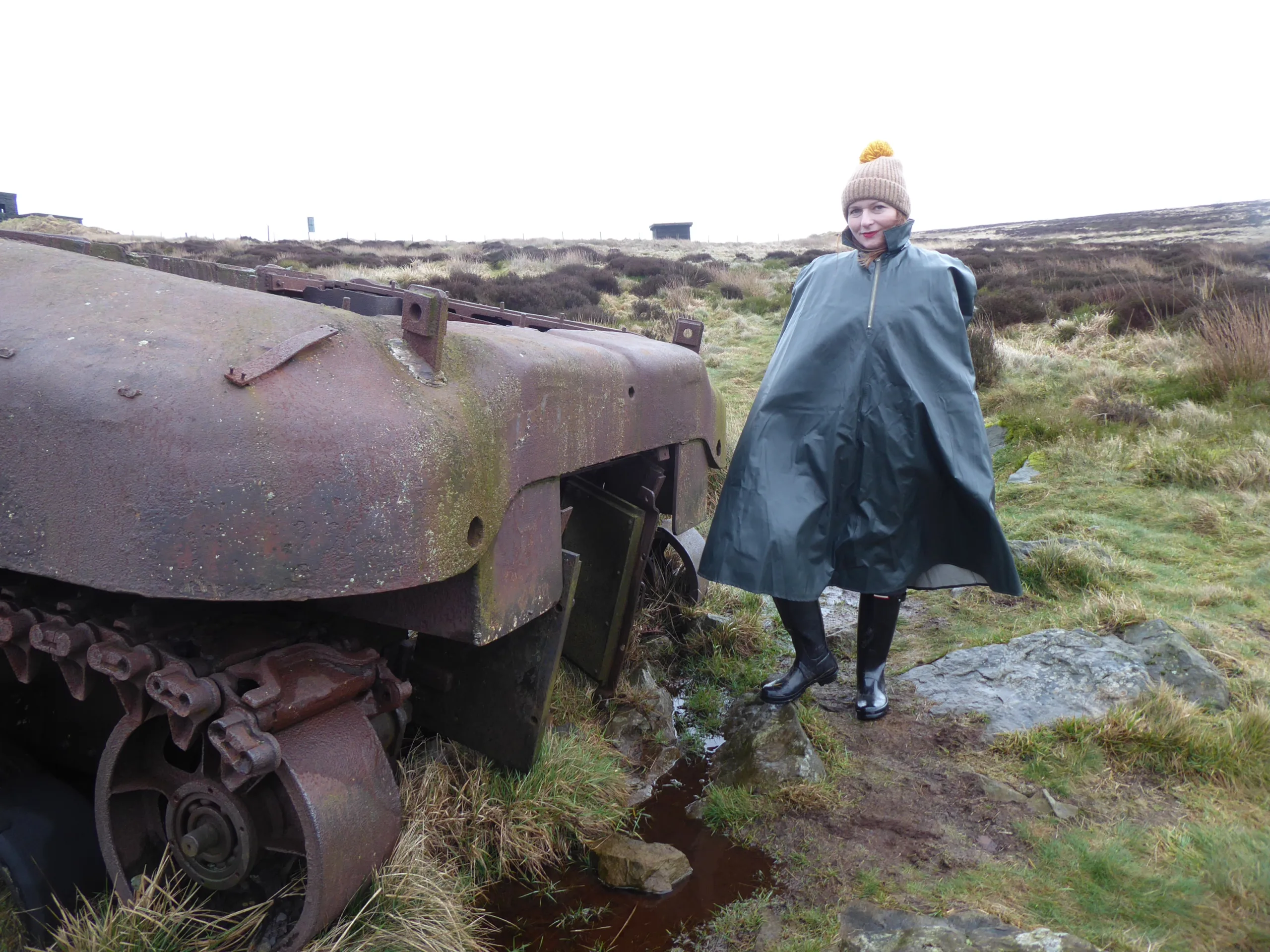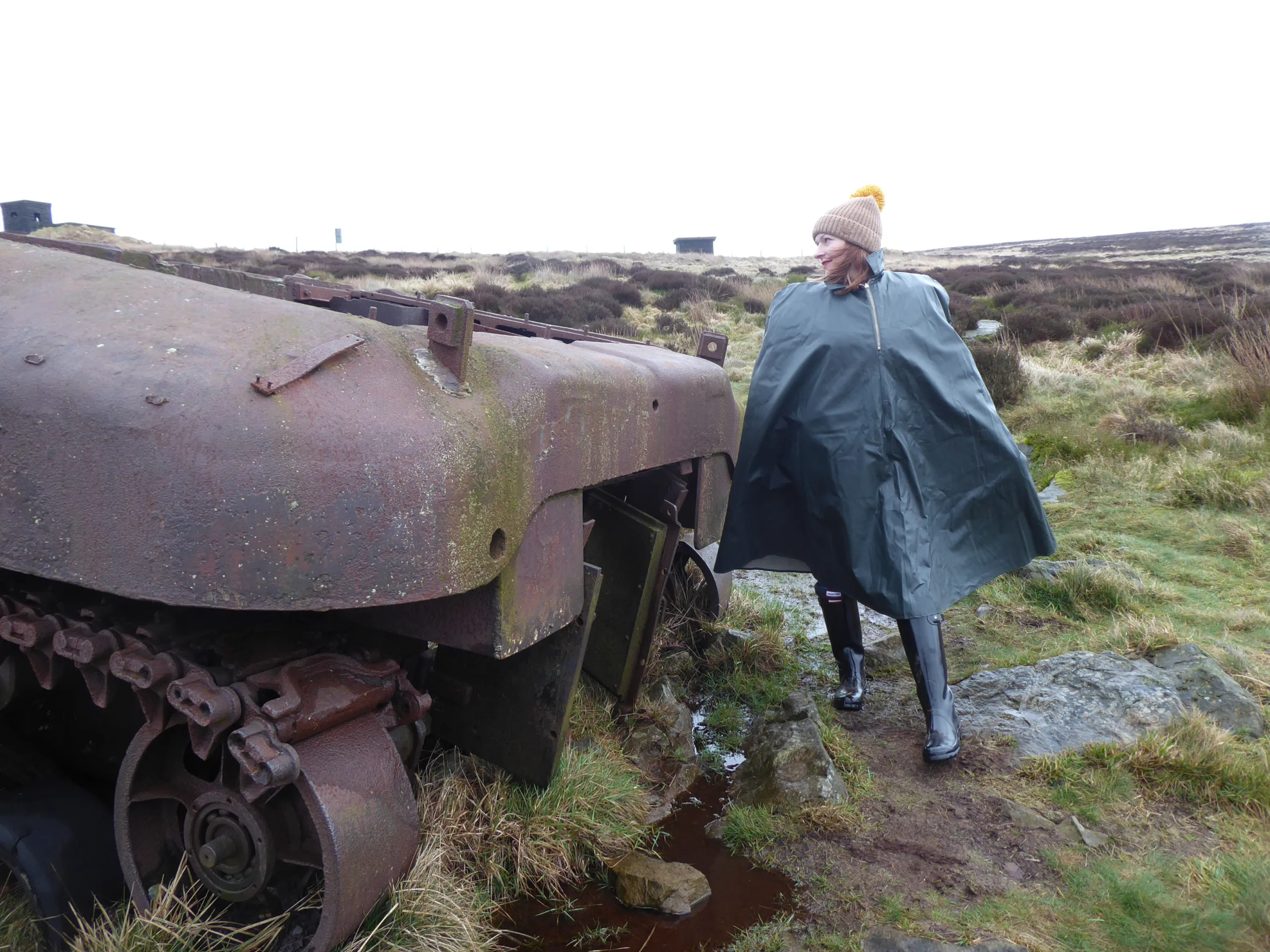 In 1978 The Stranglers released a three-track single, ‘Walk On By’/‘Tank’/‘Old Codger’, the new wave seven-inch peaking at number 21. Whether Clair The Cape Queen was thinking of Surrey’s finest we don’t know, but she showed us the abandoned Sherman tank she’d discovered in the wild moors of Mercia. The voluminous rubber military cape she wore was entirely appropriate, not only because of the tank but also the wild, unforgiving weather she had to put up with. But a large cape such as this one meant The Cape Queen was dry and warm. So… kool and practical and lookin’ good, mixed with some military history: The Cape Queen nailed it.