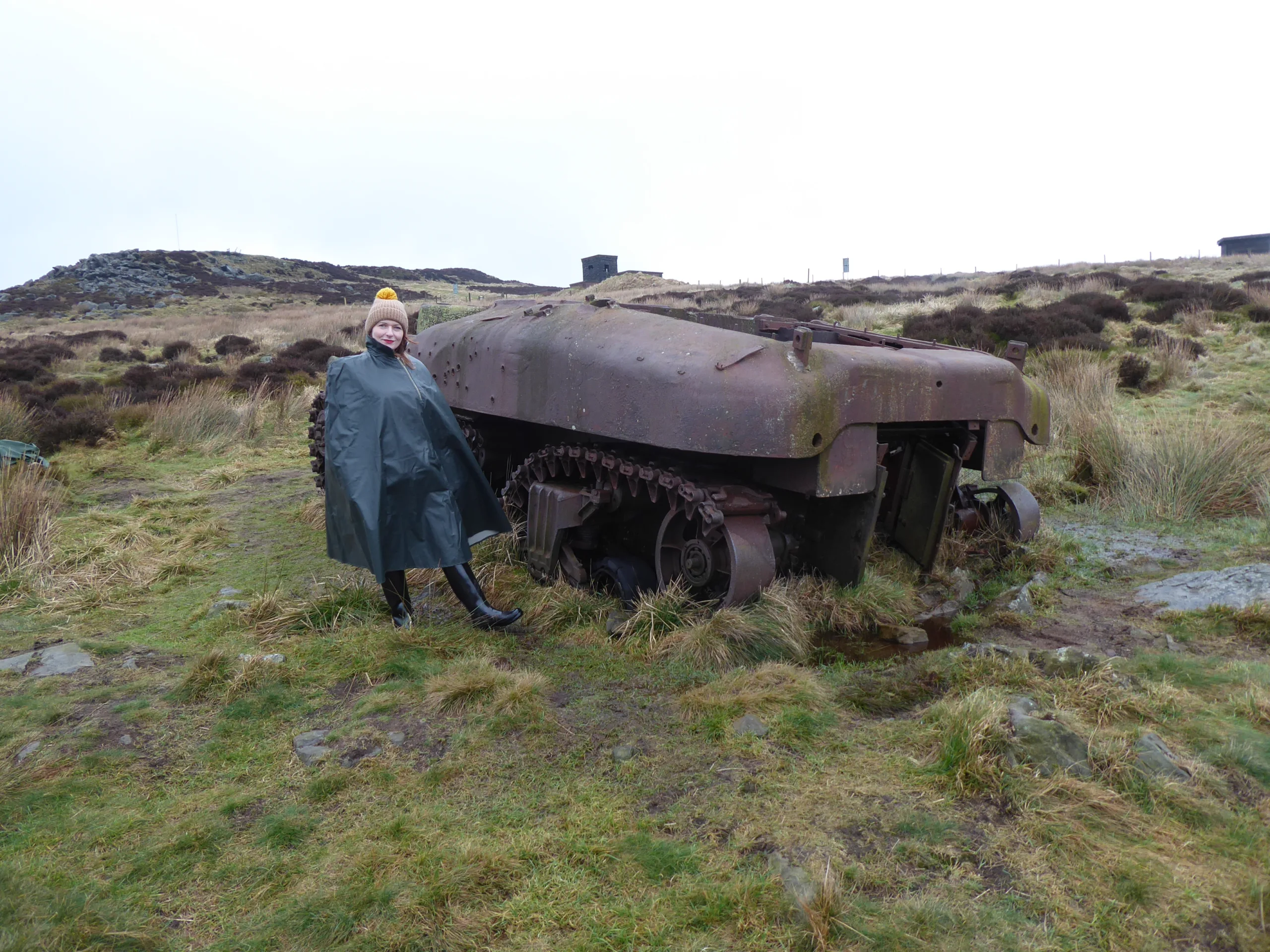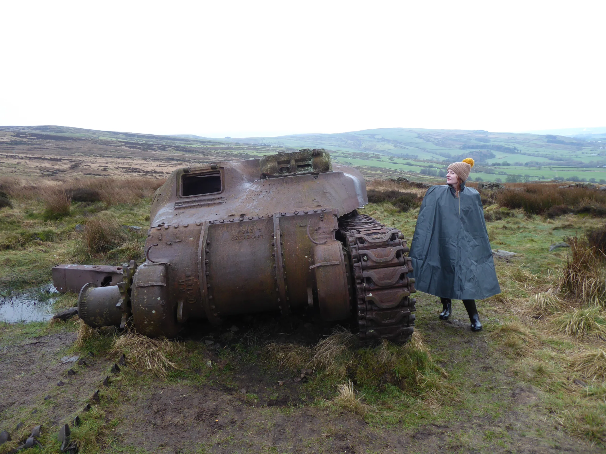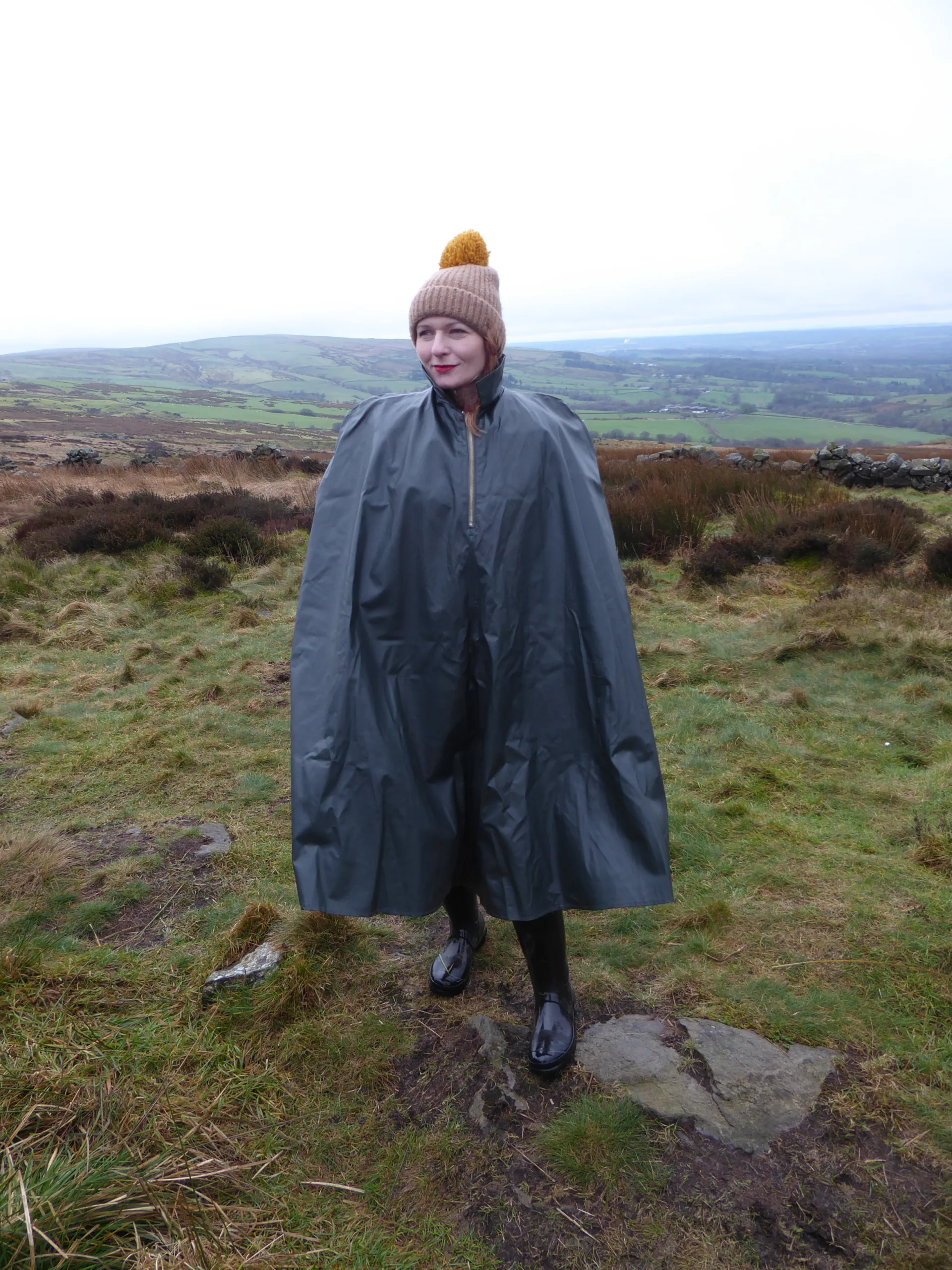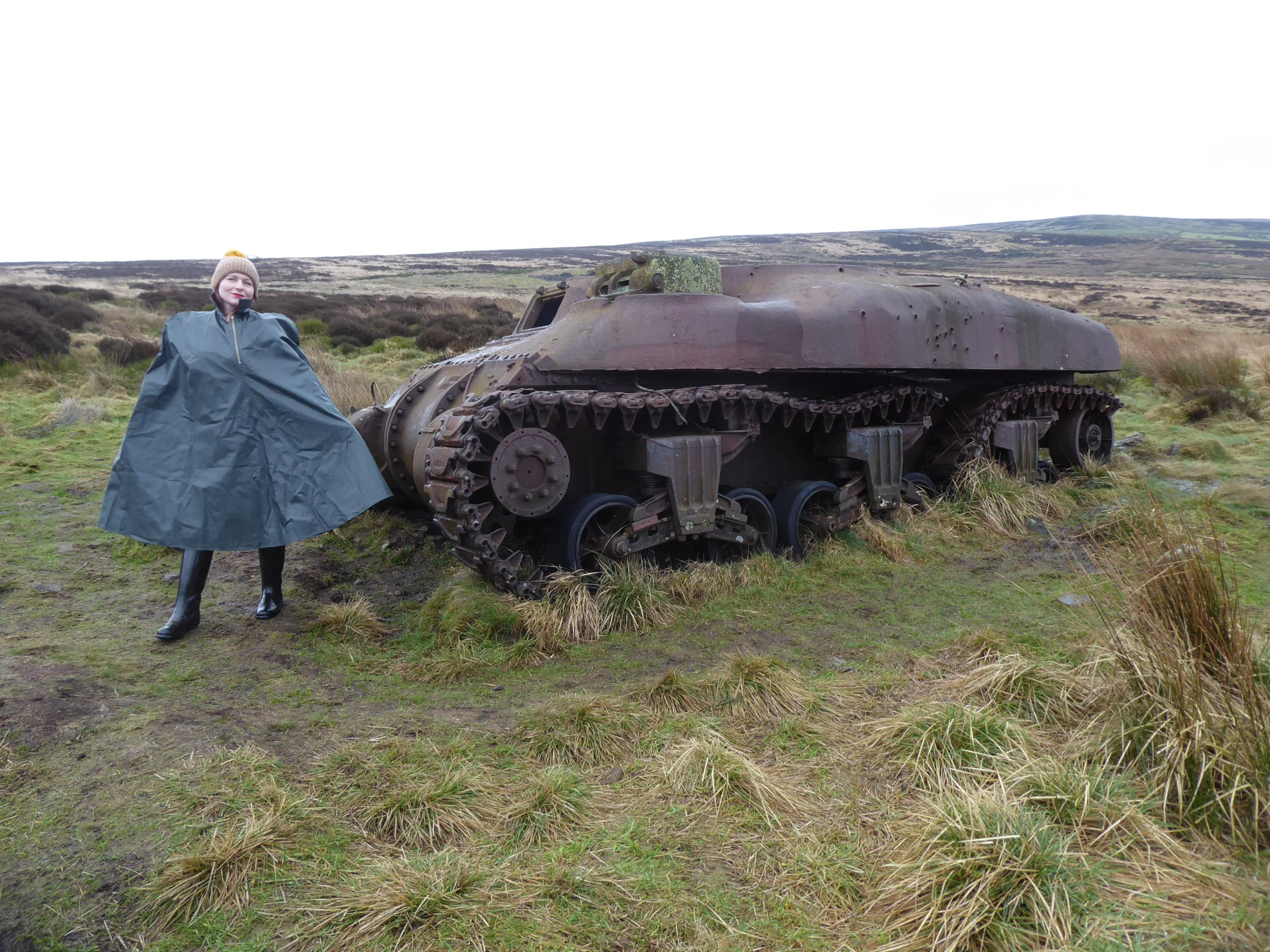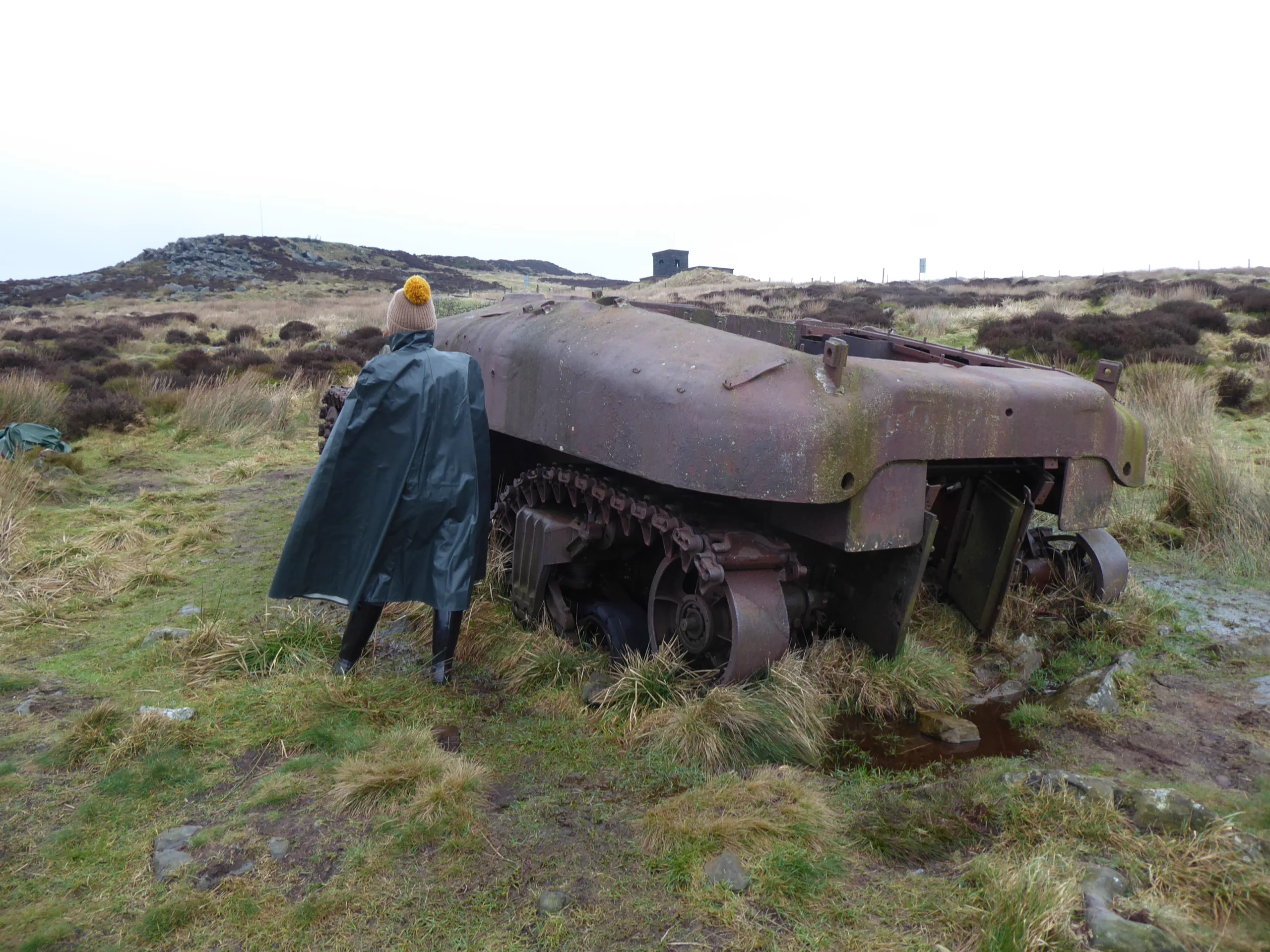 In 1978 The Stranglers released a three-track single, ‘Walk On By’/‘Tank’/‘Old Codger’, the new wave seven-inch peaking at number 21. Whether Clair The Cape Queen was thinking of Surrey’s finest we don’t know, but she showed us the abandoned Sherman tank she’d discovered in the wild moors of Mercia. The voluminous rubber military cape she wore was entirely appropriate, not only because of the tank but also the wild, unforgiving weather she had to put up with. But a large cape such as this one meant The Cape Queen was dry and warm. So… kool and practical and lookin’ good, mixed with some military history: The Cape Queen nailed it.