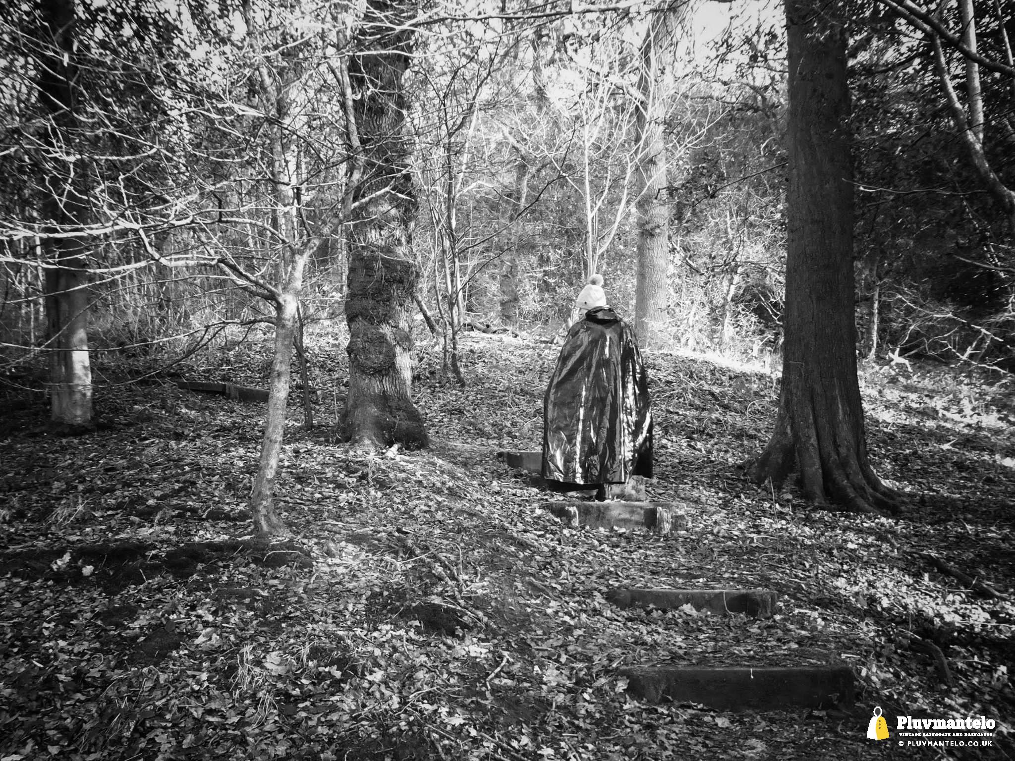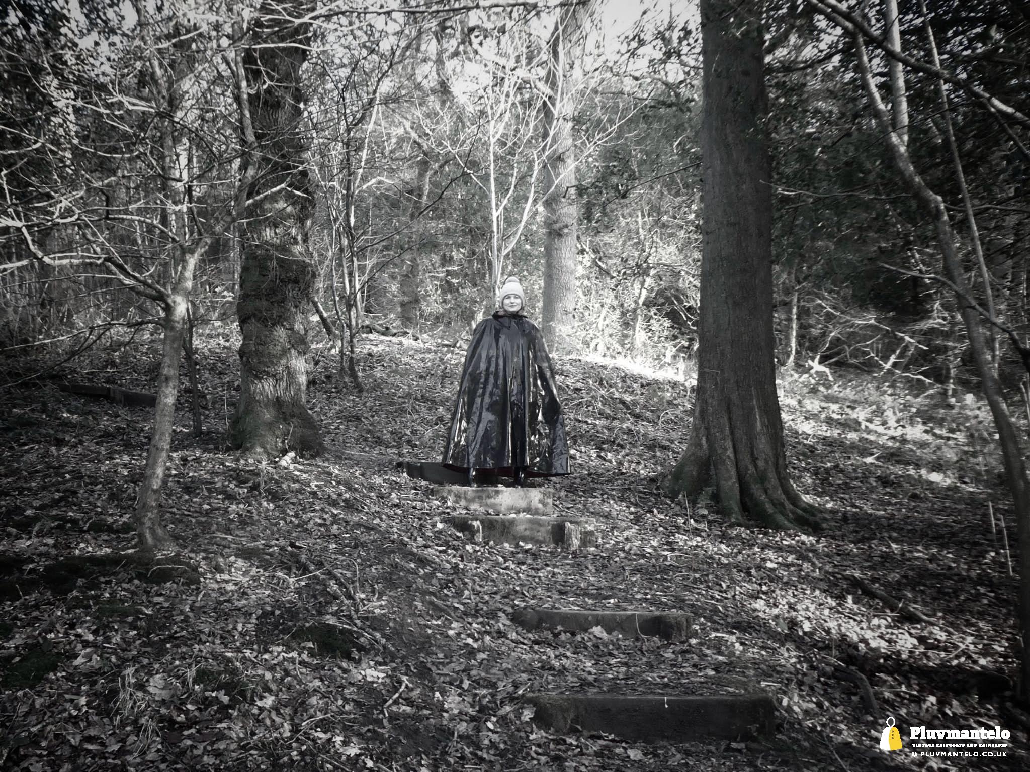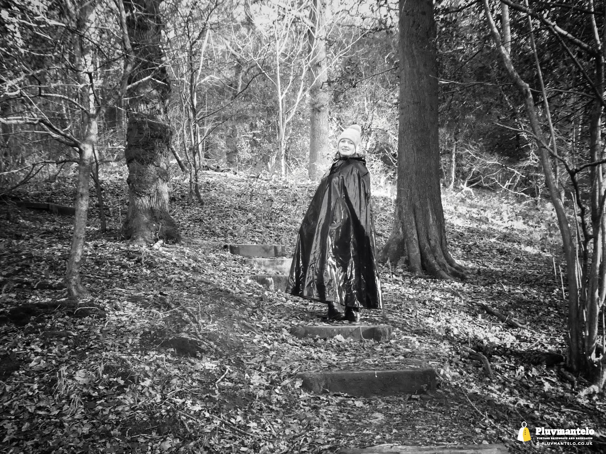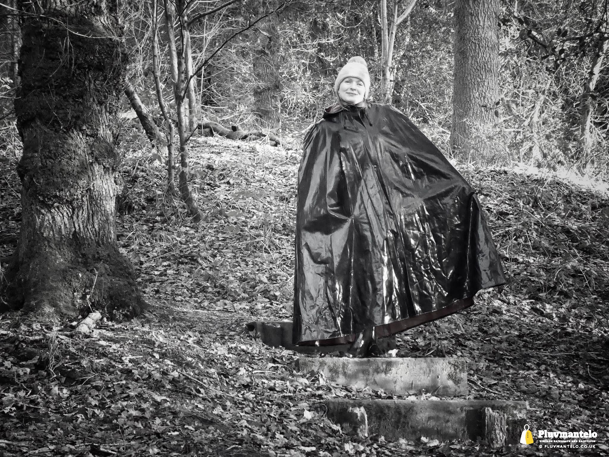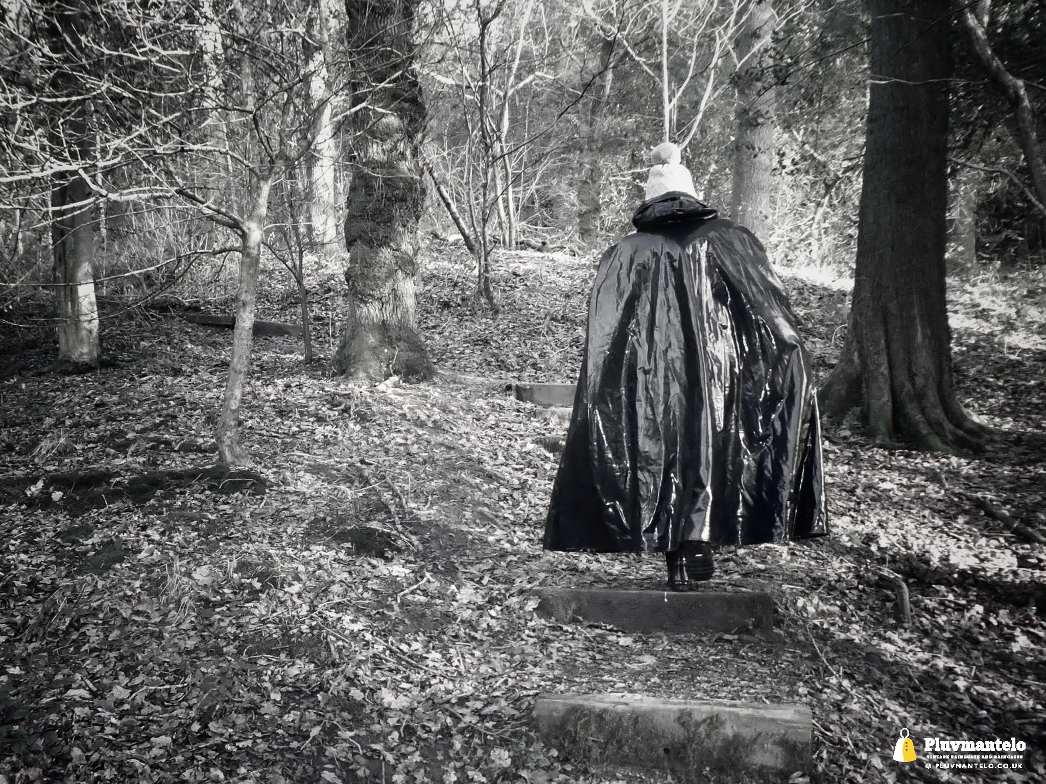 Clair the Cape Queen has once again been working her magic with this series of images, which she terms ‘vintage black and white’. We think it’s properly vintage noir, the somewhat spectral air having a depth that’s 1960s reminiscent. The shine on the cape simply stands out in a way that colour cannot reproduce. Maybe it has the air of lost, unreleased French or German album cover – or are the Pluvmantelo minds working overtime?