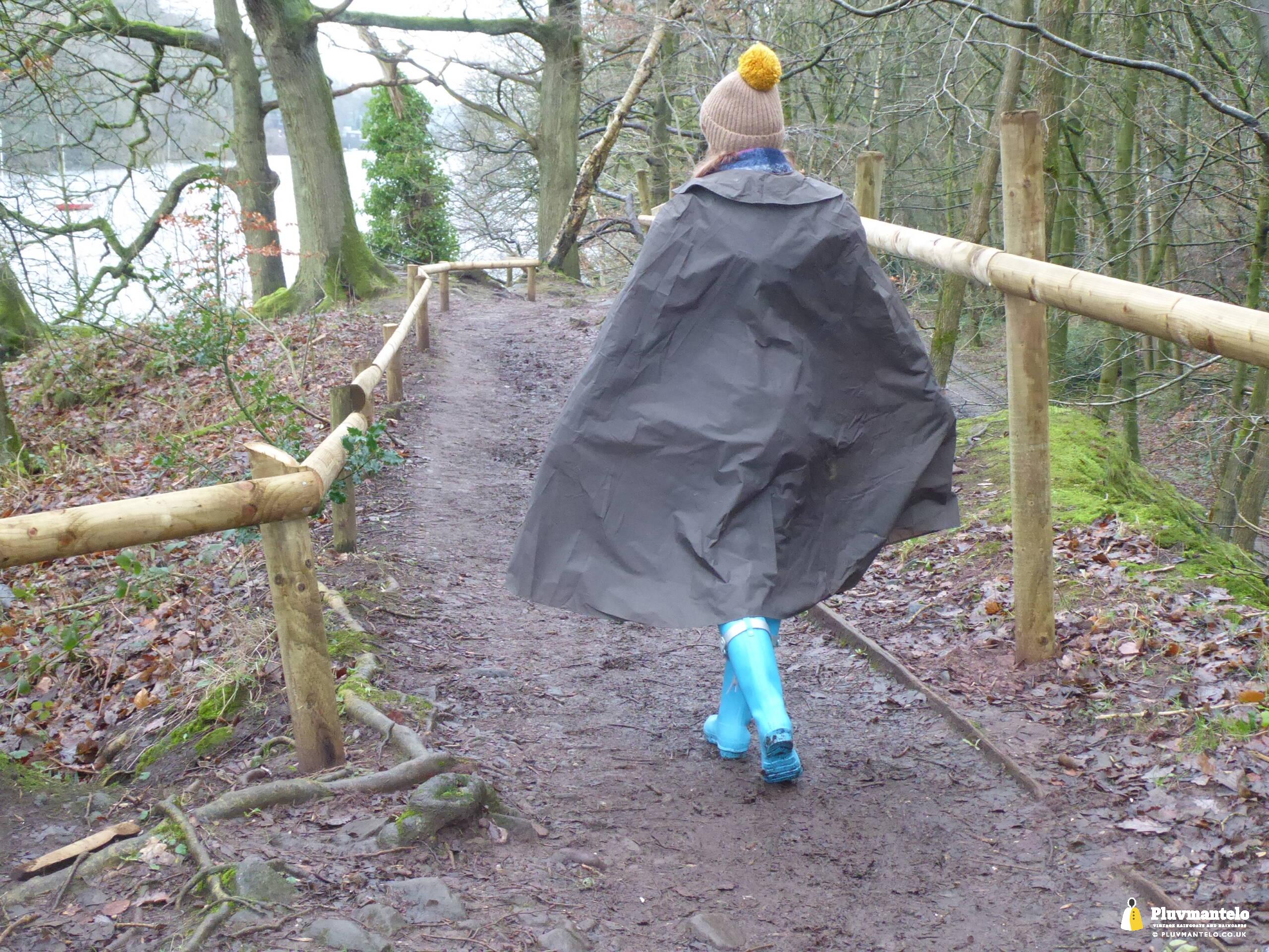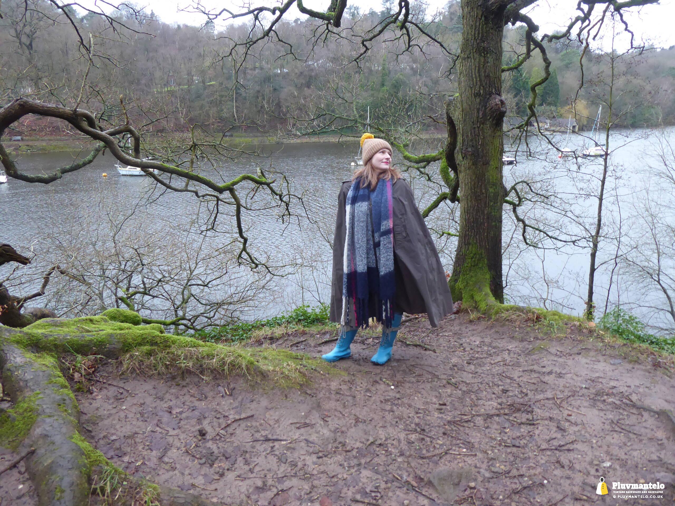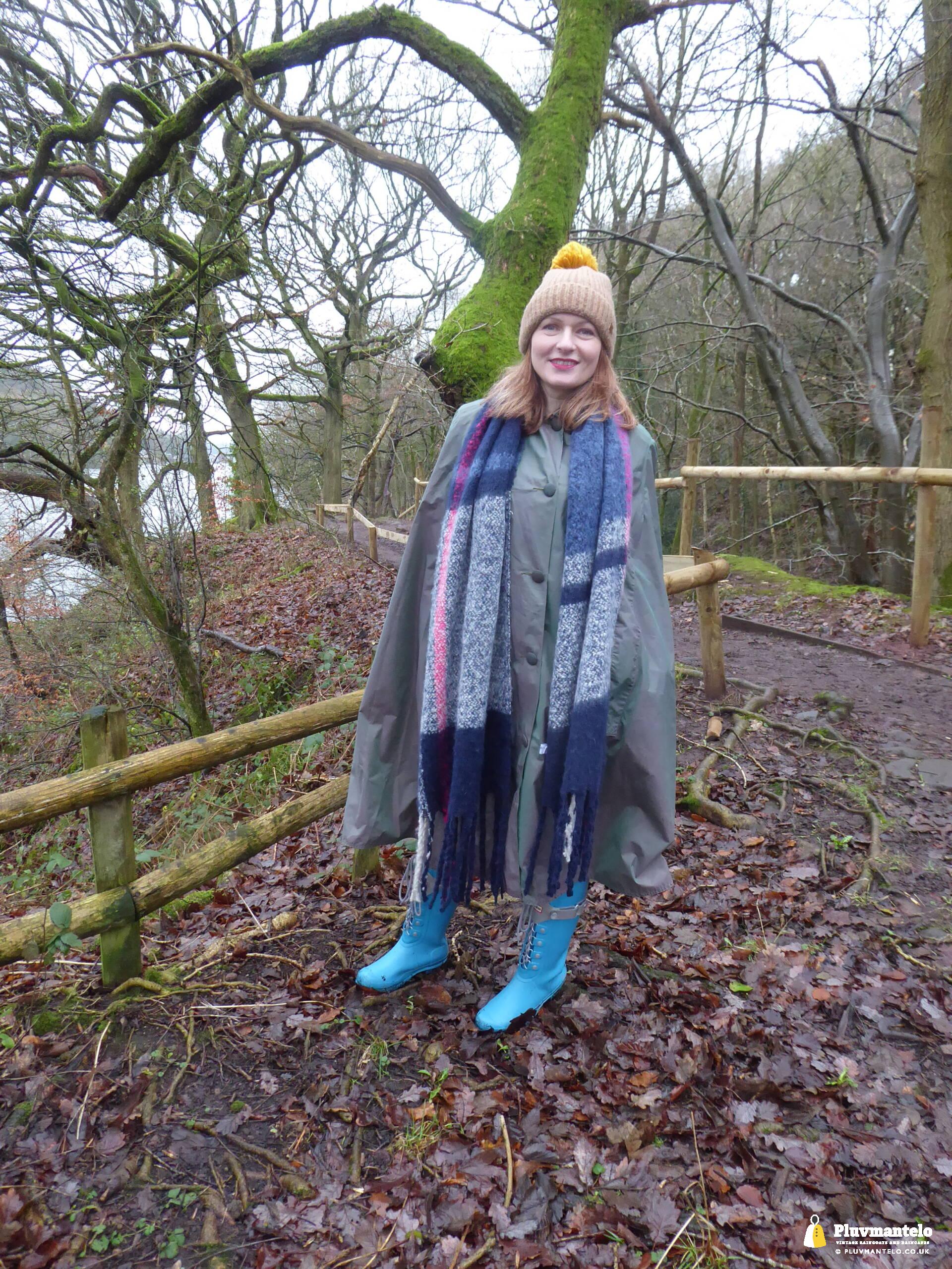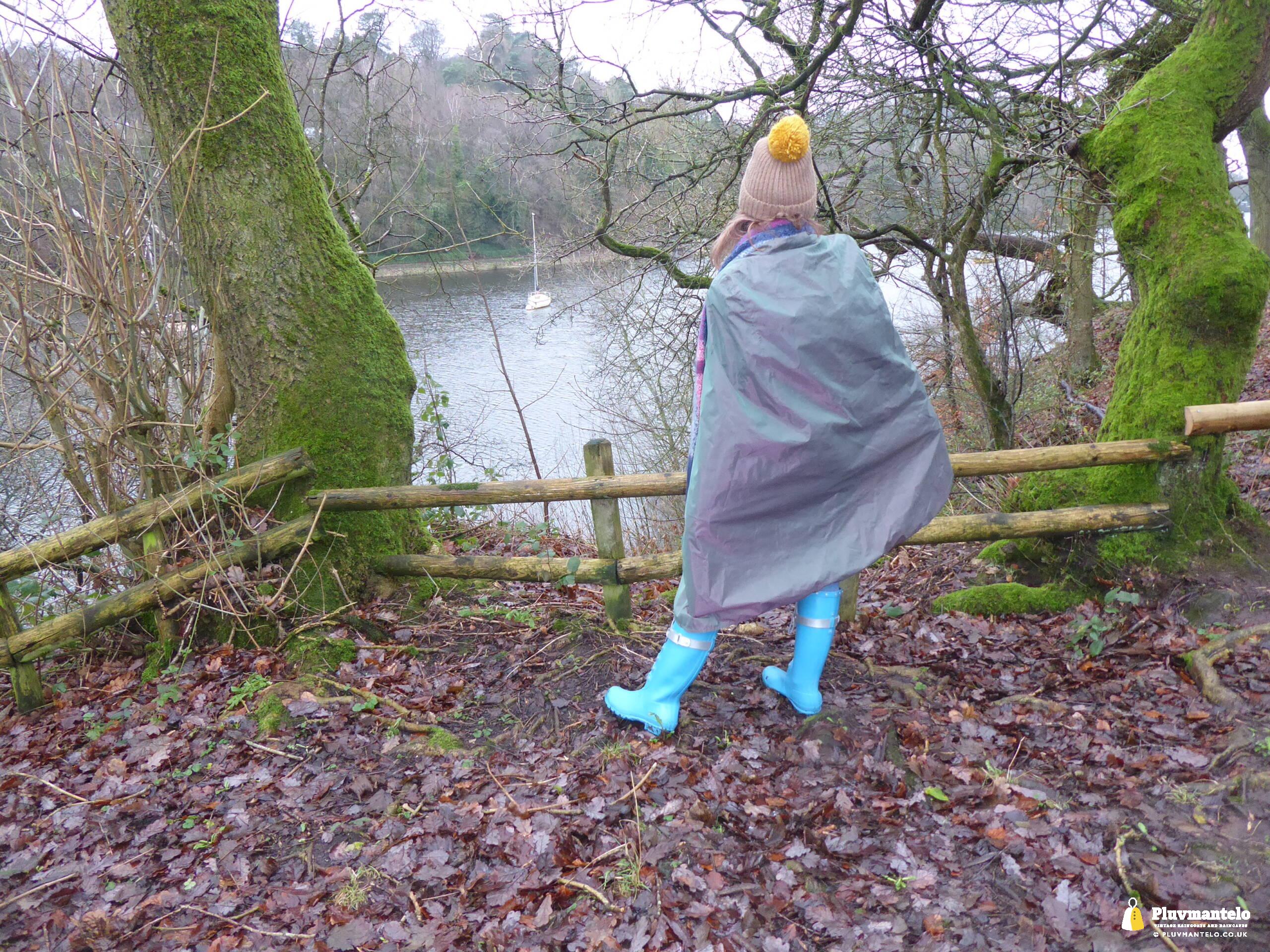 Happy New Year from Pluvmantelo and The Cape Queen gets the new year’s posts off with her 1960s ‘tonic’ cape. Like the suits worn by mods and suede ‘eads in the mid-1960s, Clair’s cape has a two-tone colourway, changing from green to mauve as it catches the light. And even on a seriously dull winter day near a lake deep in Mercia Clair’s cape added some much-needed cheerfulness.
