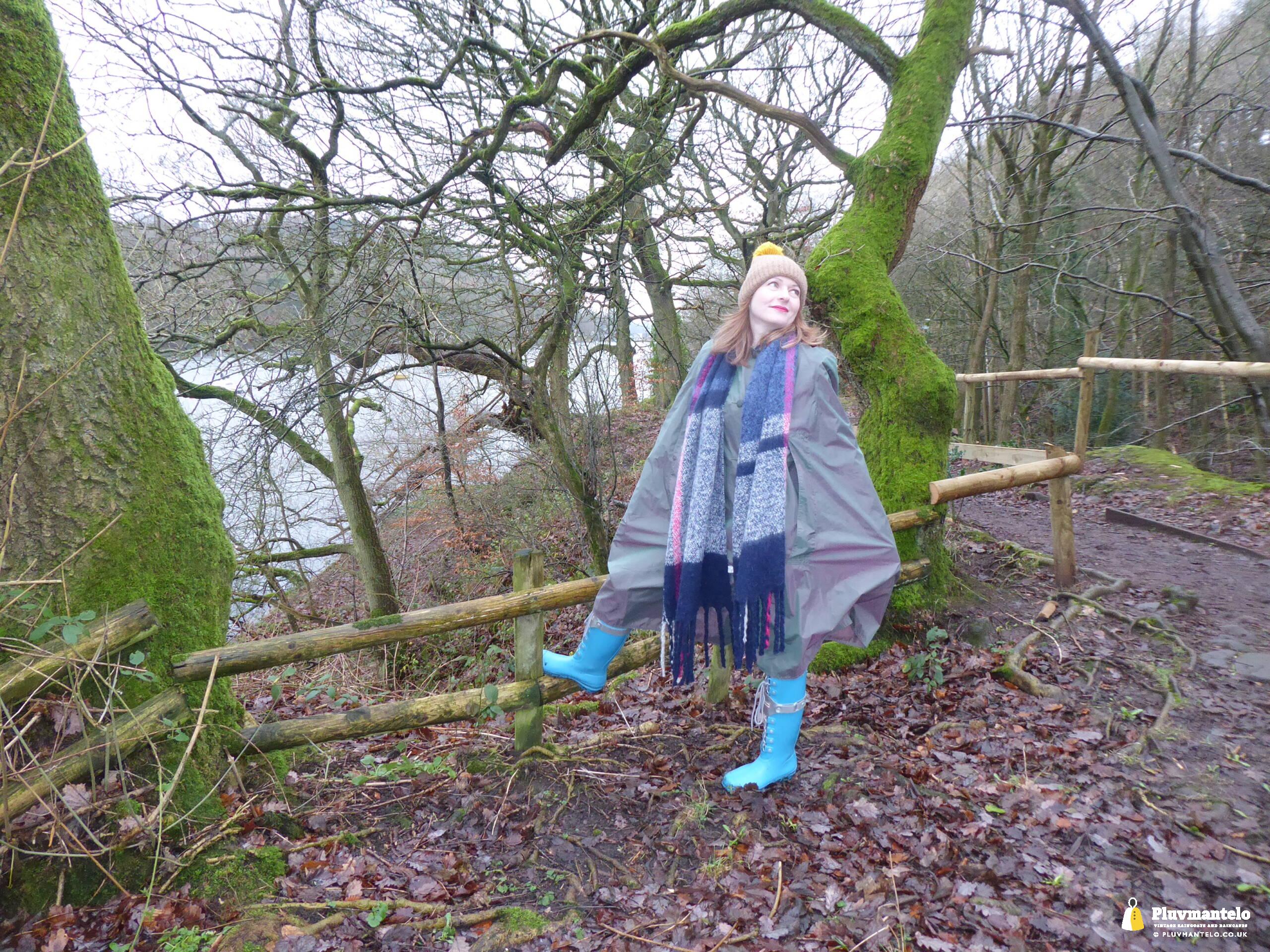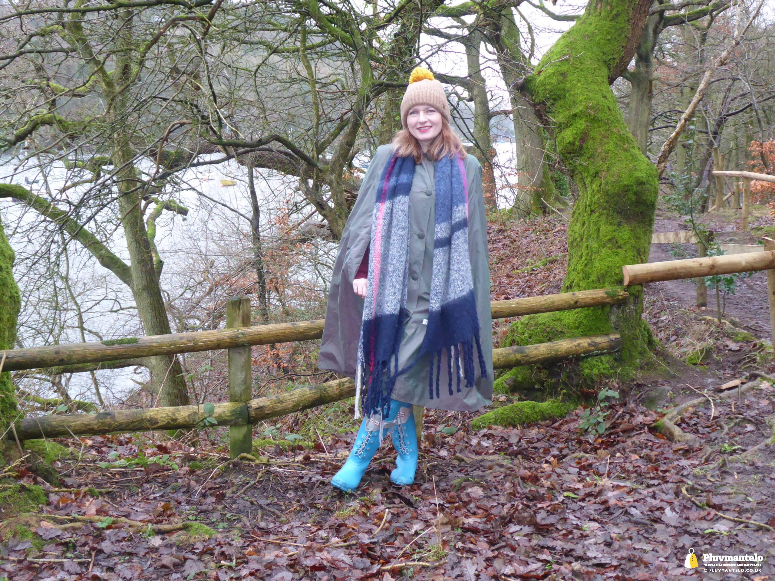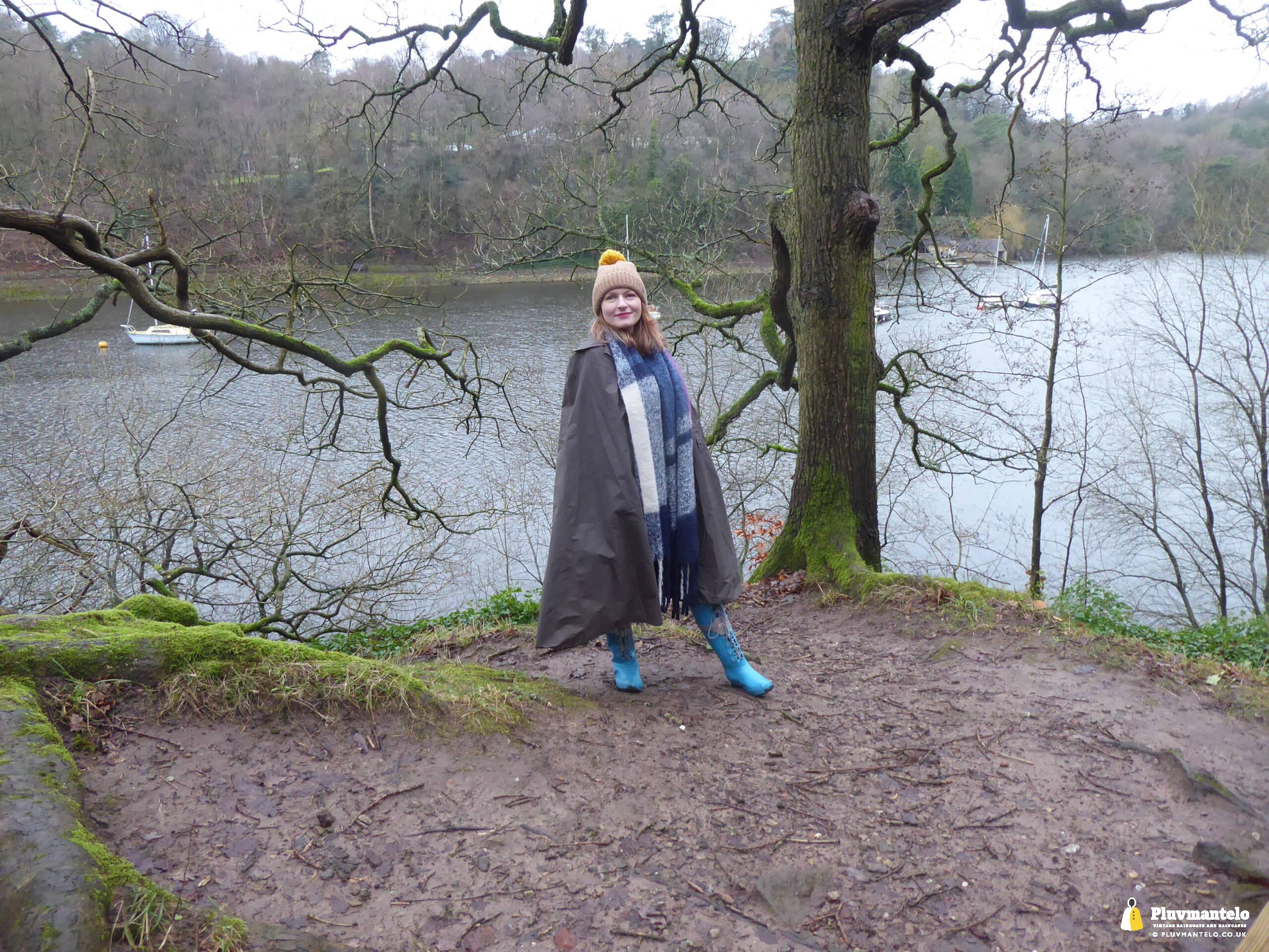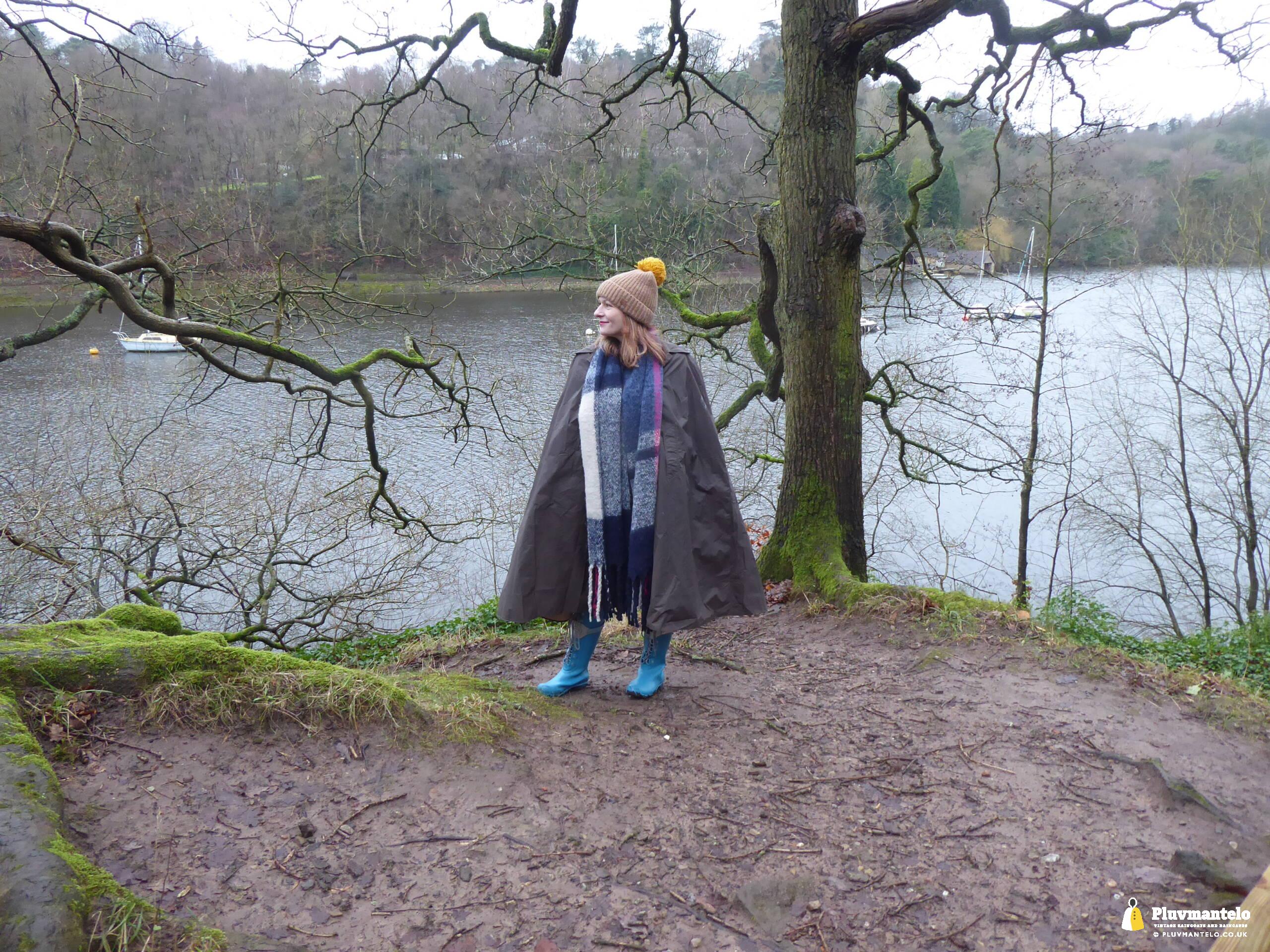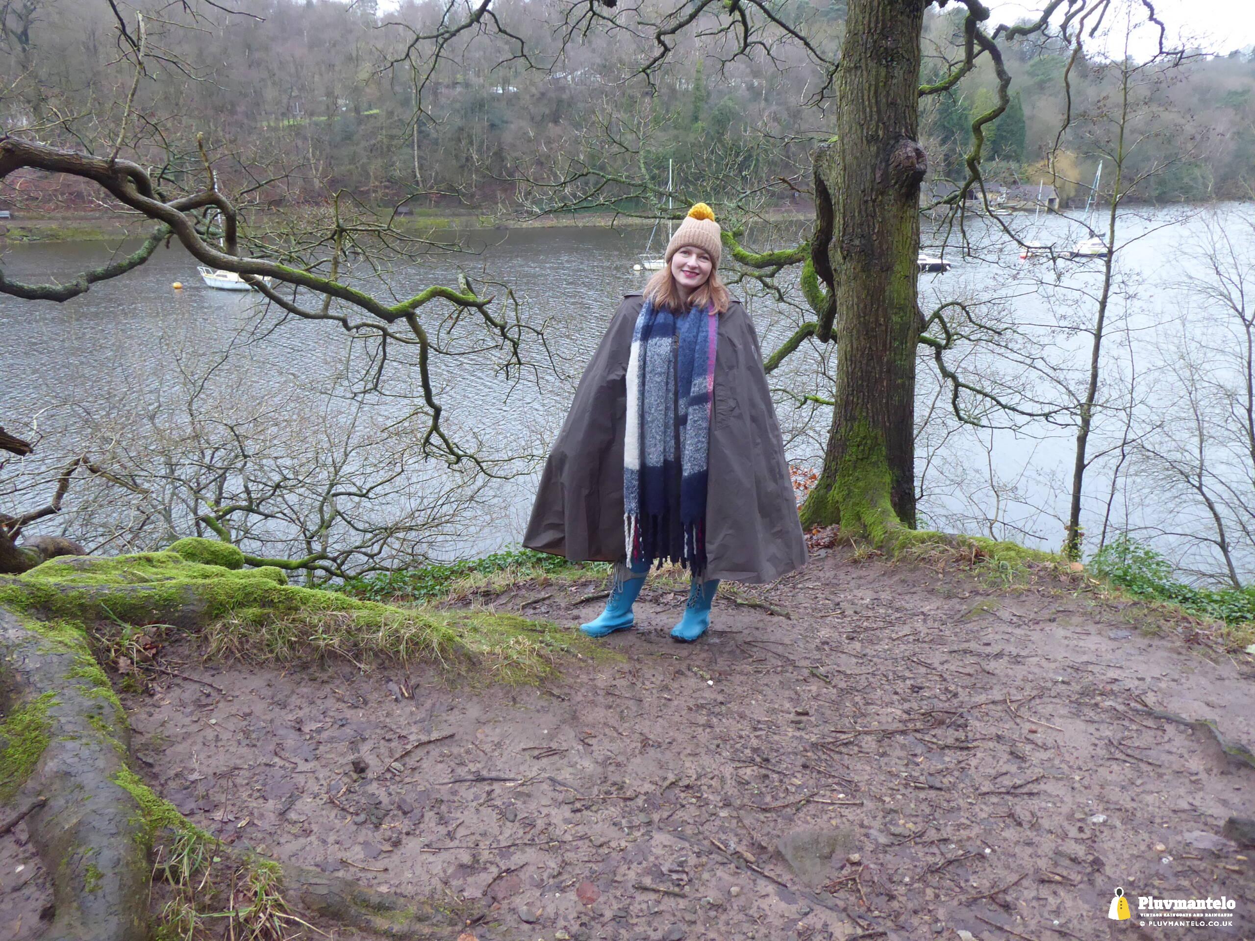 Happy New Year from Pluvmantelo and The Cape Queen gets the new year’s posts off with her 1960s ‘tonic’ cape. Like the suits worn by mods and suede ‘eads in the mid-1960s, Clair’s cape has a two-tone colourway, changing from green to mauve as it catches the light. And even on a seriously dull winter day near a lake deep in Mercia Clair’s cape added some much-needed cheerfulness.